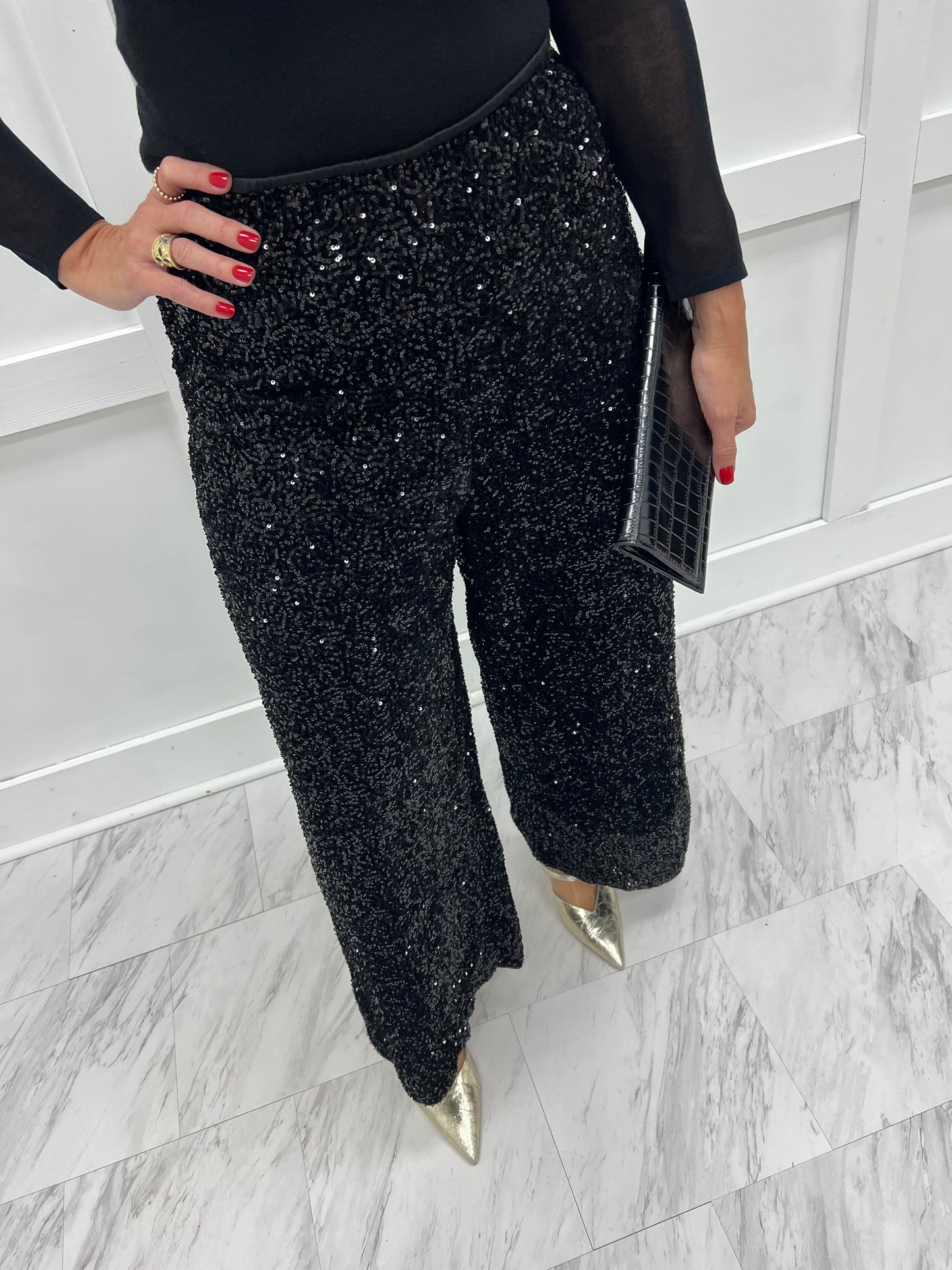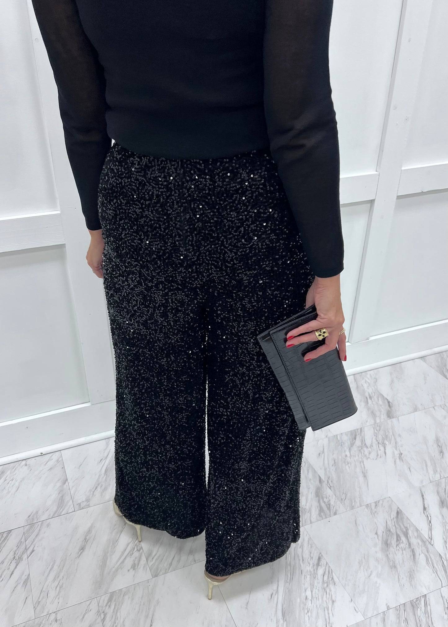 Take your glam game to the next level with our Temptation Pants... this style is super cute and super comfy! Black colored sequin fabric shapes these pants featuring an elastic waistband with back zipper and wide legs. This style is lined. Such a fun update to black pants... these can be styled so many ways! Model is 5'8'' and wearing a size small.