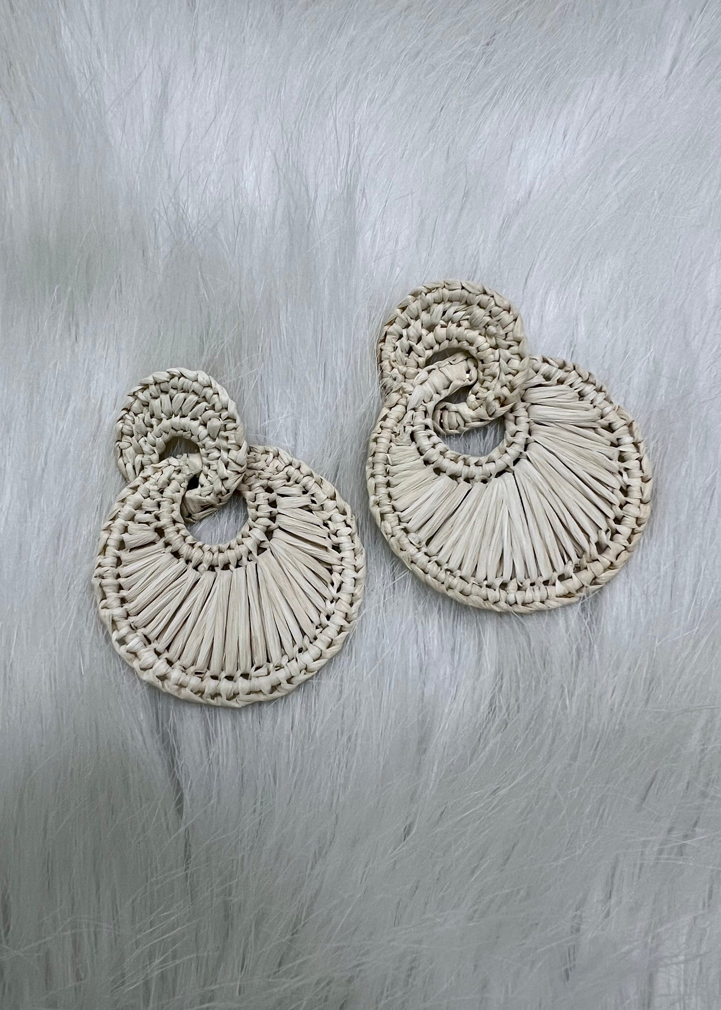 Wardrobe essential, this pair is sure to compliment your warm weather looks! A natural colored earring made of raffia interlocking circles. This style is very lightweight with a post back closure. So chic, you will be reaching for these all of the time!
