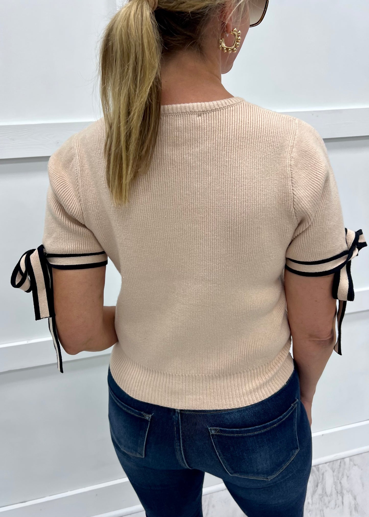 Elevate your look when you wear this darling little sweater with the sweetest details. Classic beige colored, medium weight sweater knit shapes this style featuring a round neckline, short sleeves with black stripes and a darling self tie bow detail. This sweater has a relaxed fit with banded waistline. We love this classic style and can't wait to style it with everything from trousers to denim. Model is 5'8'' and wearing a size small.