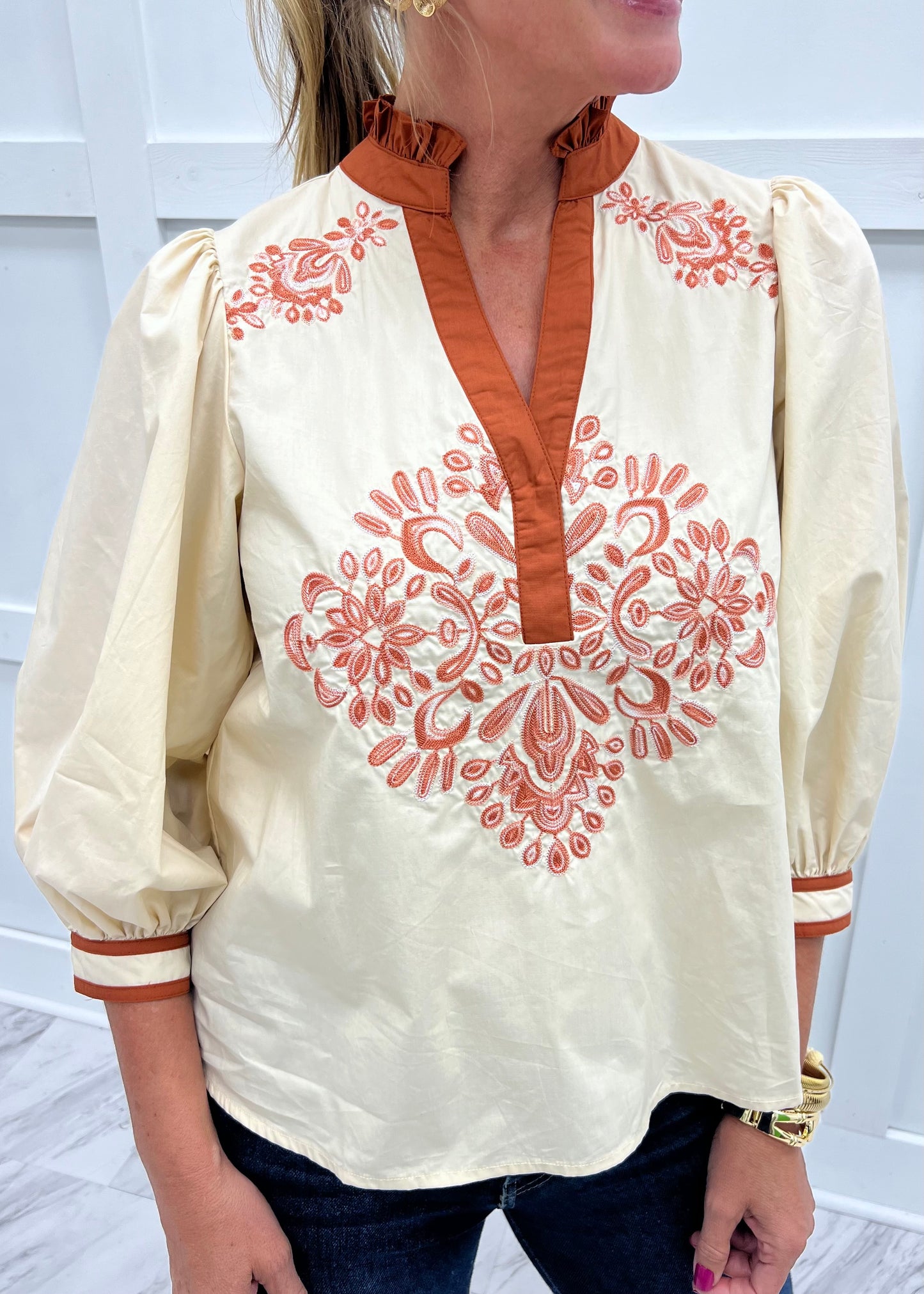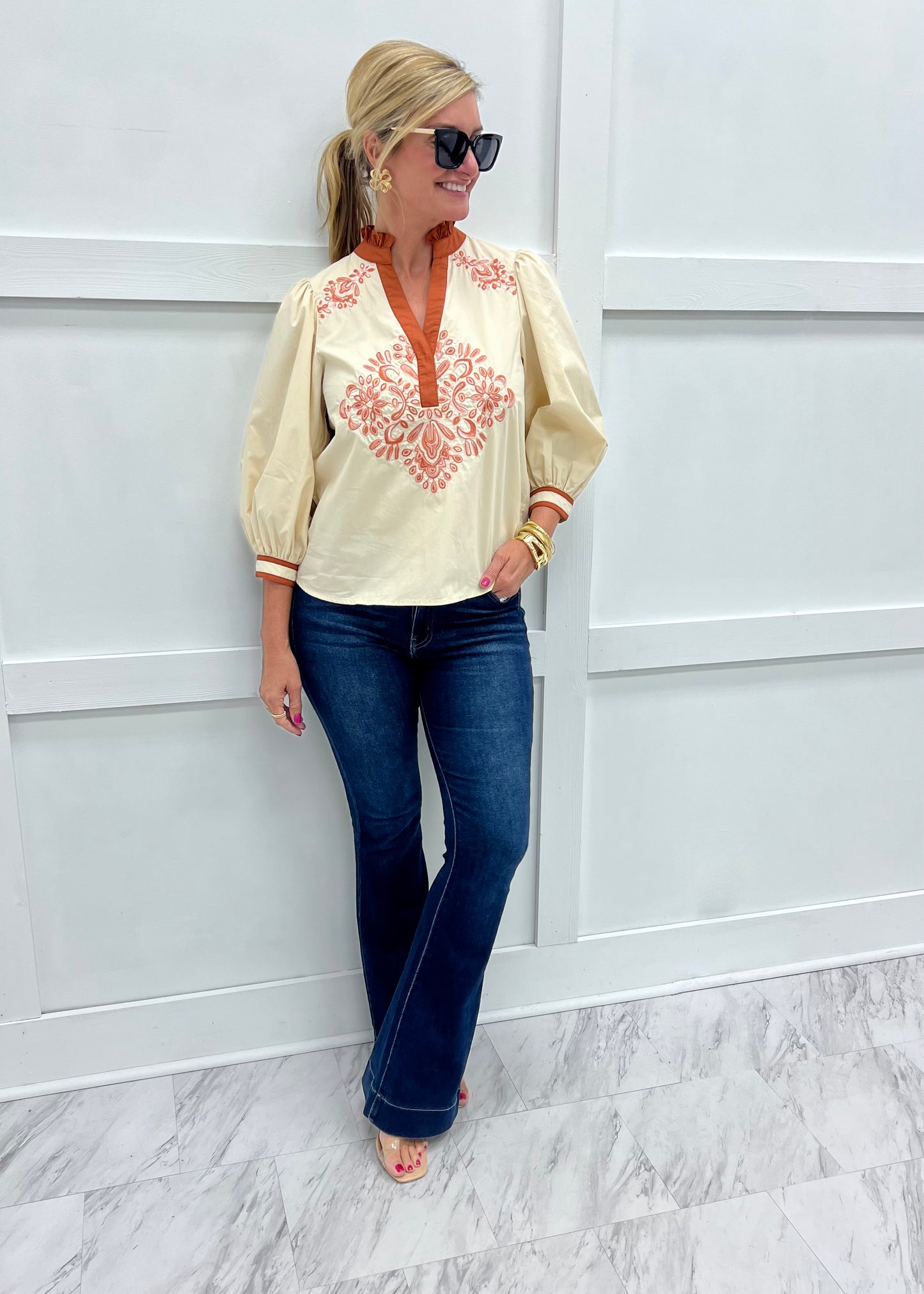 So LUXE! You will instantly fall in love with this one! Ivory woven fabric shapes this top featuring a v.neckline with rust colored detail + snap closure, 3/4 length sleeves with rust stripe trim + 2 button closure, and gorgeous embroidery on the front. We love the look and feel of this special top and can't wait to pair it with denim and gold accessories for an unforgettable look! Model is 5'8'' and wearing a size small.