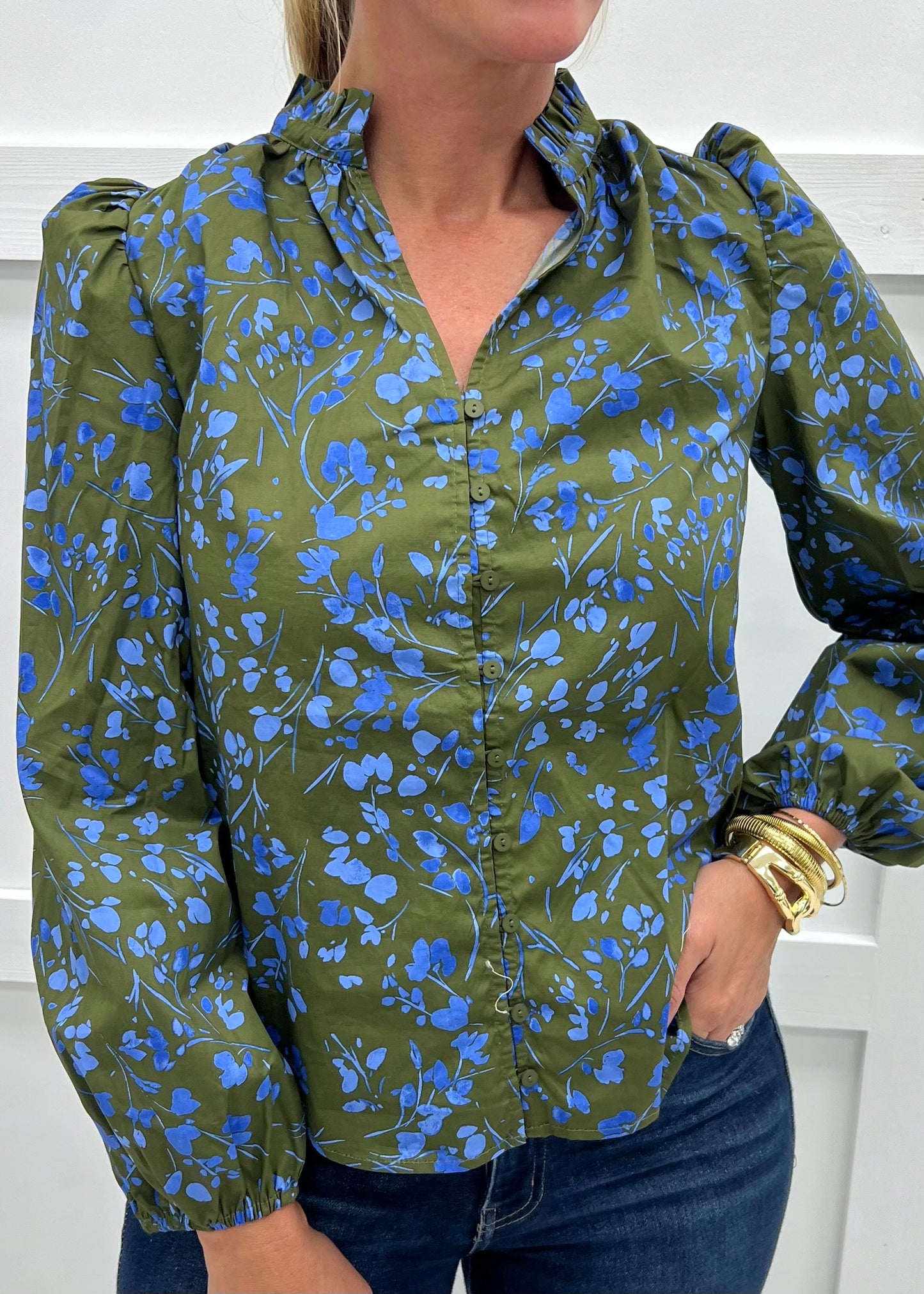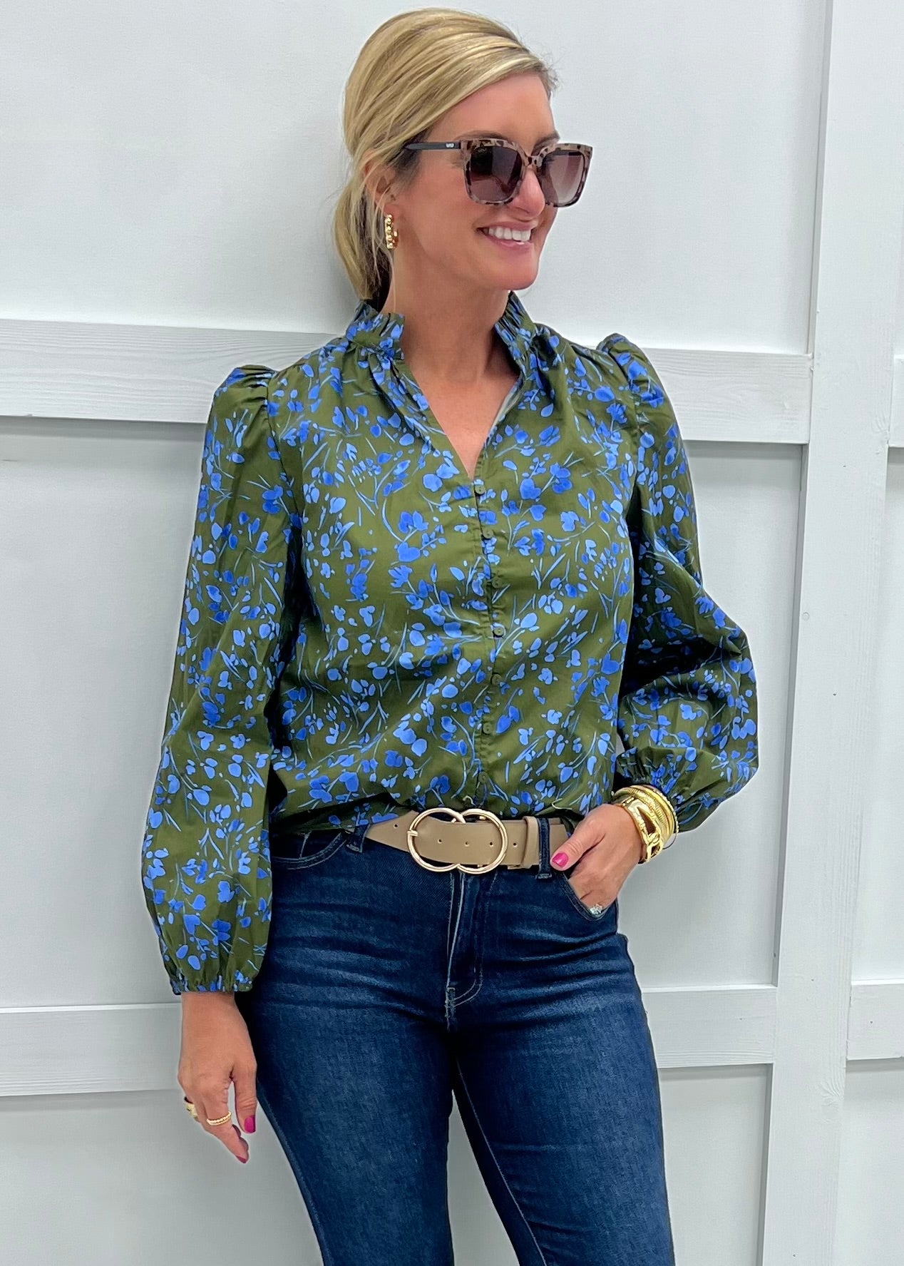 You will feel fabulous as soon as you slip on this pretty top! Woven fabric in olive green with a blue floral print shapes this top featuring a v.neckline with ruffle detailing, button front closure, long sleeves with elasticized wrists and a relaxed fit. We love this chic style! Model is 5'8'' and wearing a size small.