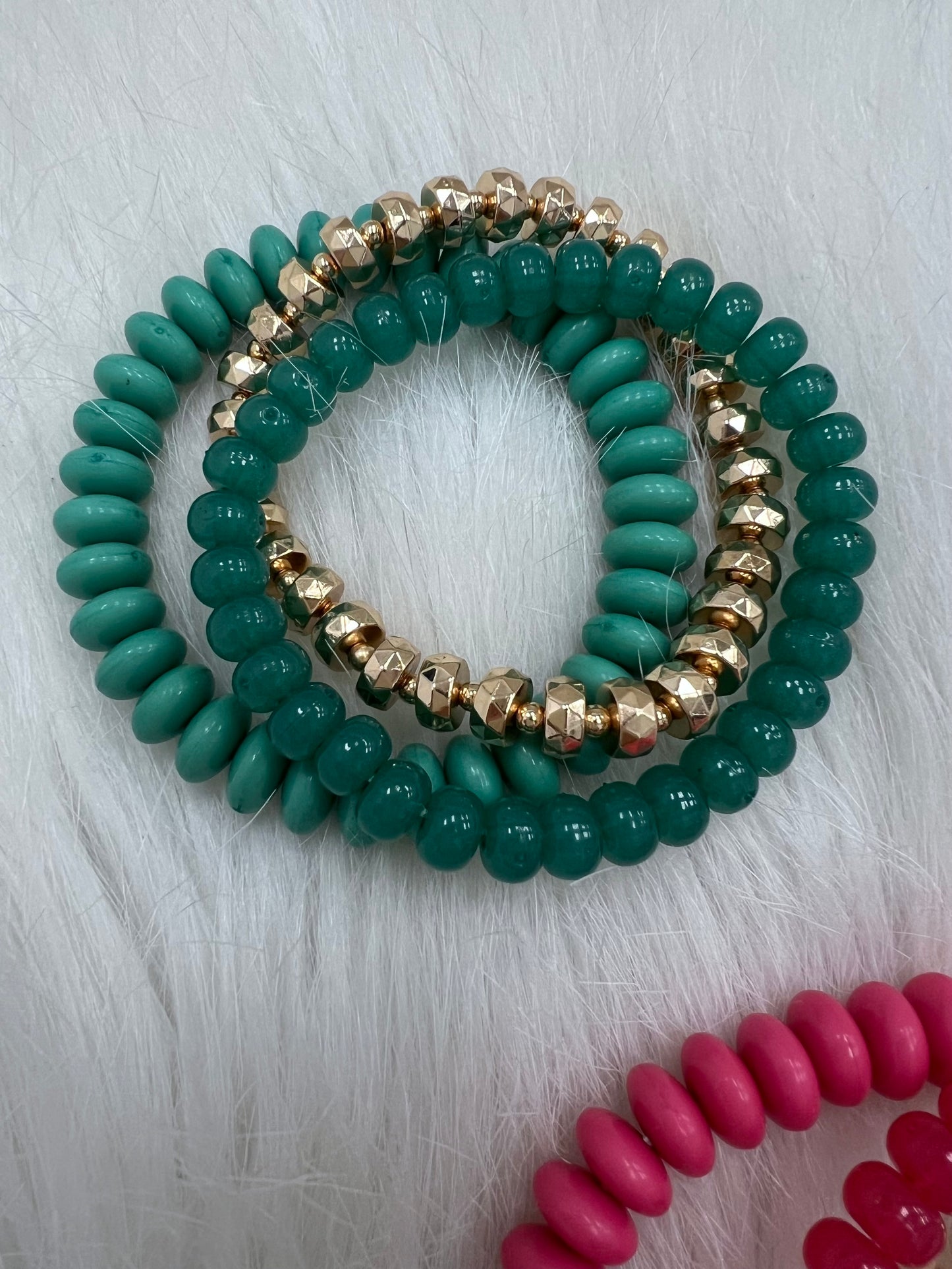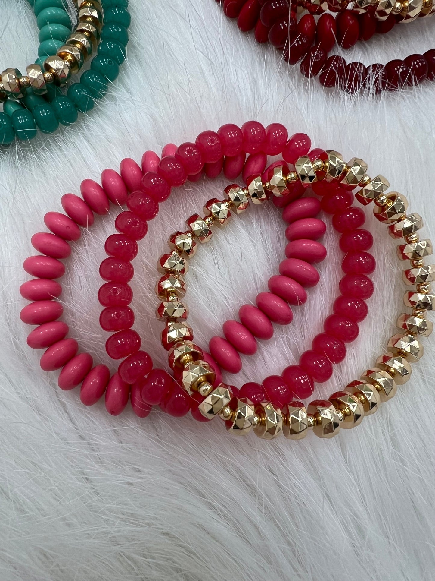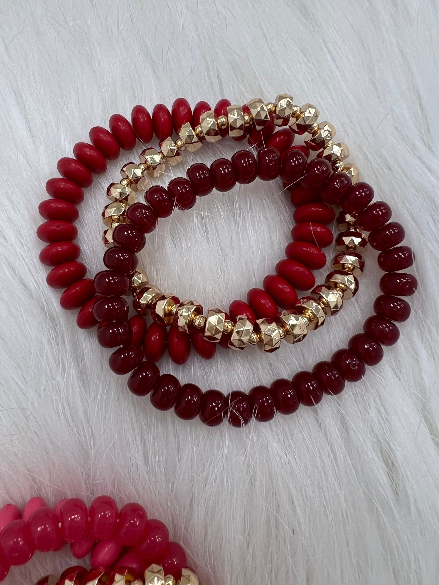 Our Blair Bracelets are the perfect way to accessorize your winter wardrobe! A set of three stretch bracelets one gold and two solids in either red, teal, or pink. We love this set on its own, with multiple sets mixed together or with other statement bracelets. The options are endless and you will love wearing these all year long!