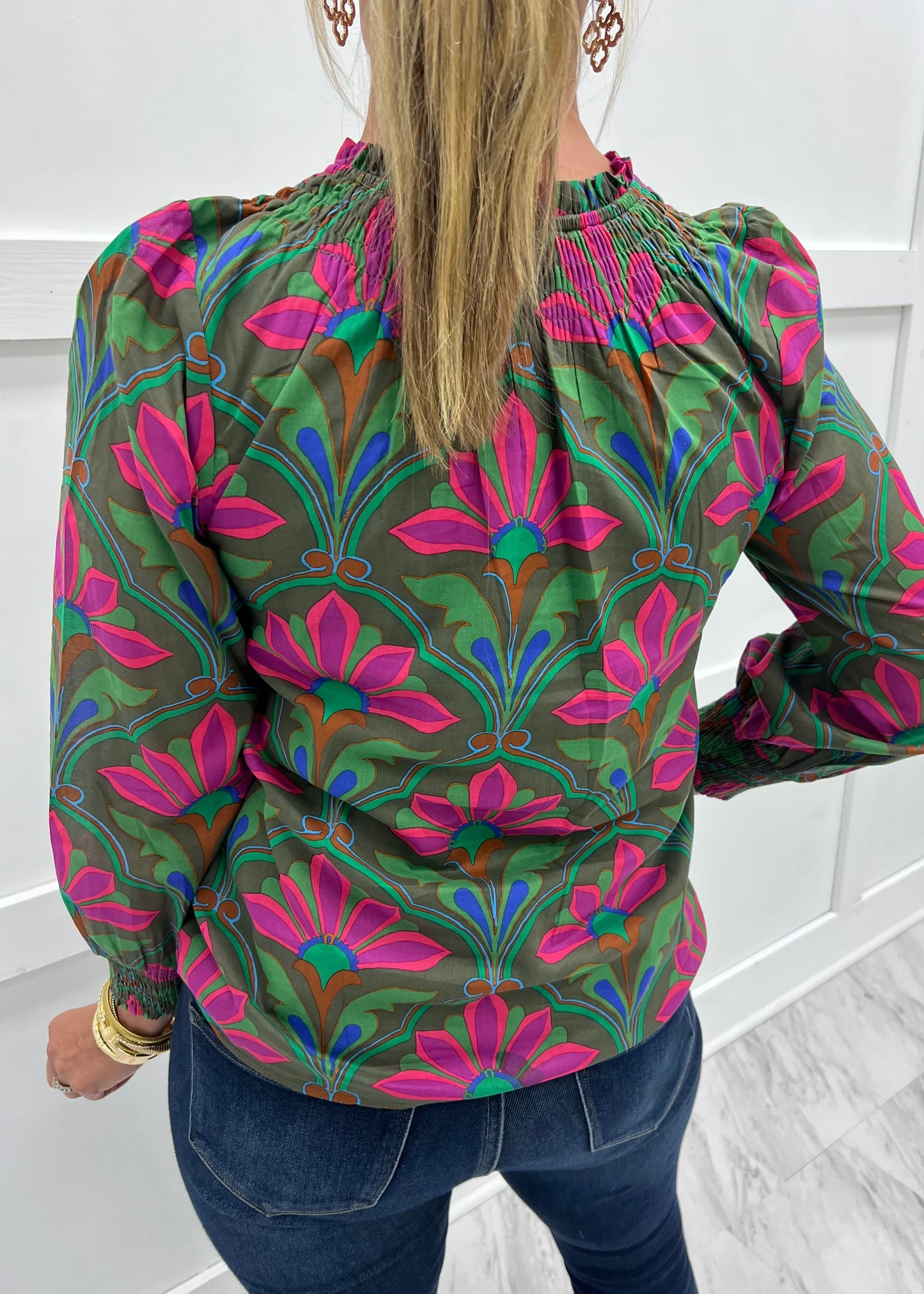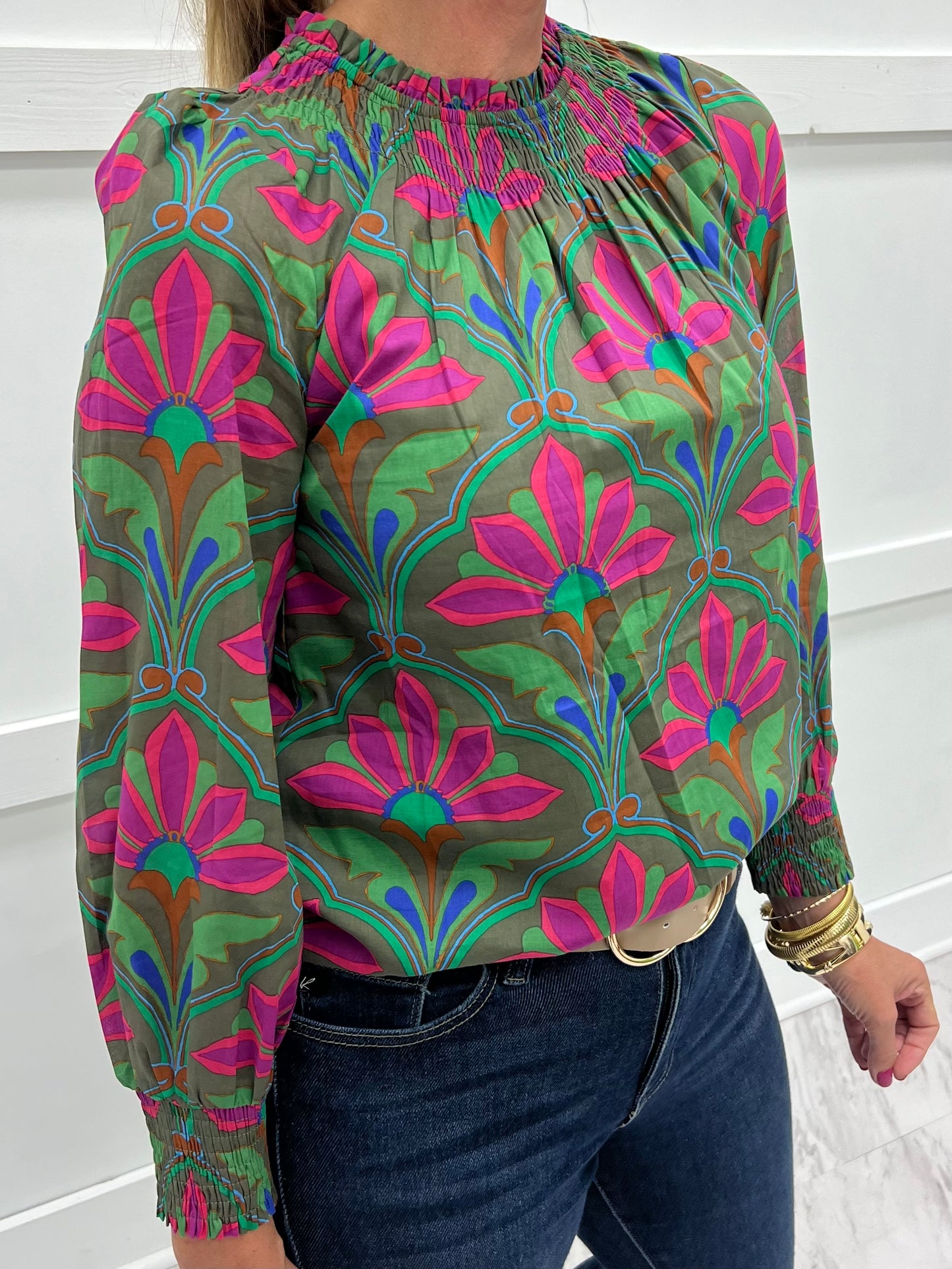 Calla Print + Smocked Neck Top