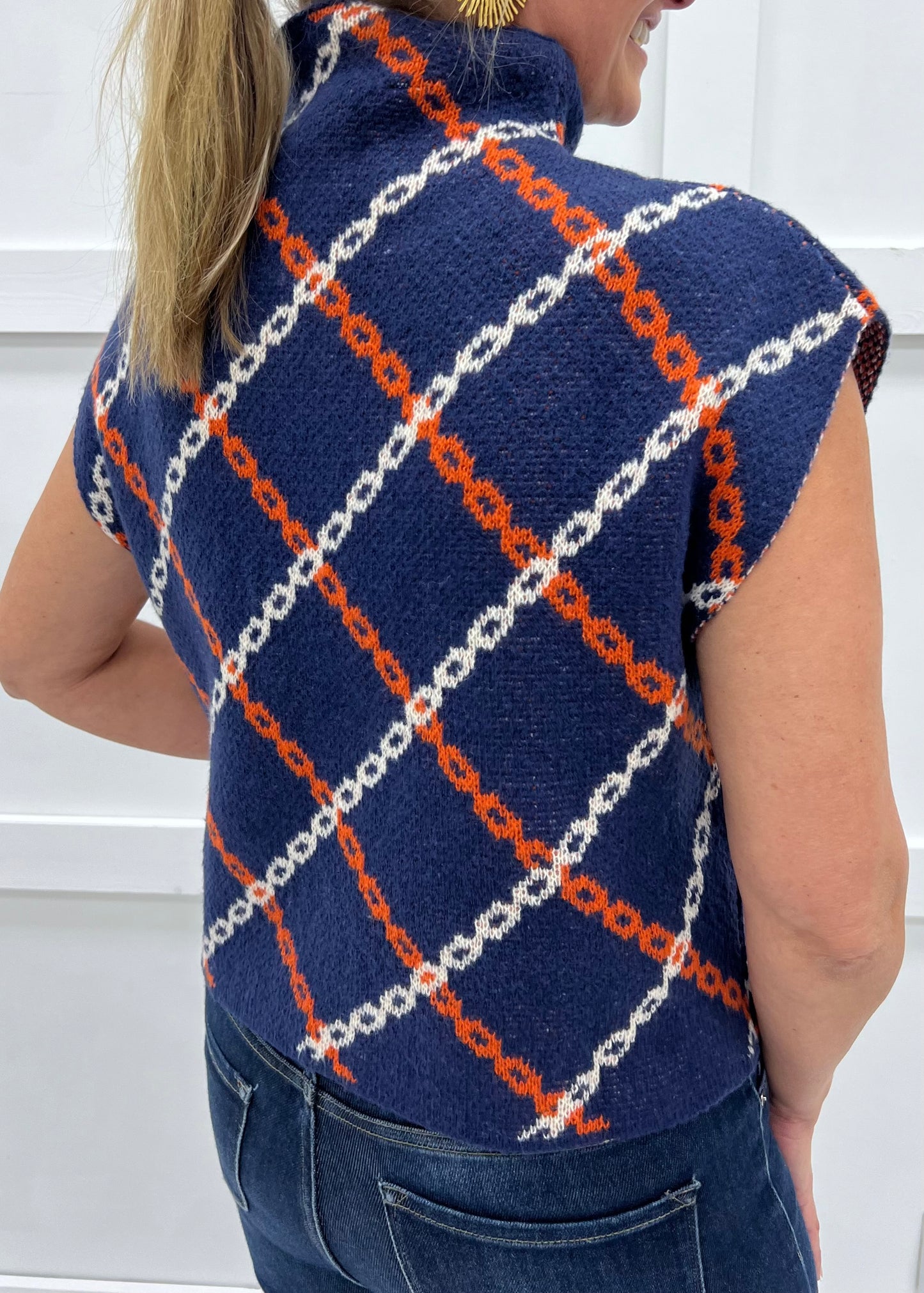 We love a good sweater and this classic style does not disappoint! Medium weight navy blue colored sweater knit fabric with an ivory and orange chain design shapes this sweater featuring a mock neckline, cap sleeves and a relaxed fit. We love this one tucked into denim or trousers for a fun, on trend preppy look! Model is 5'8'' and wearing a size small.
