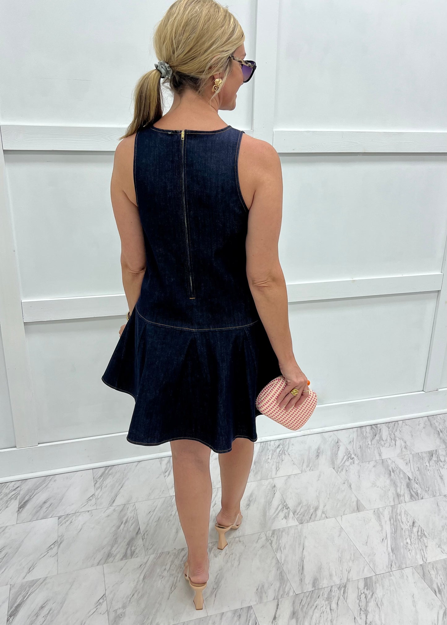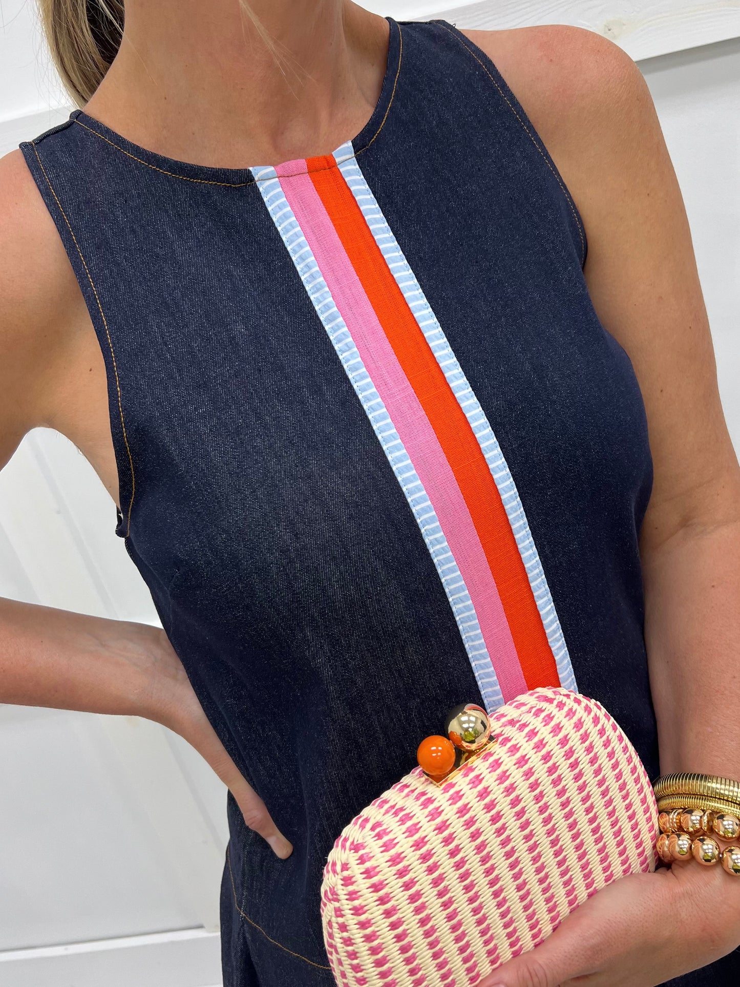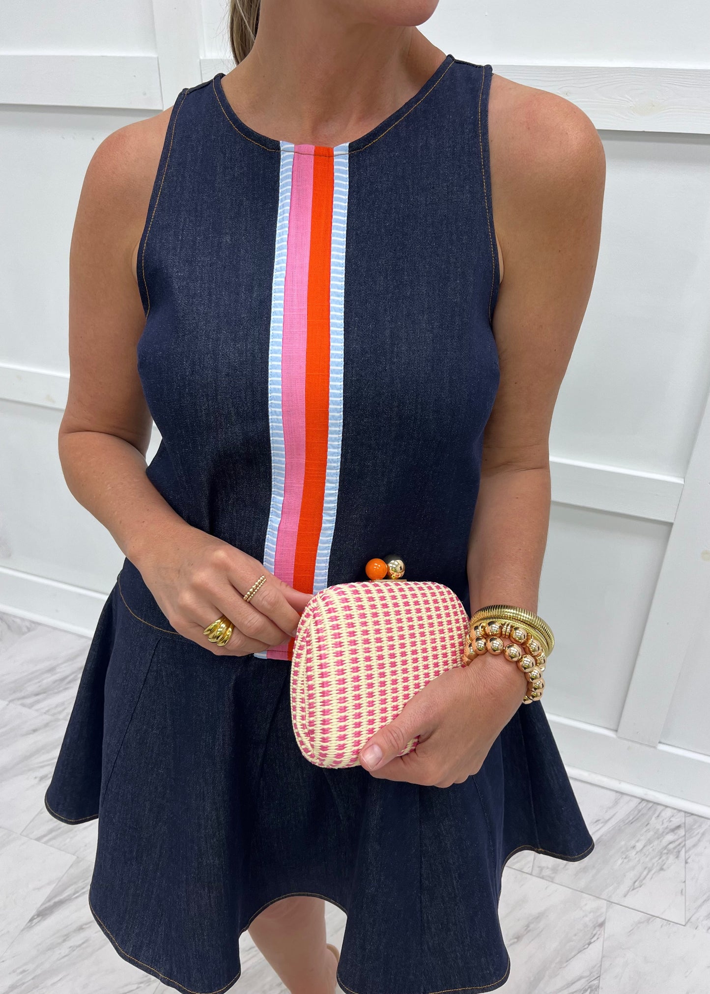 Looking good has never been so easy - simply slip on this dress, add sandals and accessories and you will be dressed to impress! Dark wash denim fabric shapes this tank style dress featuring a round neckline, dropped waistline, and striped detailing in pink, orange and blue + white stripes down the front. The back has a zipper back closure. This dress has the cutest shape and fit. Model is 5'8" and wearing a size small.