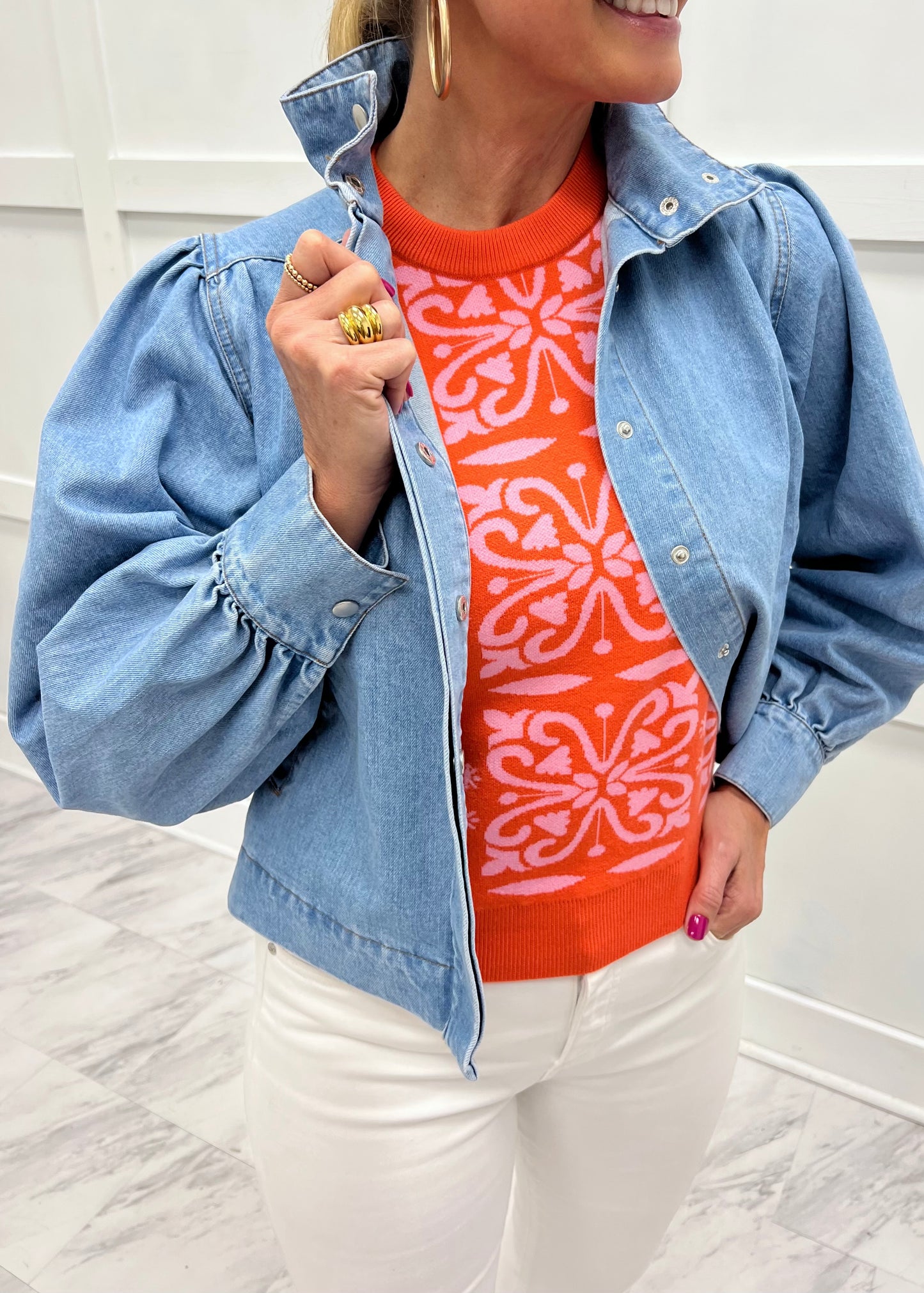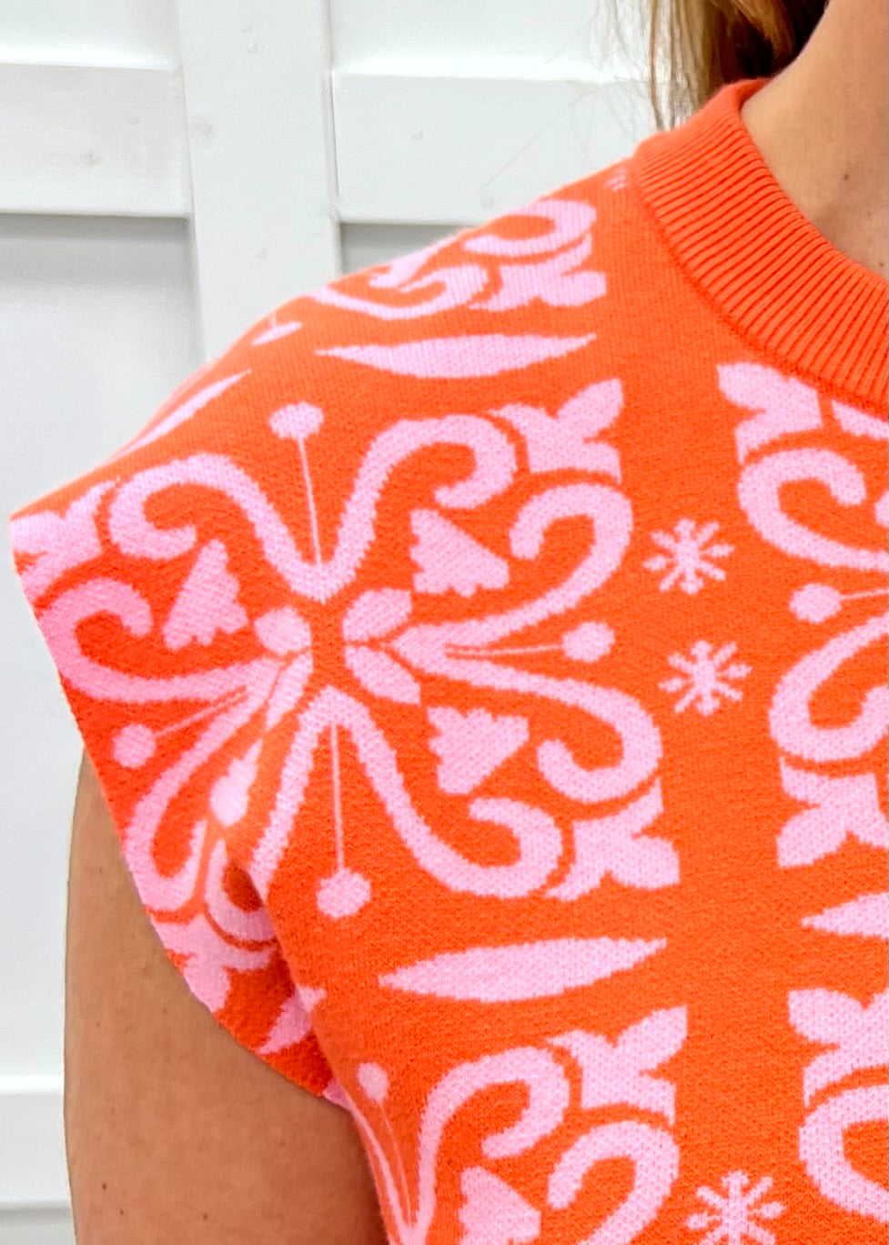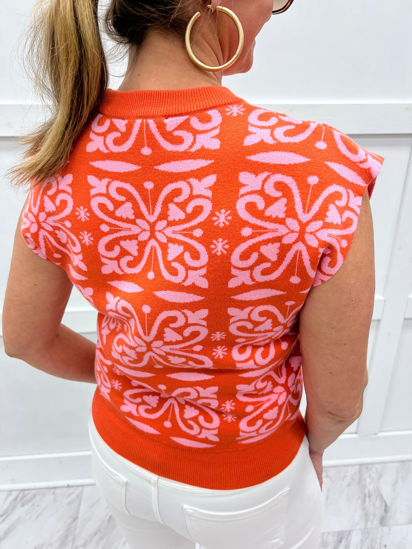 Cool, casual and ready for the weekend! Medium weight sweater fabric shapes this cap sleeve style featuring a round neckline and a relaxed fit. The coral fabric with a chic patten in pink is so pretty. Pair with any wash of denim for an on trend weekend look! Model is 5'8'' and wearing a size small.