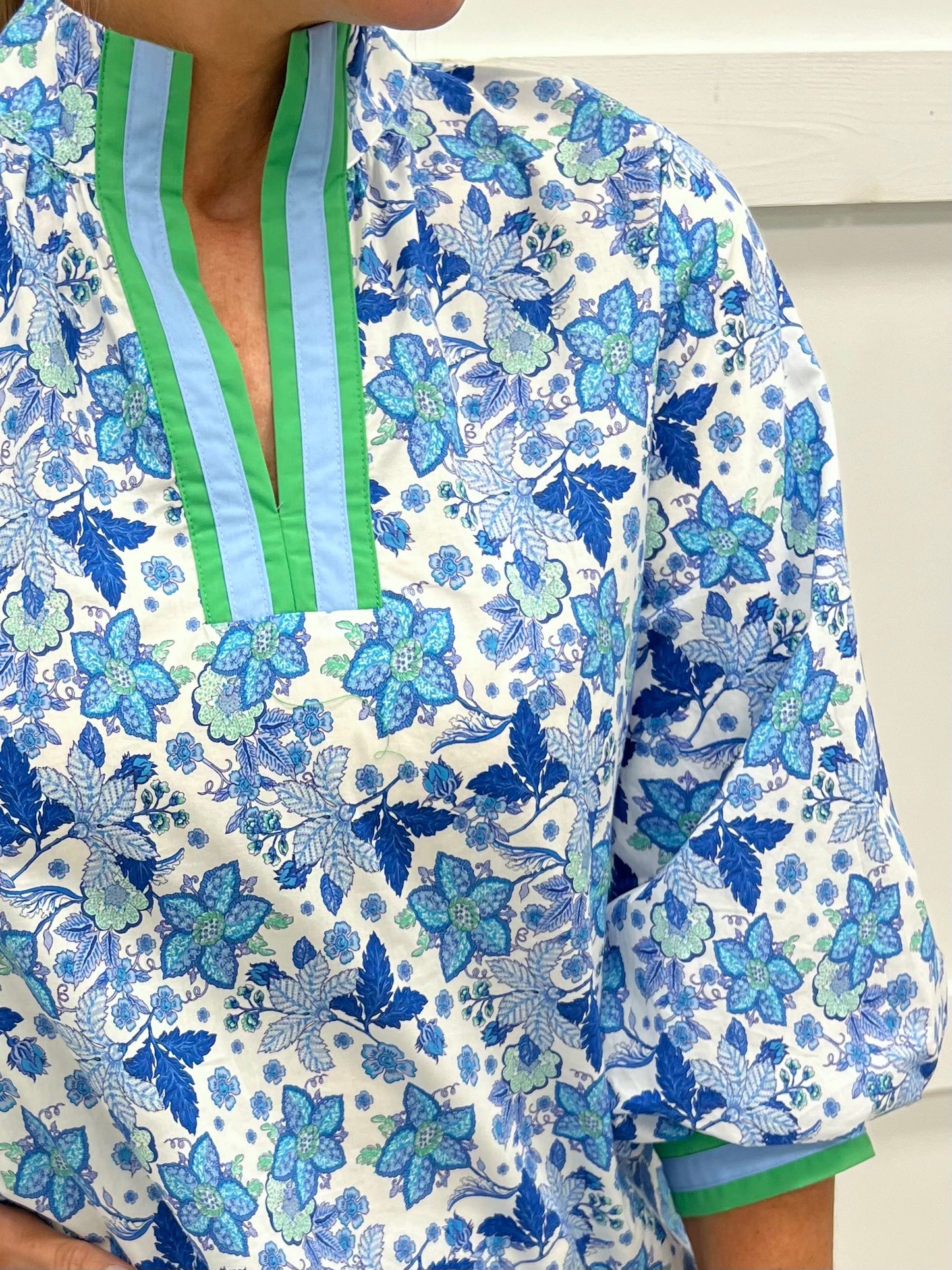 So pretty... you will instantly fall in love with this easy to wear style! A floral print in shades of blue and green, shapes this top featuring a v.neckline, blue + green stripe detailing, a higher collar, and 3/4 length sleeves with stripe detail and button closure. This top has it all a darling print and feminine details. This versatile style can easily be dressed up or down to fit the occasion. Model is 5'8" and wearing a size small.