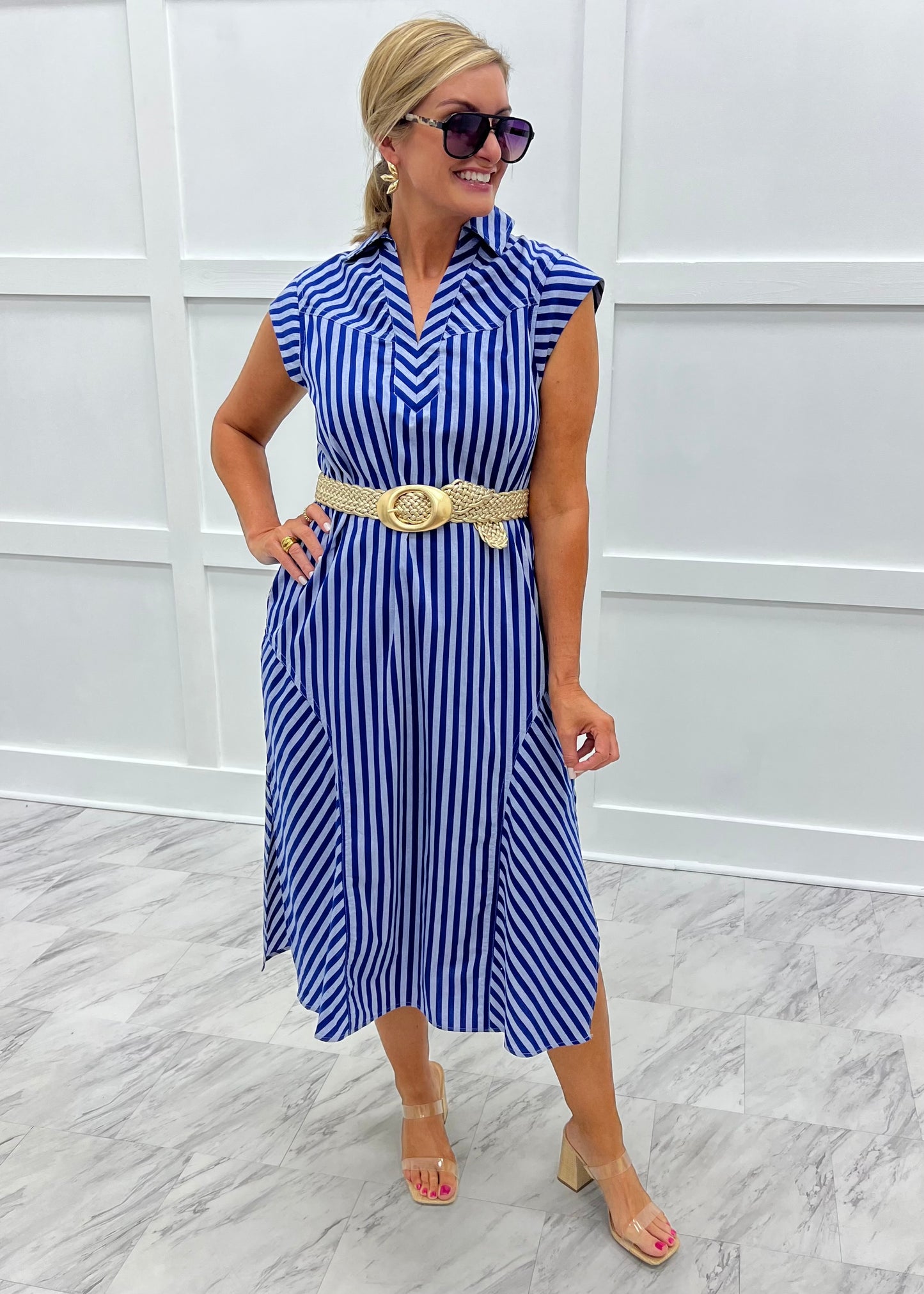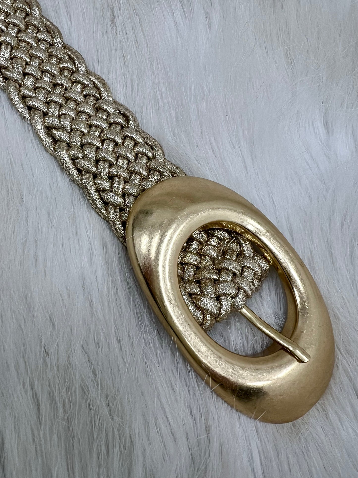 Change up the look of your favorite summer dress by adding this on trend belt! Stretchy, gold metallic woven material shapes this belt with a gold buckle closure. We love the way this style instantly updates any look!