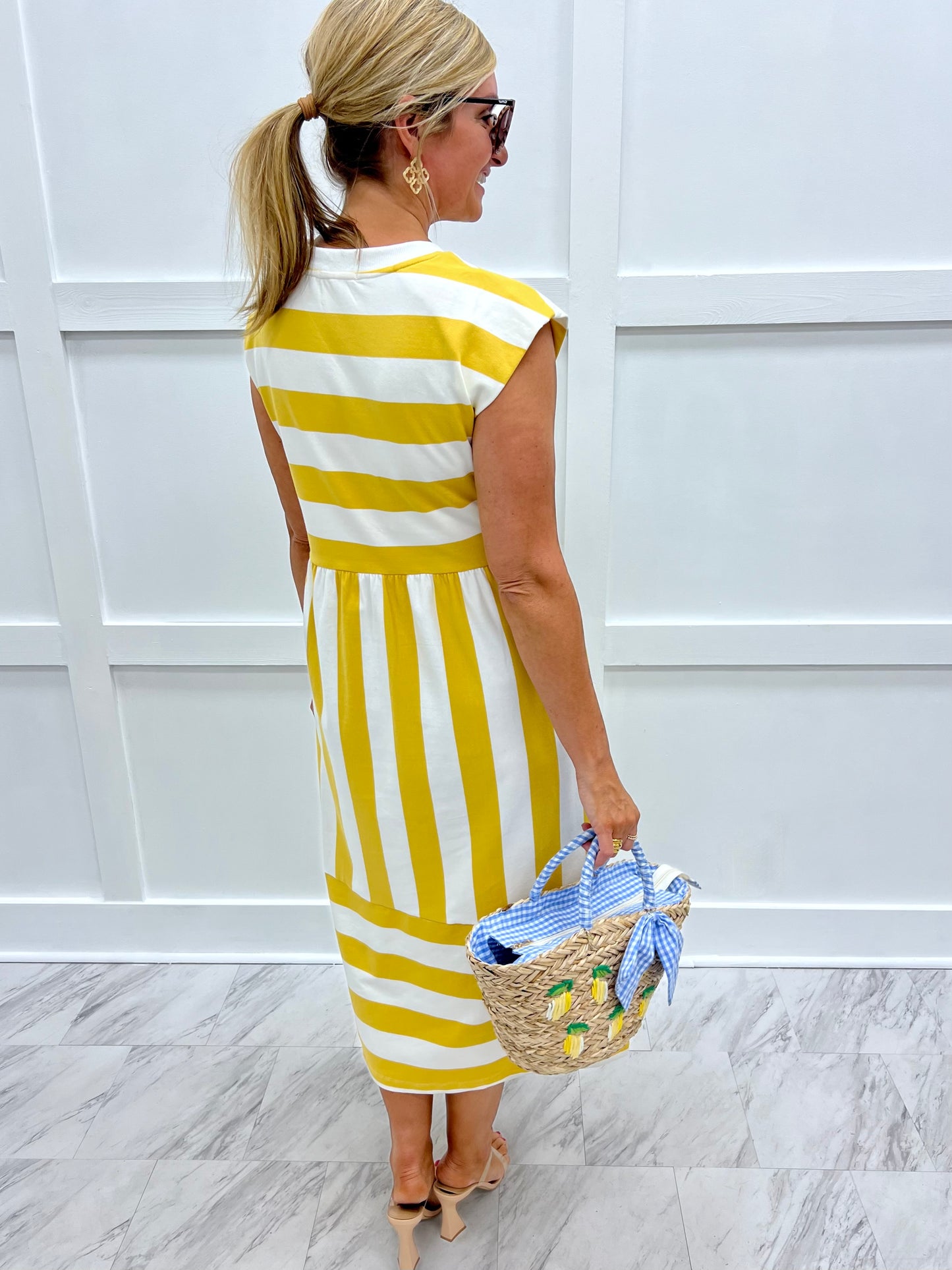 Cute + comfortable, this is simply the perfect dress for summer days! Golden yellow and off white knit striped fabric shapes this dress with a round ribbed knit neckline, seamed waistline, side slit pockets and midi length. This easy to wear dress looks great on its own or paired with cute denim jacket if the evening is cool! The perfect weekend dress! Model is 5'8'' and wearing a size small.