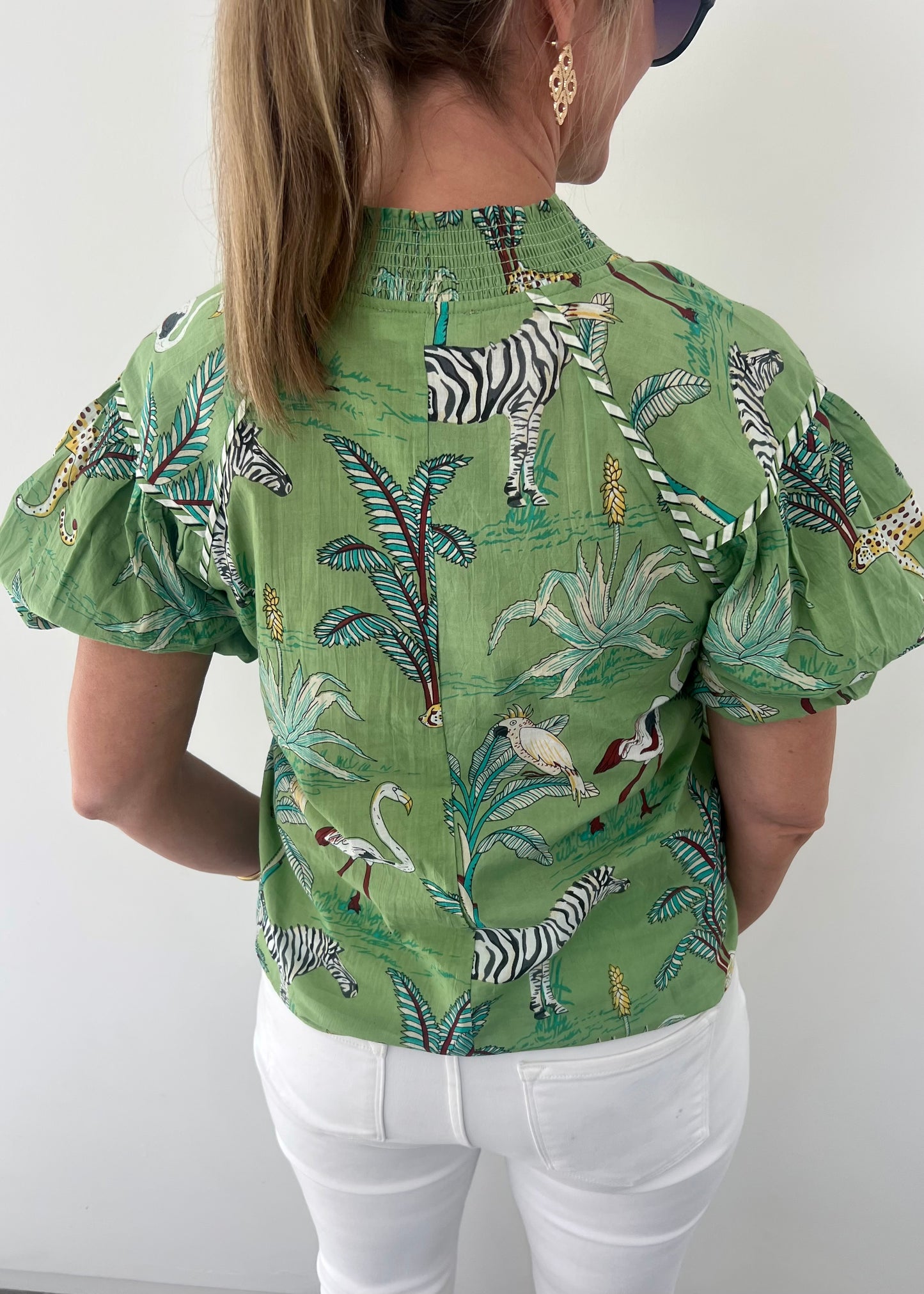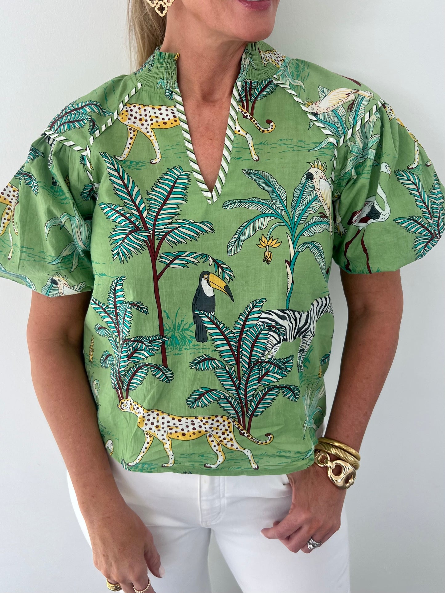Summer fun start with our In The Jungle Top! Green woven fabric with a unique print with palm leaves, wild animals and striped trim. This top features a v.neckline with smocking along the collar, short puff sleeves and a relaxed fit. This one is so fun... steal all of the attention in this eye catching top! Model is 5'8'' and wearing a size small.