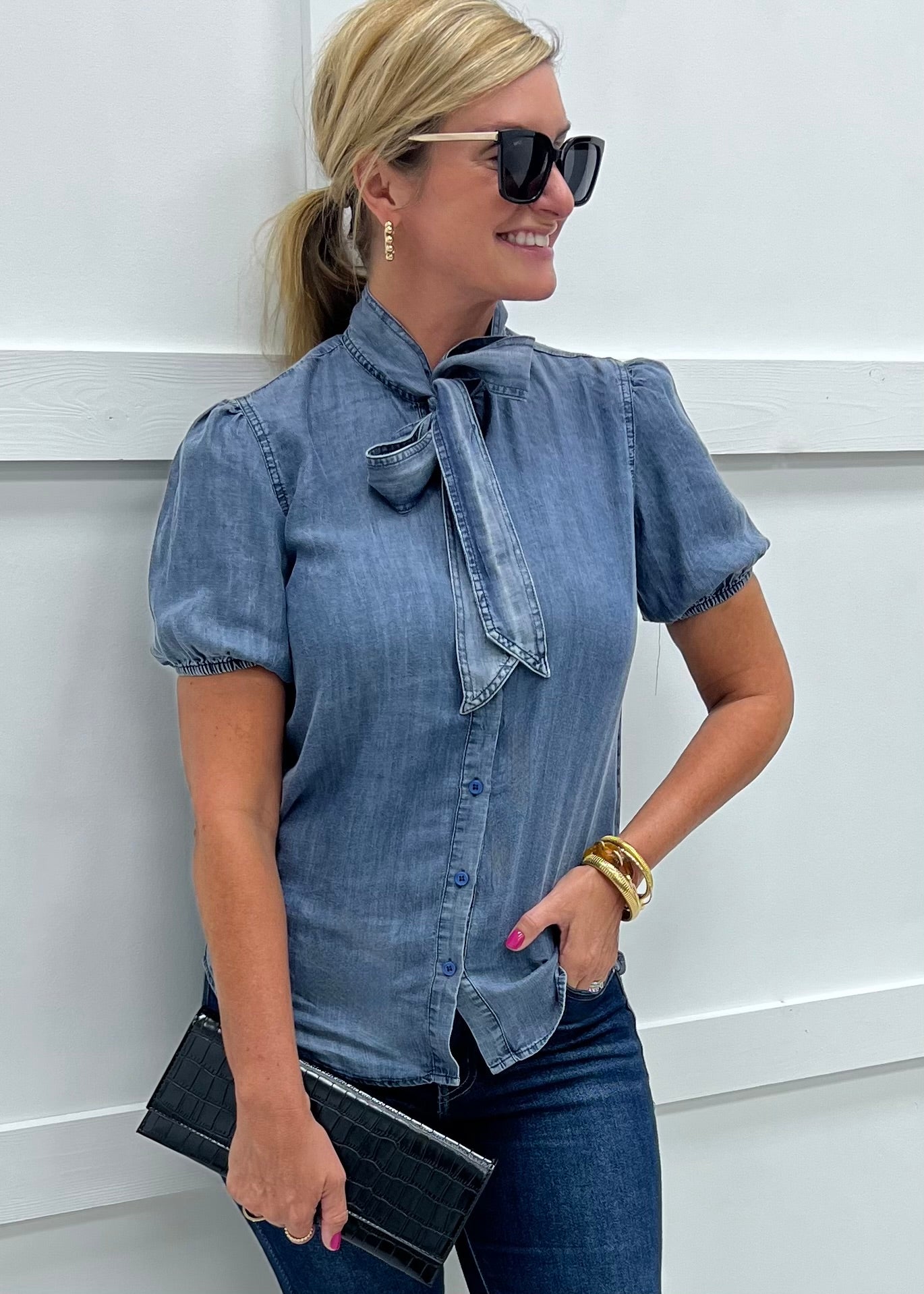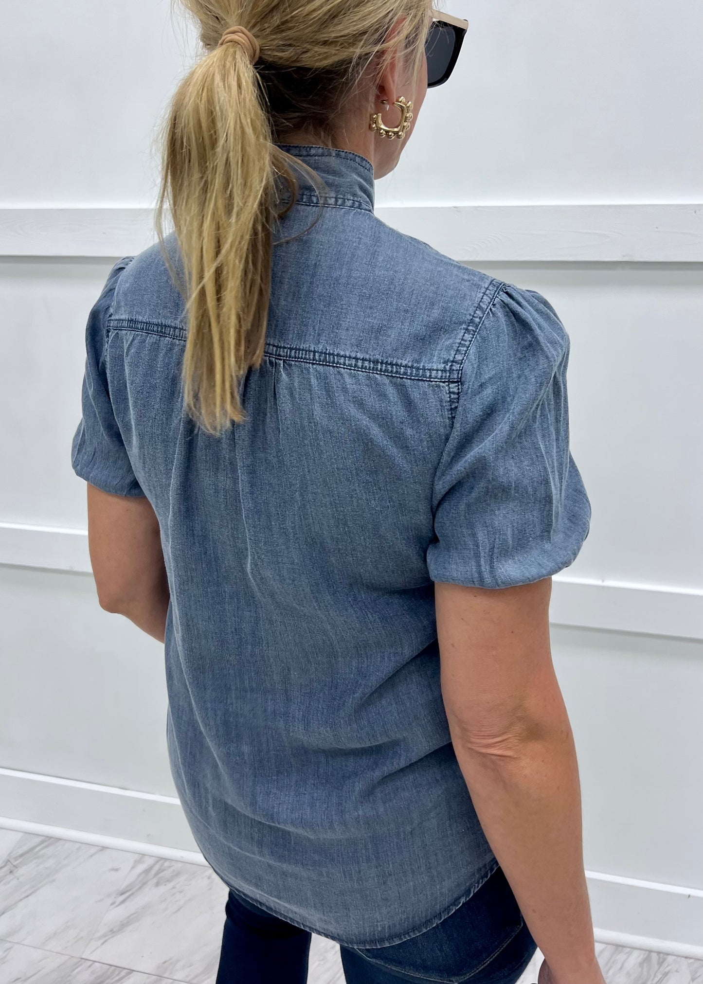 With infinite styling possibilities this one is sure to be a welcome addition to your wardrobe! Medium wash chambray fabric with with a round neckline + self tie bow detail, button front closure, short puff sleeves with elastic detailing and a relaxed fit. This easy to wear style looks great with denim, skirts or shorts and we can't wait to style it all year long! Model is 5'8'' and wearing a size small.