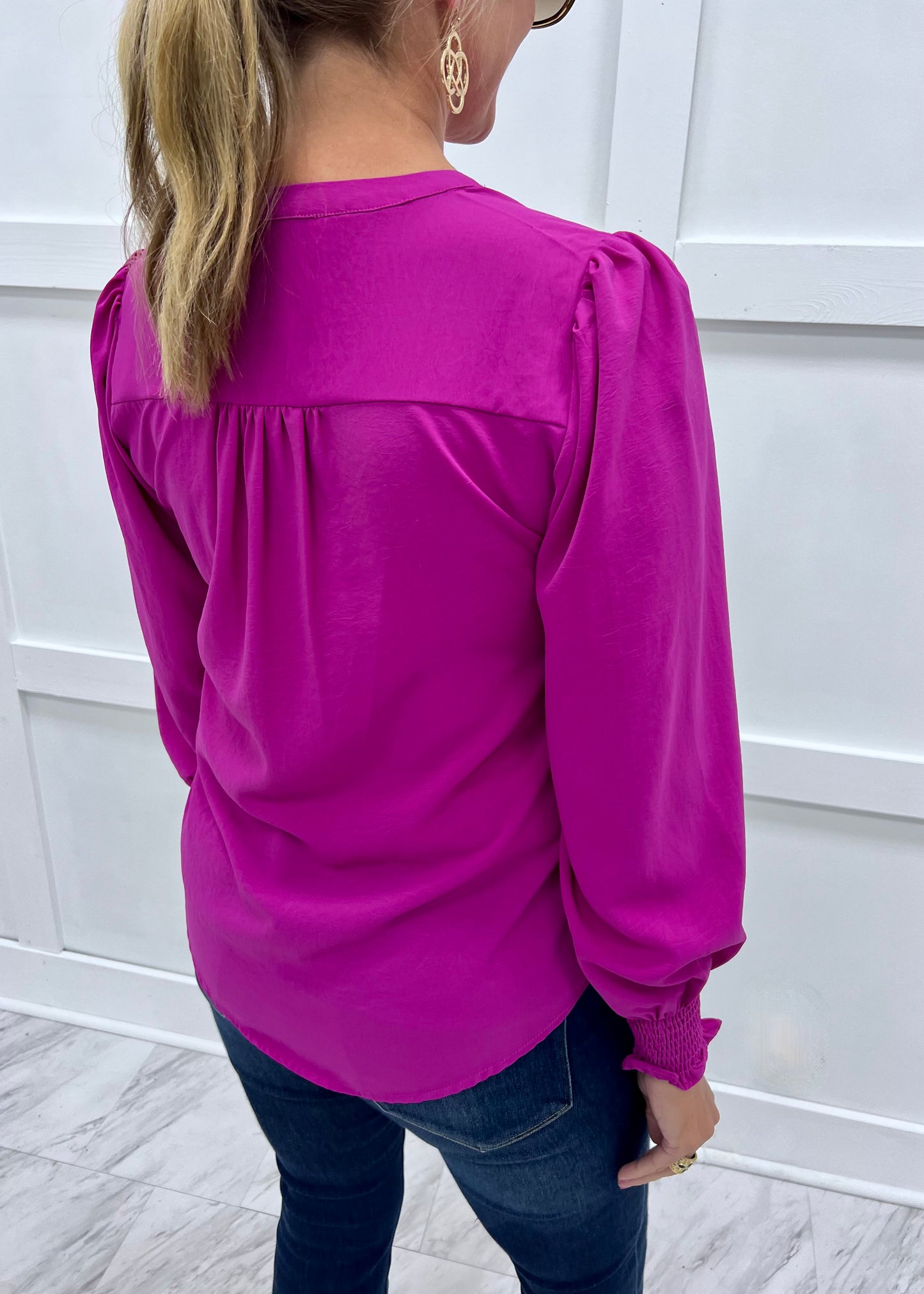 You will be reaching for this one all of the time! Magenta colored fabric shapes this top featuring a v.neckline, fabric detailing down the center, long sleeves with smocked detail at the wrists and a relaxed fit. This one can easily be styled for work or play and looks great with everything from denim to high waisted skirts! Model is 5'8'' and wearing a size small.