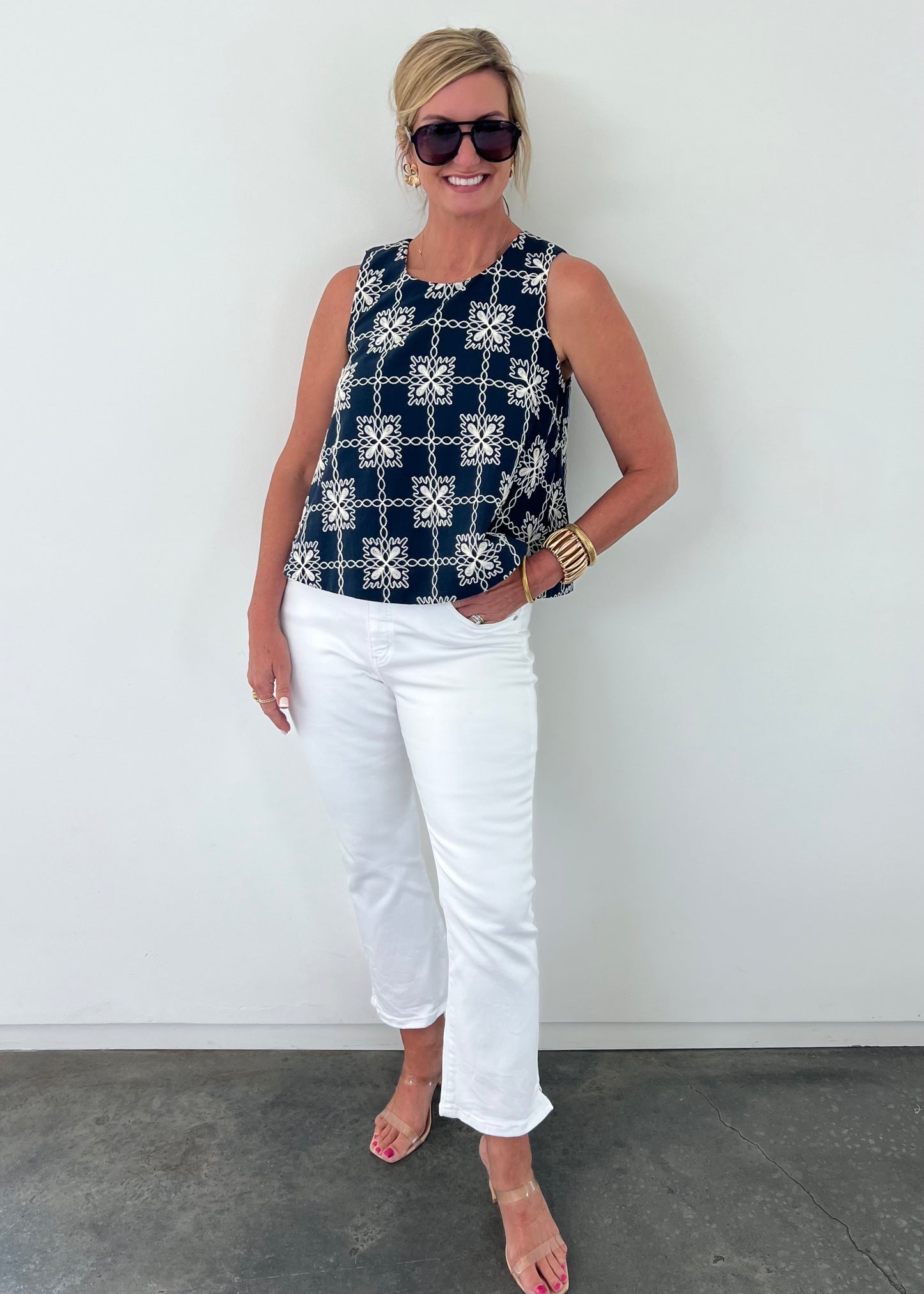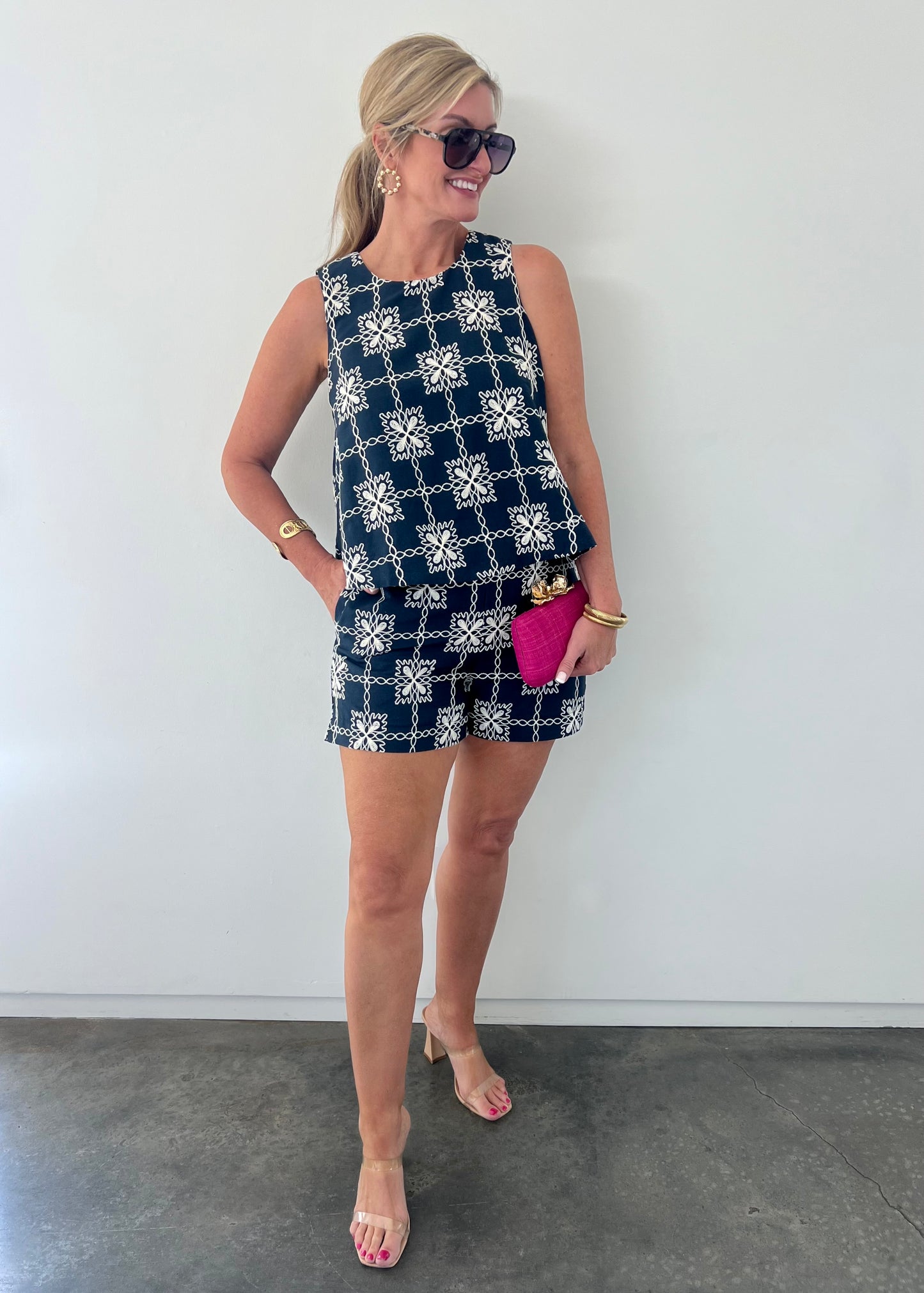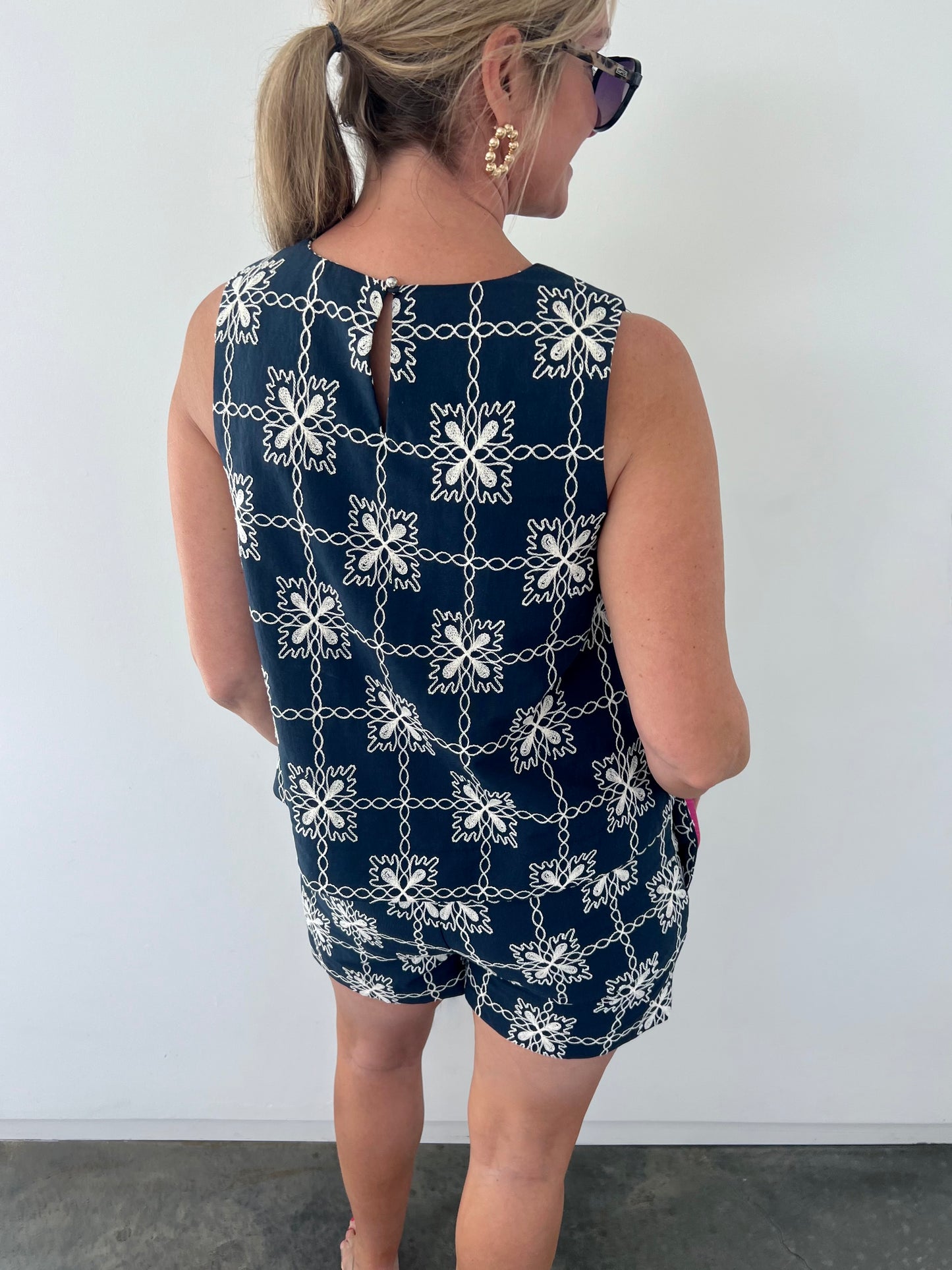 So chic! This little top is ultra flattering and so wearable! Navy blue fabric with a gorgeous embroidered pattern shapes this top featuring a round neckline and a small keyhole + button closure at the back neckline. This classic style can be styled so many ways, for so many occasions... we love it one with our matching Keye Shorts, denim or trousers... we can't wait to see how you will wear it! Model is 5'8'' and wearing a size small.