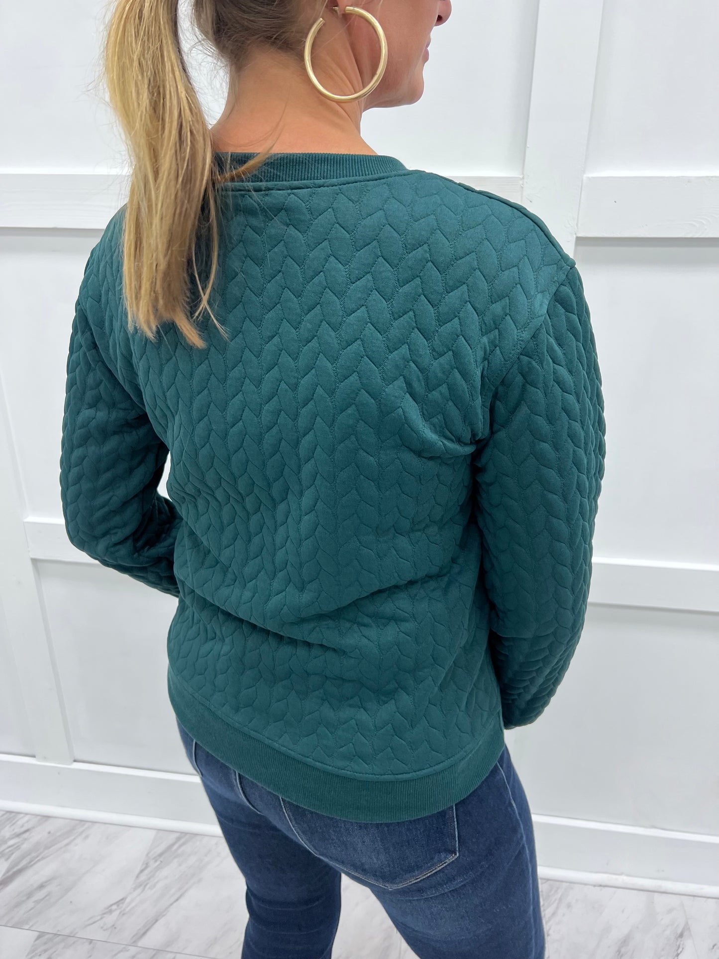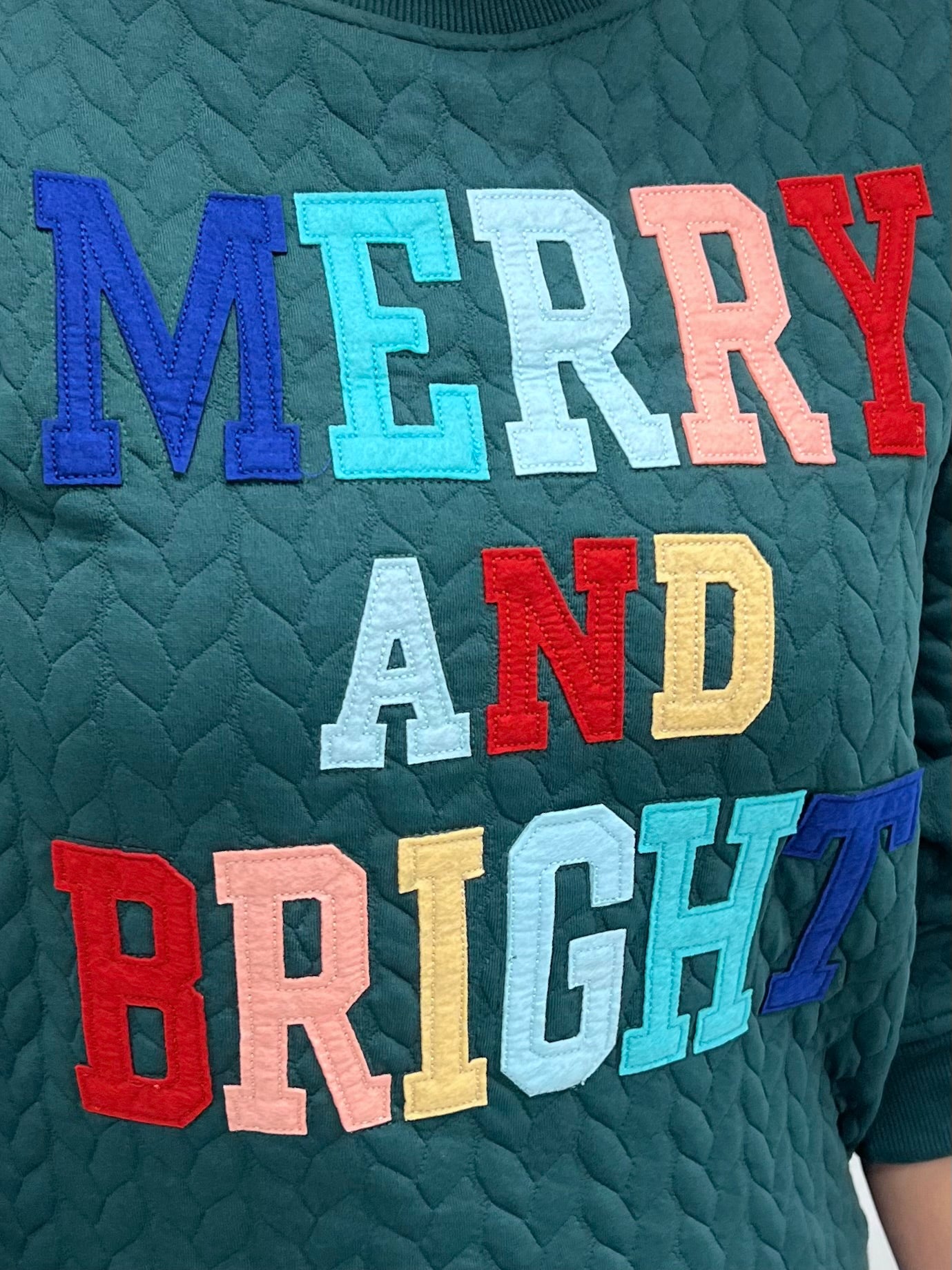 It's easy to feel Merry + Bright when you wear this darling top to celebrate the holiday season! Dark green, textured knit fabric shapes this style featuring a round neckline, long sleeves, ribbed knit detailing at the neckline, wrists and waist and "merry and bright" written in colorful applique across the chest. This relaxed fit style looks great with denim or leggings. Model is 5'8'' and wearing a size small.