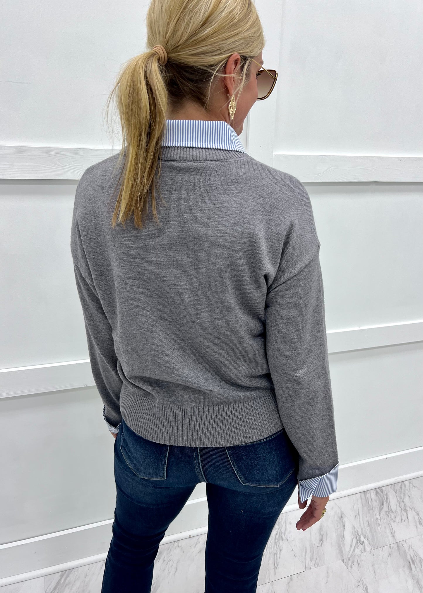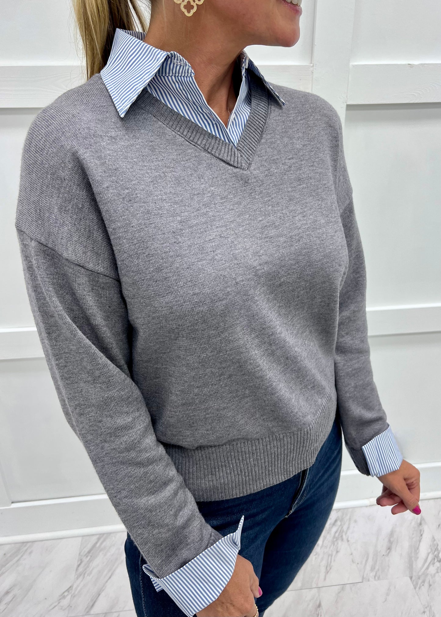 A new twist on a wardrobe staple, our Perfectly Preppy Sweater is the perfect mix of comfort and luxe! Gray colored sweater knit fabric shapes this style featuring a v.neckline, long sleeves and blue + white shirting fabric detail at the collar and on the wrists. This one gives the appearance of a layered look without all of the bulk! Dress it up or dress it down, we can't wait to see how you will style it! Model is 5'8'' and wearing a size small.
