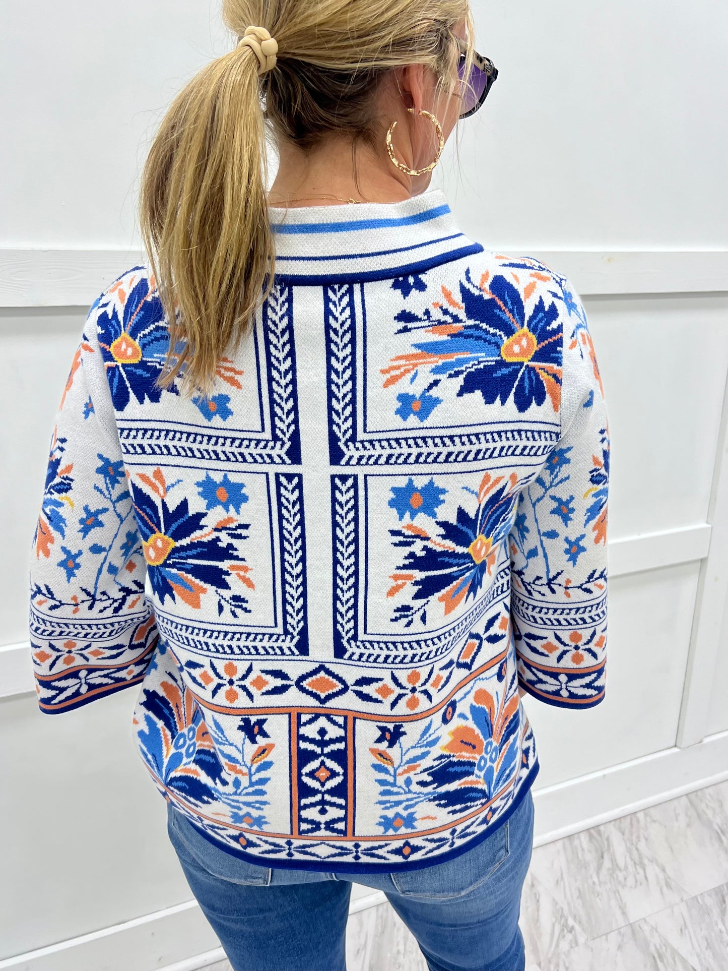 Our favorite sweater style... now in this gorgeous pattern that is perfect for spring! Medium weight knit sweater material featuring a funnel neck, 3/4 length sleeves and a relaxed fit. This happy style is sure to bring a small to your face! You will love wearing this fun style all season long! Model is 5'8'' and wearing a size small.