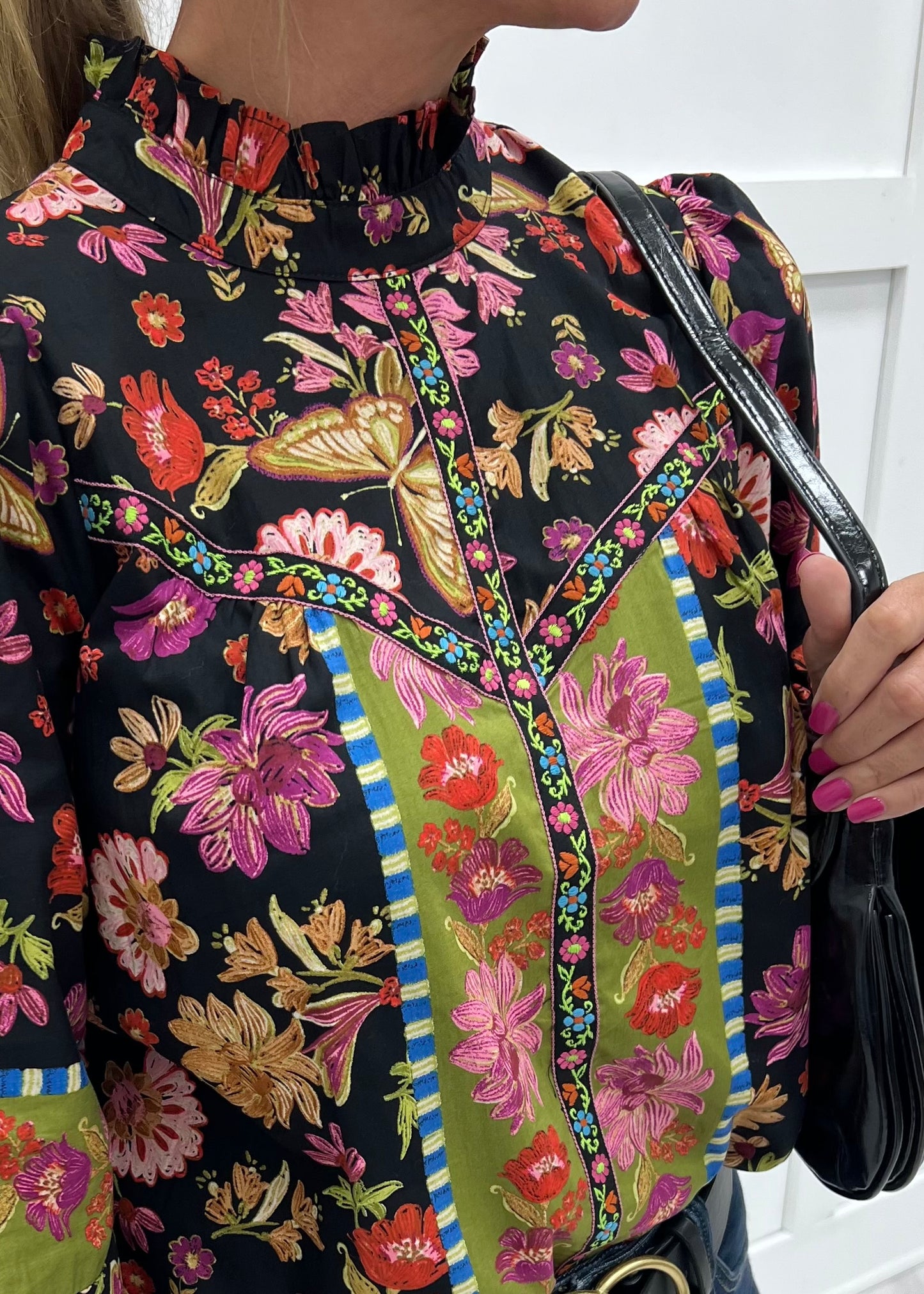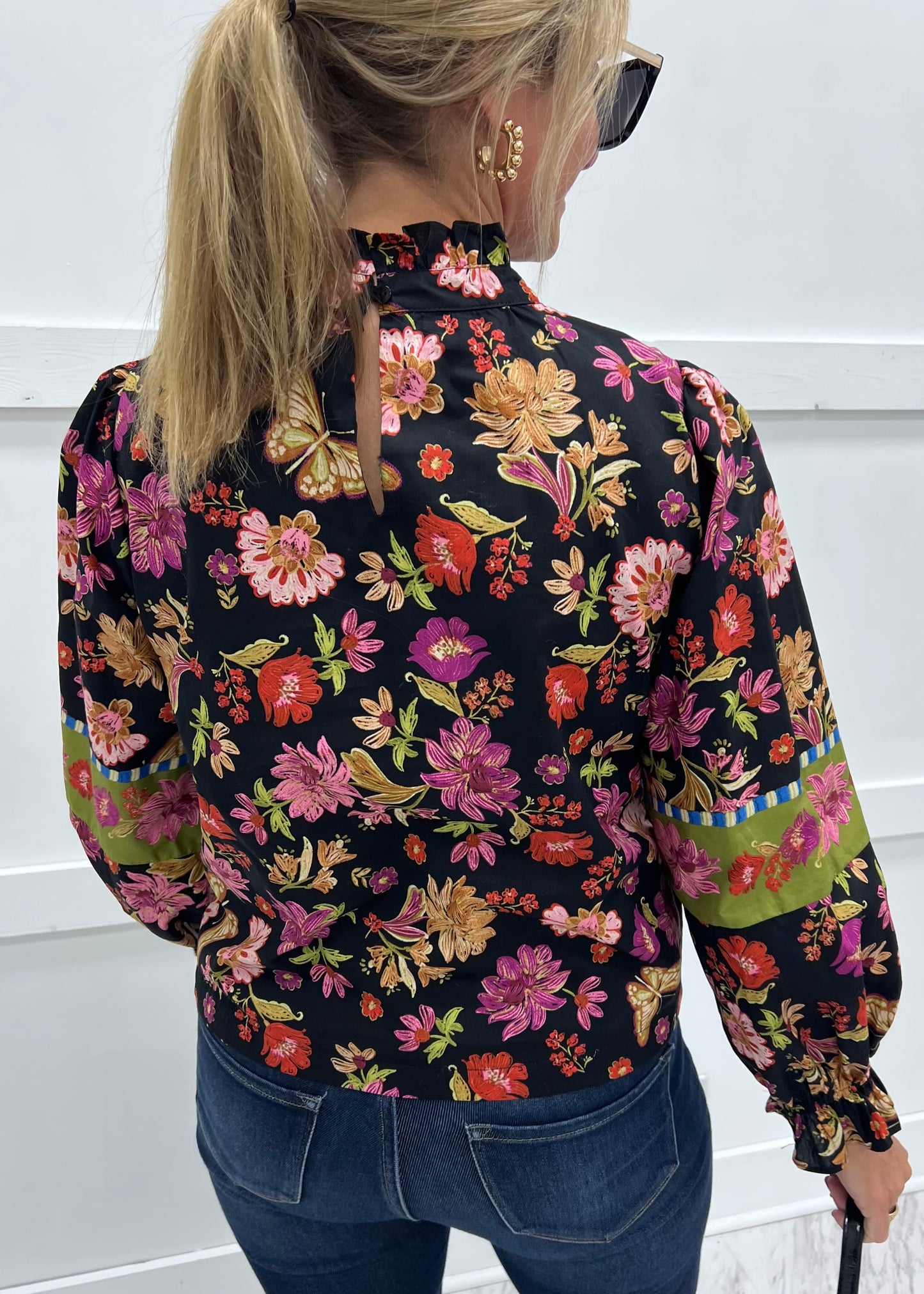 Be bold and stand out in the crowd in this iconic print top! Step out in style in this woven top adorned with mixed prints in florals and stripes, a high ruffled neckline, long sleeves with a band of elastic and trumpet detail and a relaxed fit body. The back has a small keyhole + button closure at the neckline and this style is lined. This top is so unique, we love it paired with denim, fun earring and cute booties! Model is 5'8'' and wearing a size small.