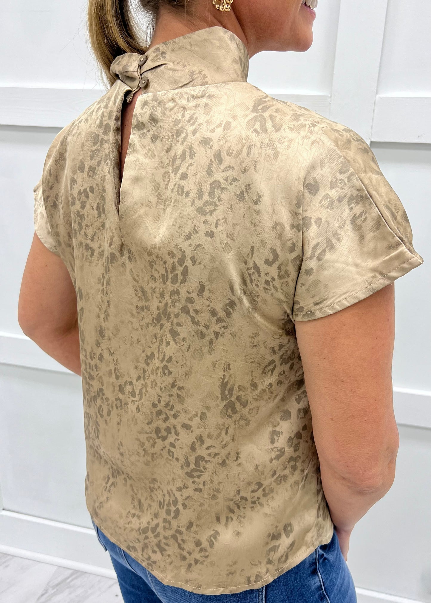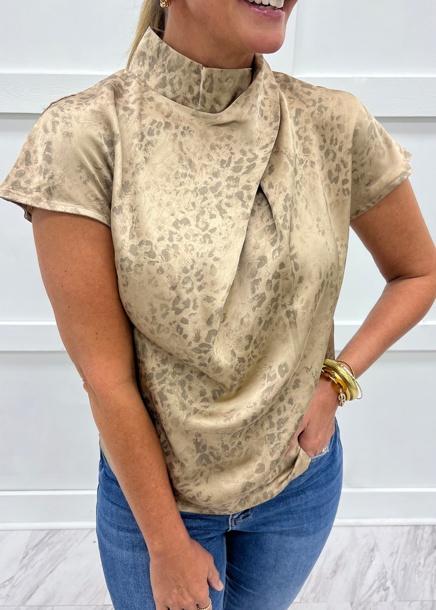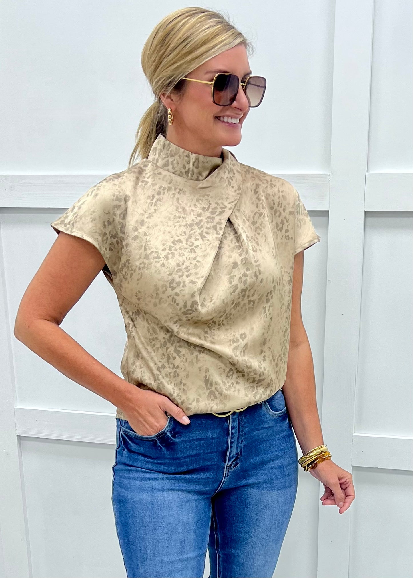 Daydreaming about all of the fun places you will wear this cute little top! Silky, gold spotted fabric shapes this top featuring a mock neckline, draped detailing below the neckline, short dolman sleeves, and a small keyhole at the back neckline + 2 button closure. We love this updated go- to style and can't wait to wear it all year long! Model is 5'8'' and wearing a size small.