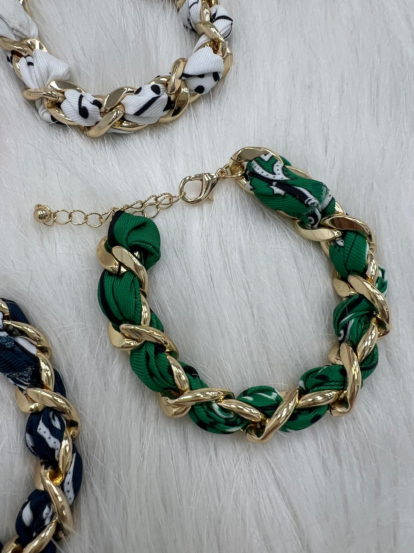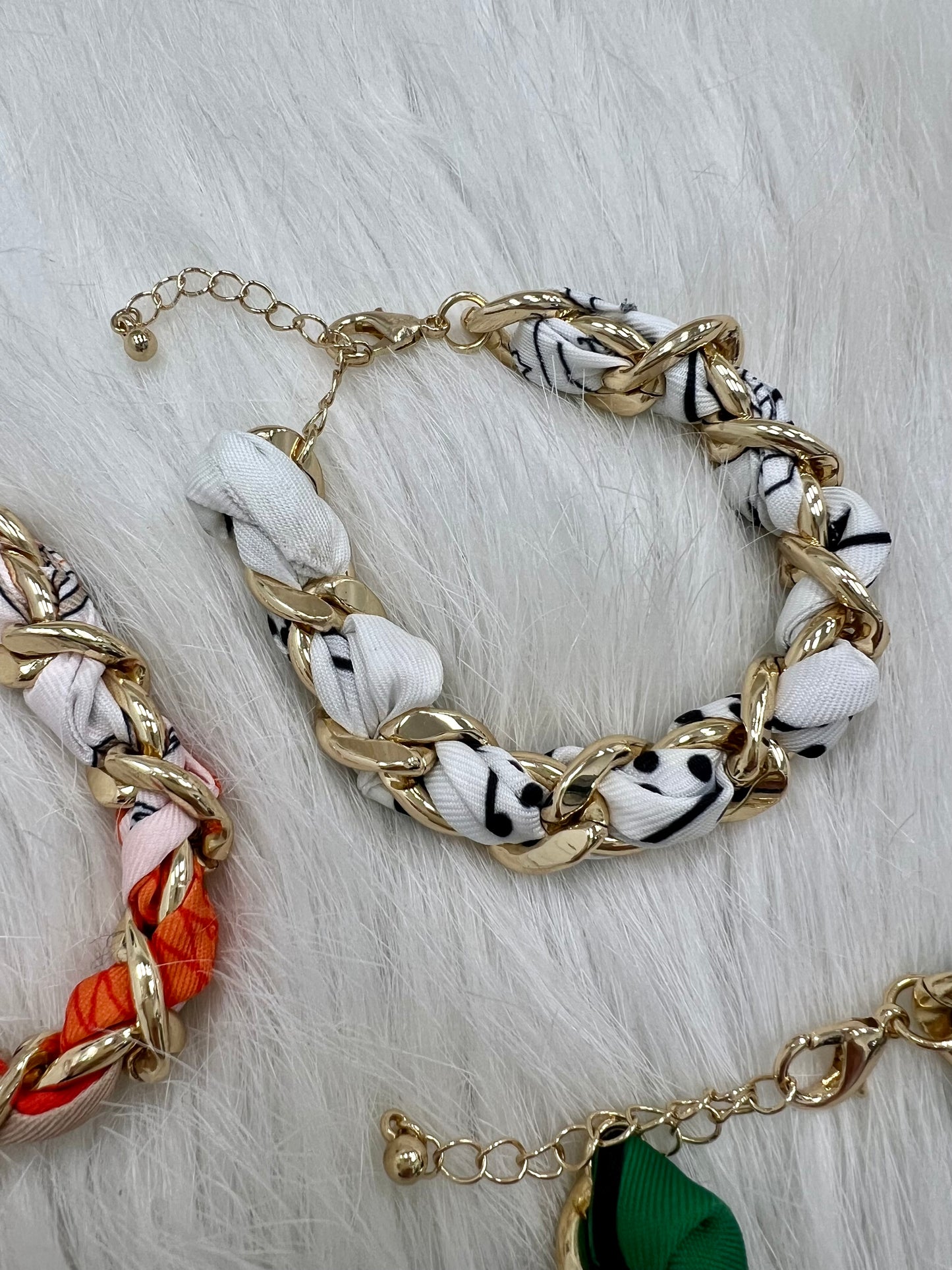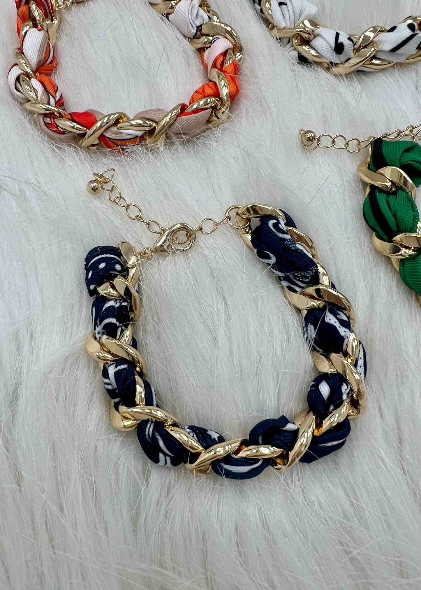 Scarves as jewelry is now trending and the perfect way to try it is with our Solara Bracelets! This bracelet is shaped of a classic print scarf intertwined with a gold chain and a lobster clasp closure. This pretty bracelet looks great on its own or mixed with your other favorites!
