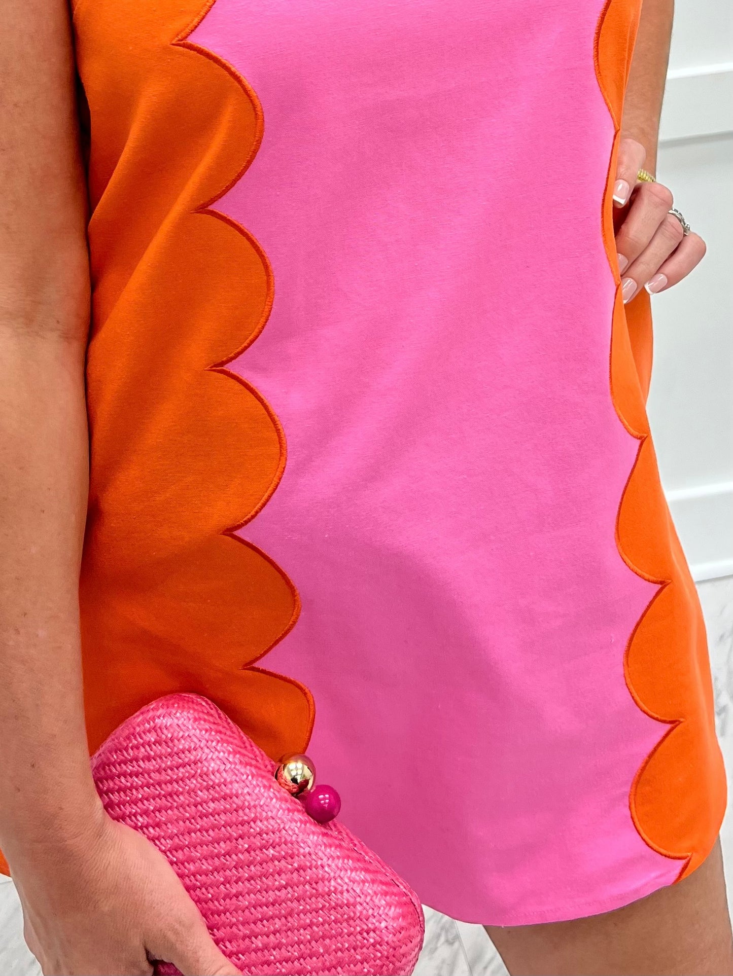 All of the heart eyes for this darling little dress Woven fabric in a pink + orange shapes this sleeveless dress featuring a round neckline, scallop detailing and side slit pockets. This shift style dress has a zipper closure at the back neckline. Just add chic shoes and stunning accessories for an unforgettable look! Model is 5'8'' and wearing a size small.