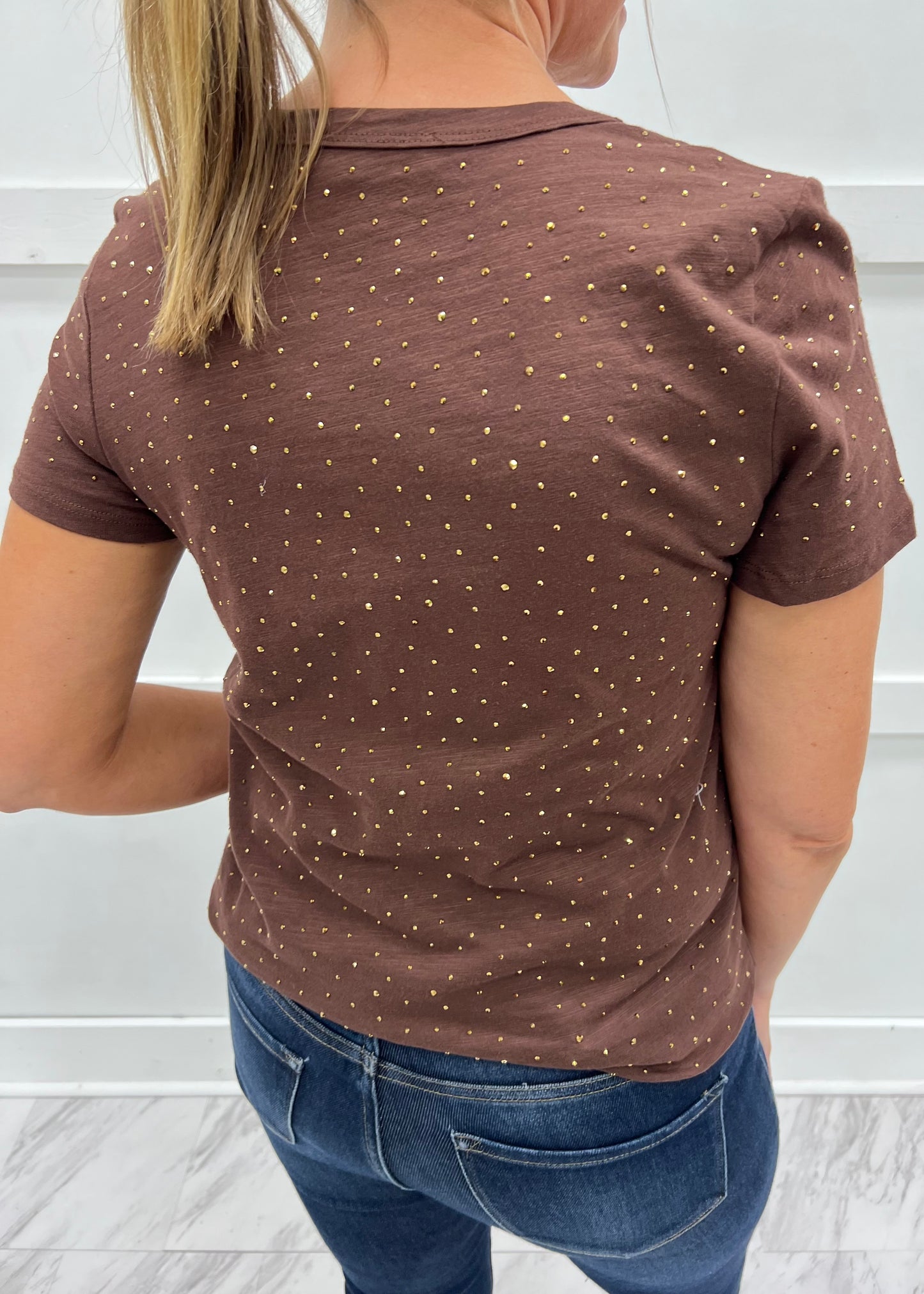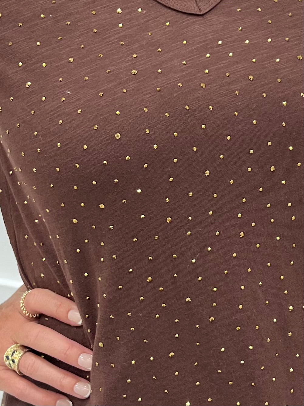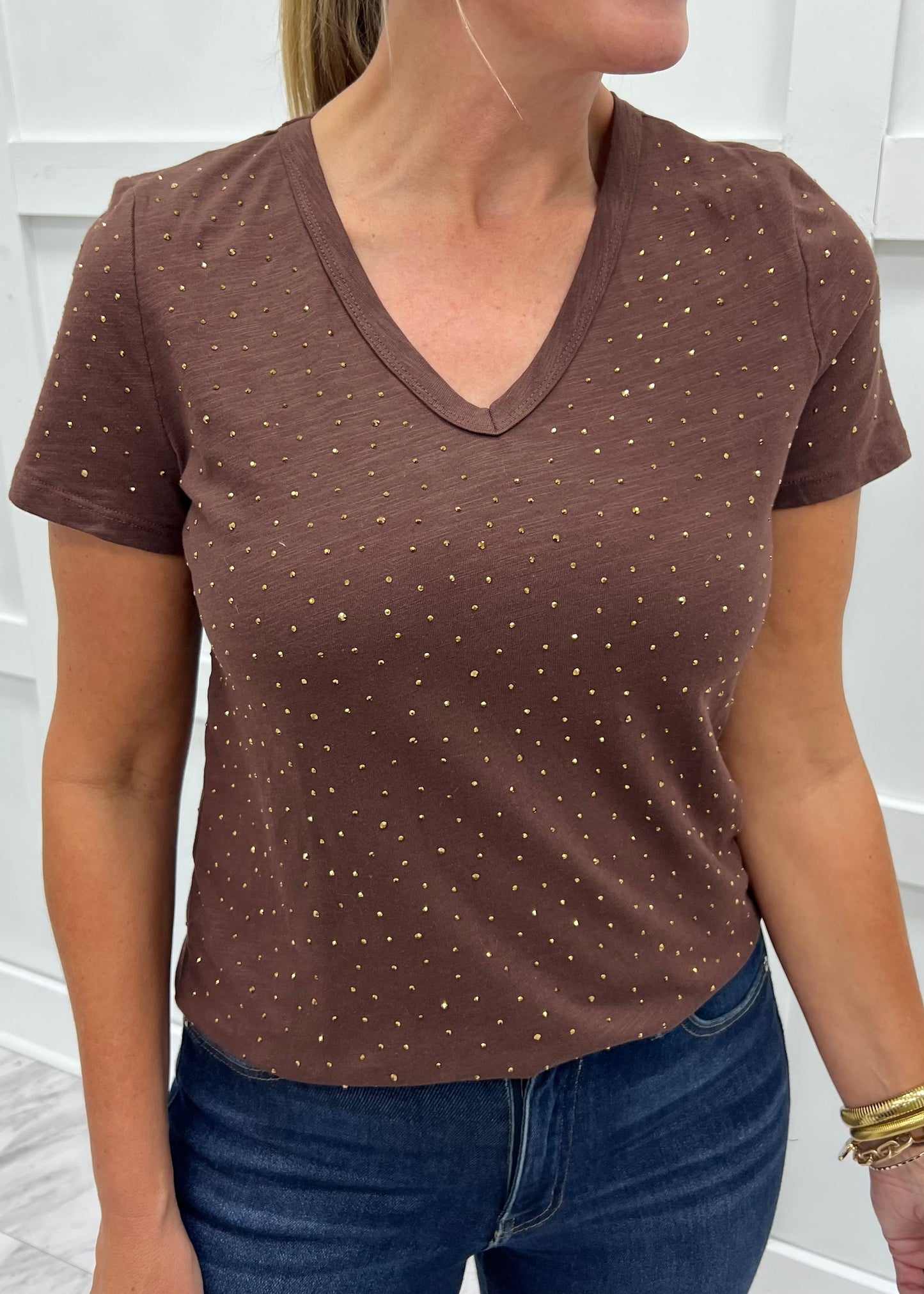 Upgrade your go to v.neck with this luxe style... we are in love with this sweet little top with a touch of sparkle! Soft and stretchy chocolate colored knit fabric with tiny bronze colored rhinestone embellishments shapes this top featuring a v.neckline, short sleeves and relaxed fit. Wear this one on it's own with denim and a belt or a the perfect base layer under blazers, jackets and cardigans! Model is 5'8'' and wearing a size small.
