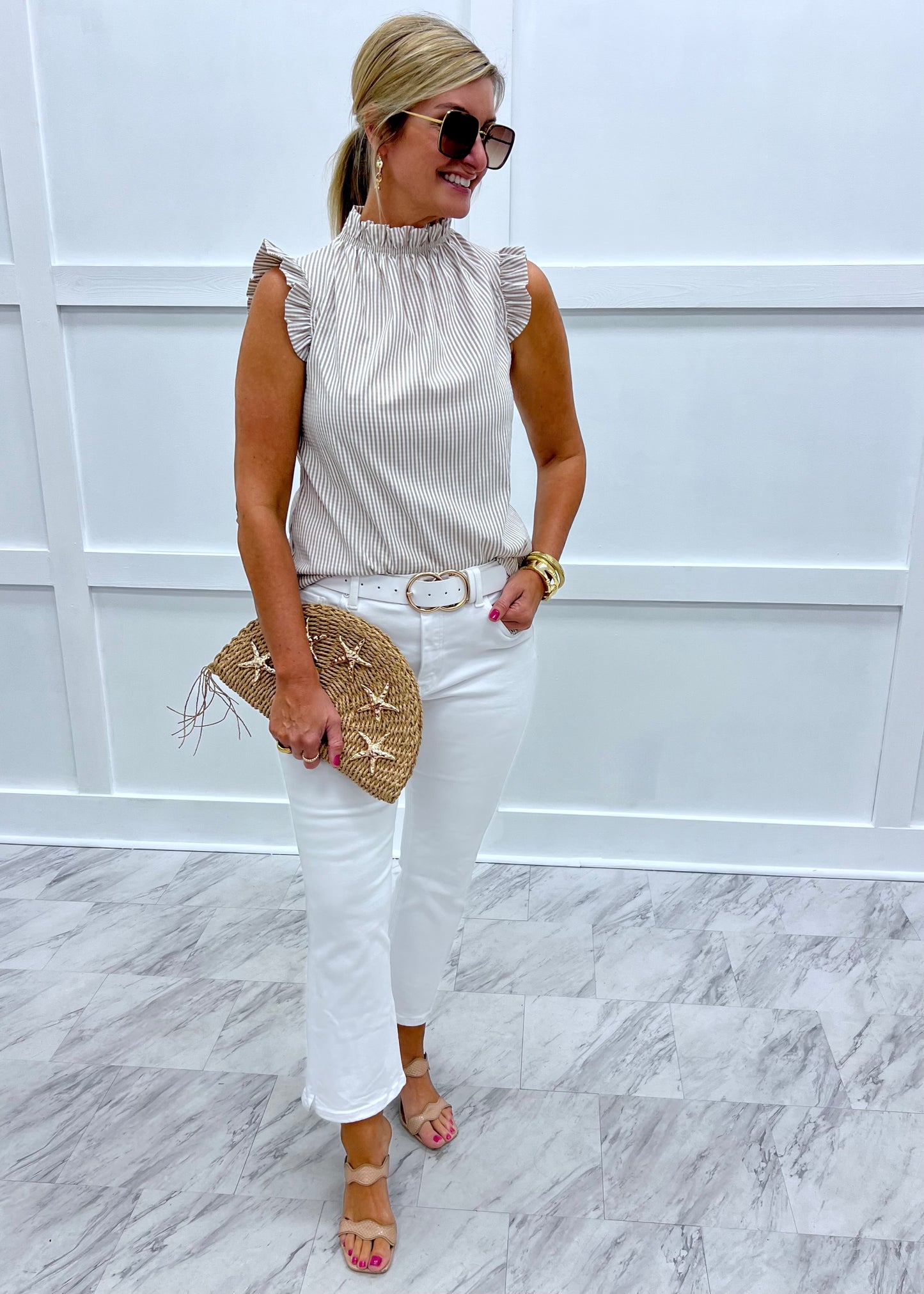If you couldn't already tell we love a good ruffle detail! This darling little top is made of seersucker woven fabric in taupe and white stripes and has a ruffle detail at the neckline and along the arm holes. This relaxed fit style has a small keyhole at the back neckline with a single pearl button closure. This top is perfect for work or play, depending on how you style it! You will be reaching for this one all summer long! Model is 5'8'' and wearing a size small.