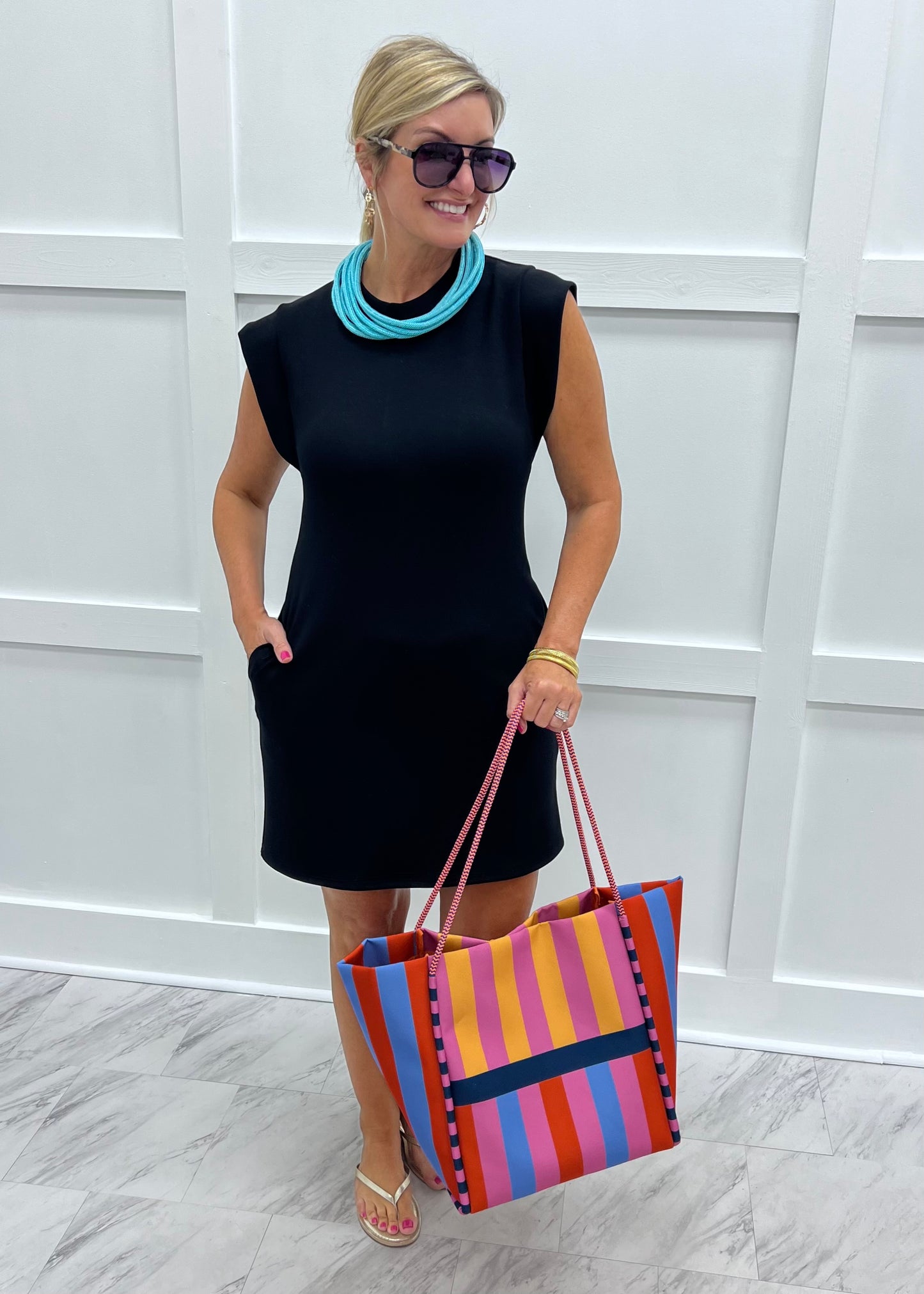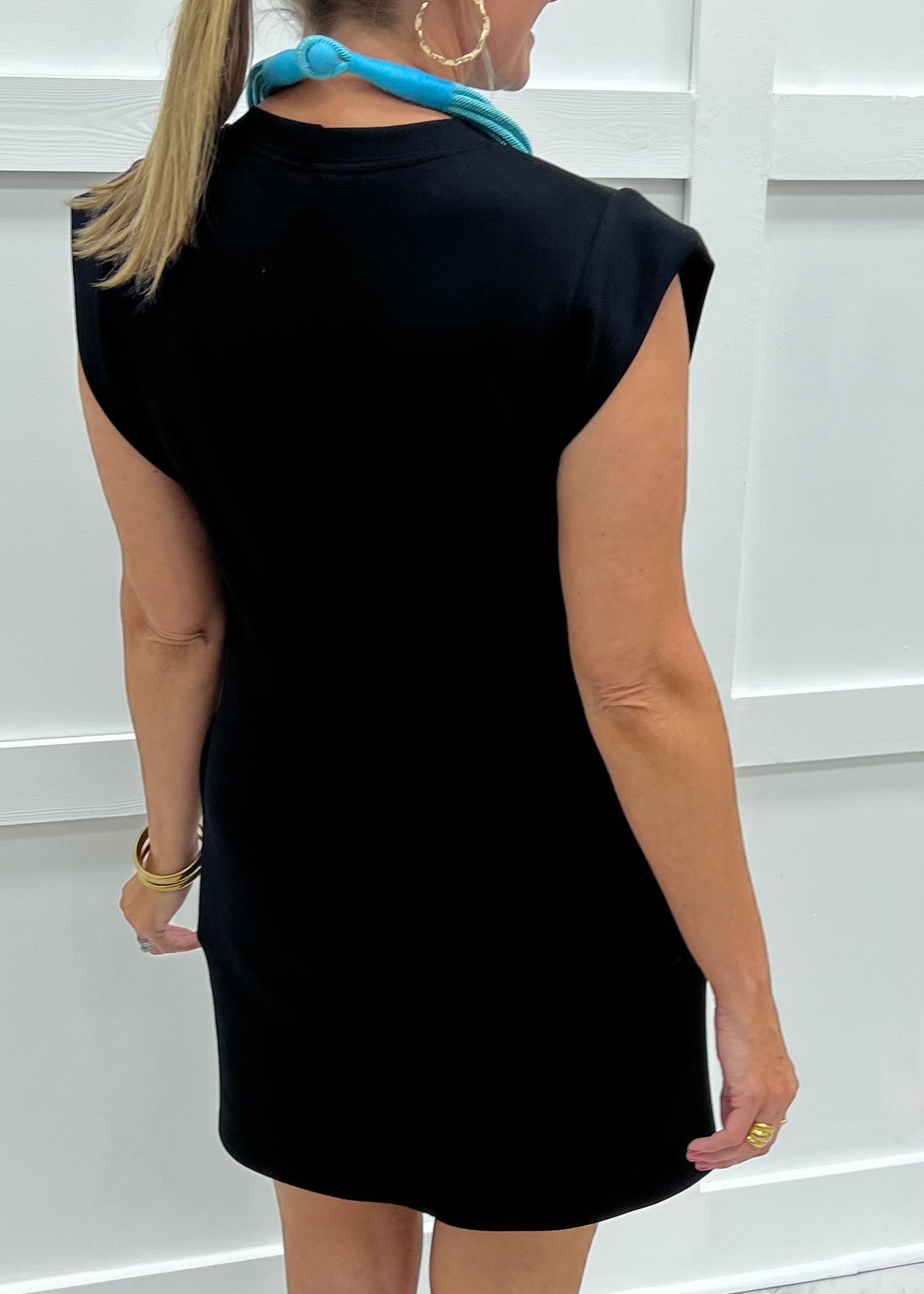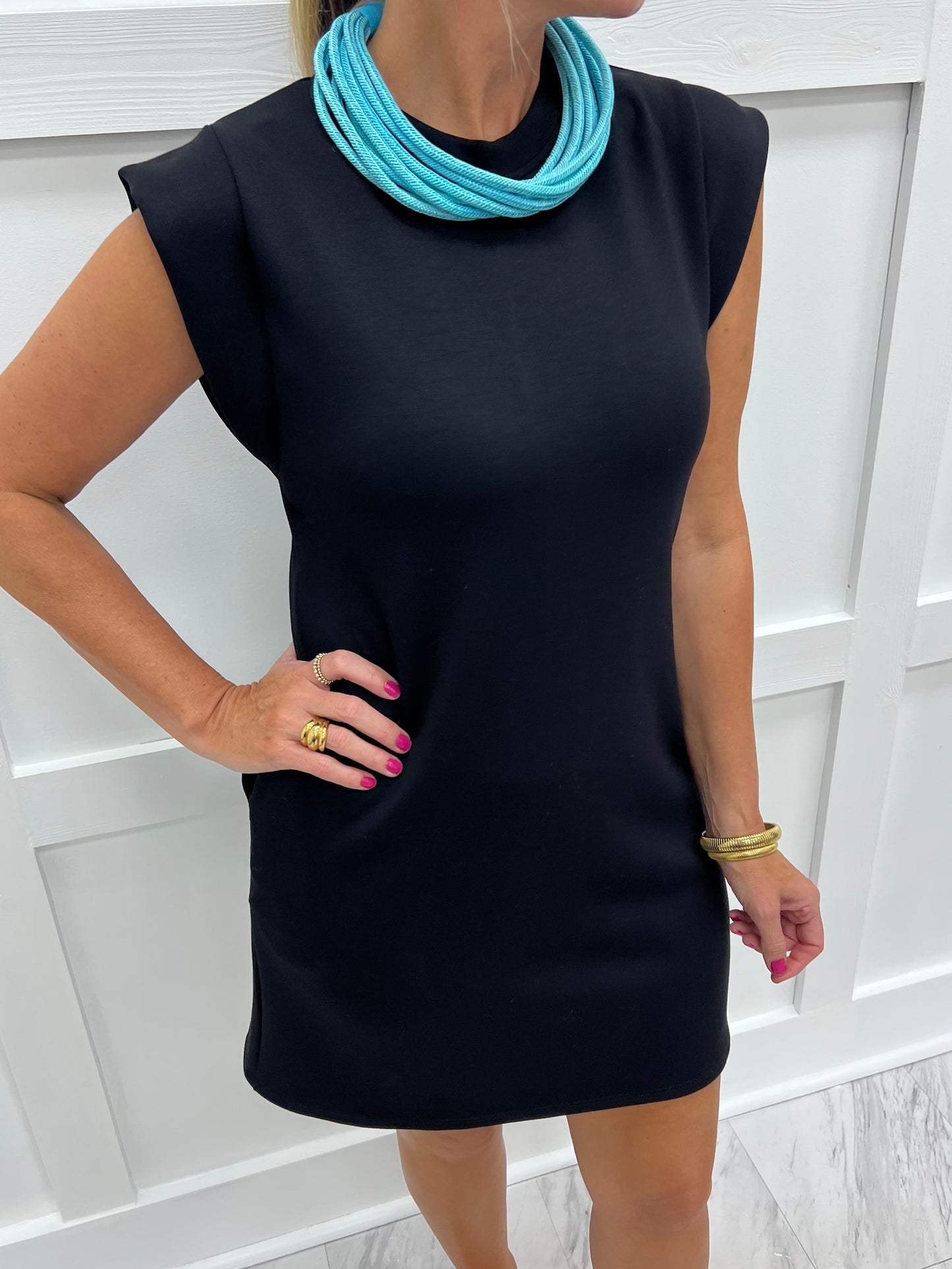 Feel luxe while you take on the day super cute + super comfortable dress. Black colored scuba fabric, that feels dreamy, shapes this dress featuring a round neckline, cap sleeves with a modesty piece under the arm, side slit pockets and a relaxed fit. This easy to love style will be a welcome addition to your weekend wardrobe! Model is 5'8'' and wearing a size small.