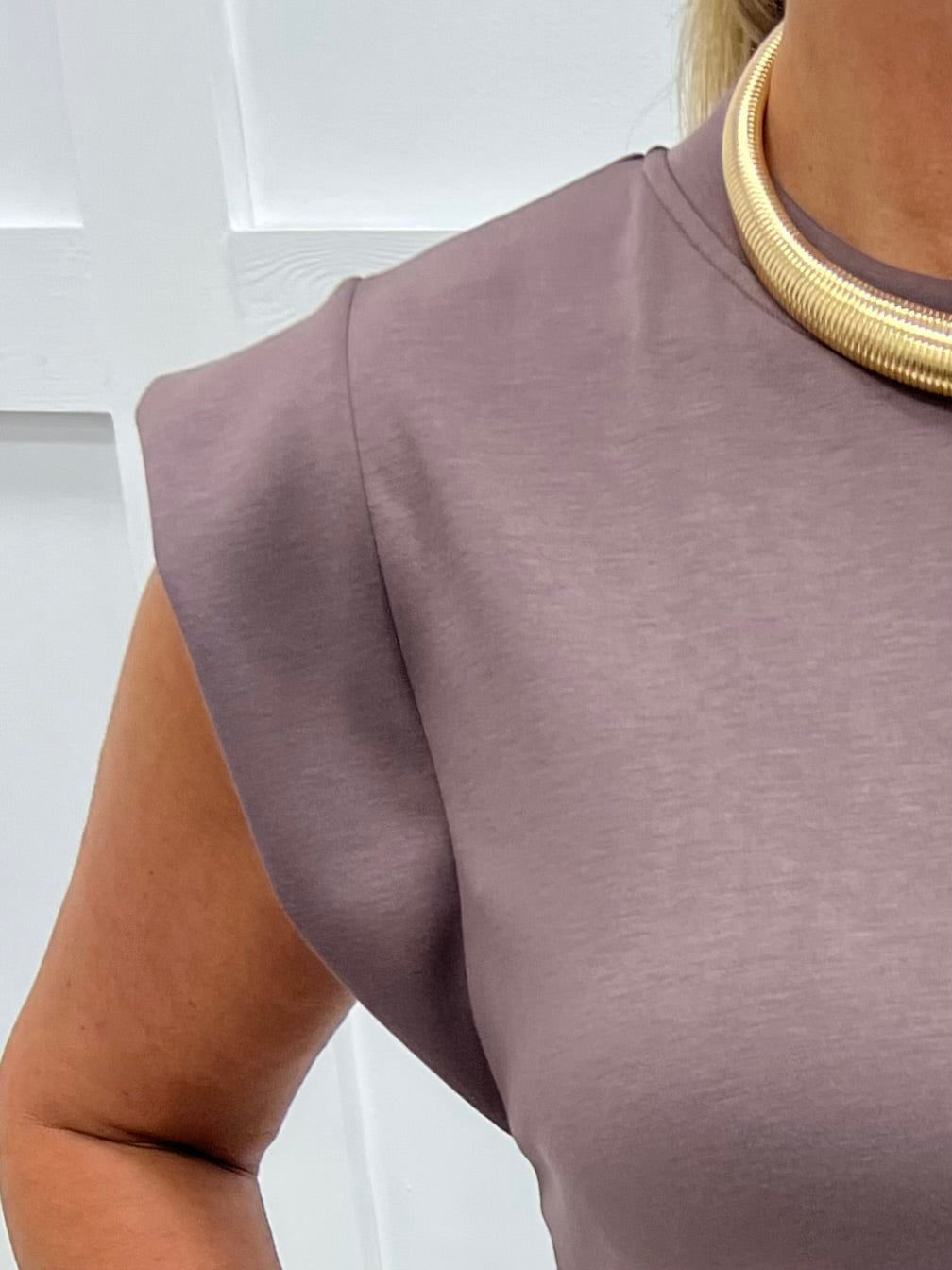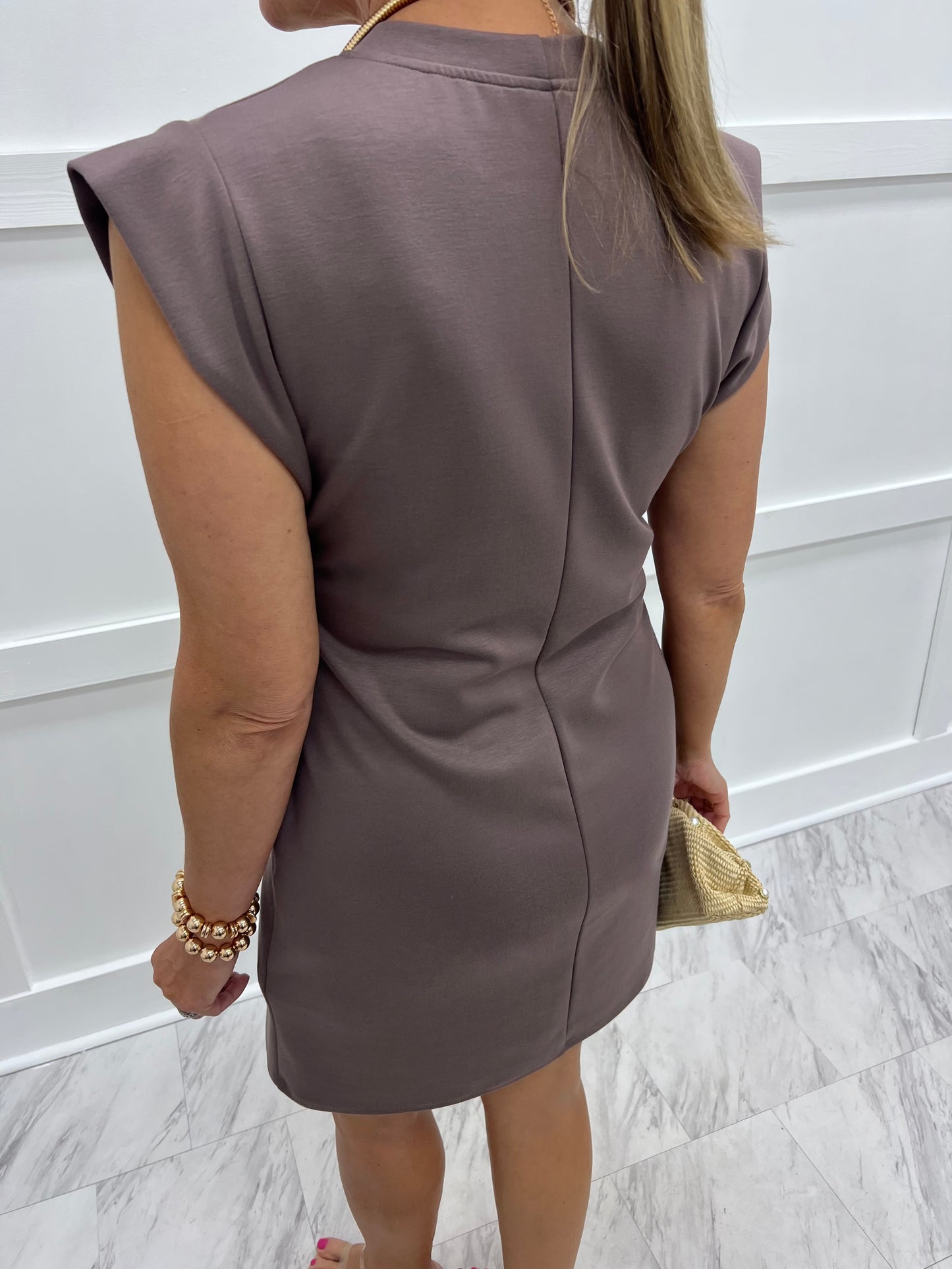 Feel luxe while you take on the day super cute + super comfortable dress. Mocha colored scuba fabric, that feels dreamy, shapes this dress featuring a round neckline, cap sleeves with a modesty piece under the arm, side slit pockets and a relaxed fit. This easy to love style will be a welcome addition to your weekend wardrobe! Model is 5'8'' and wearing a size small.