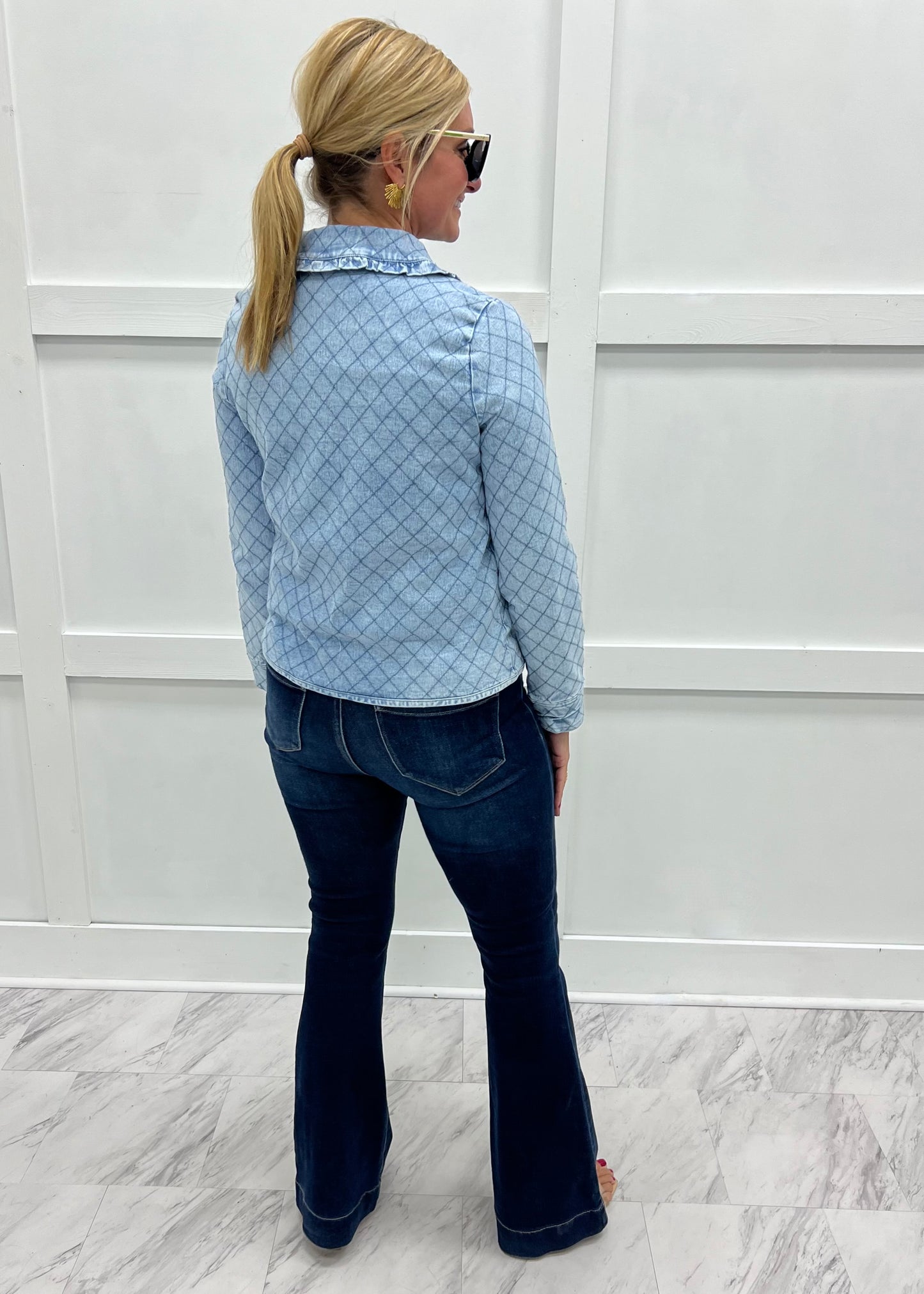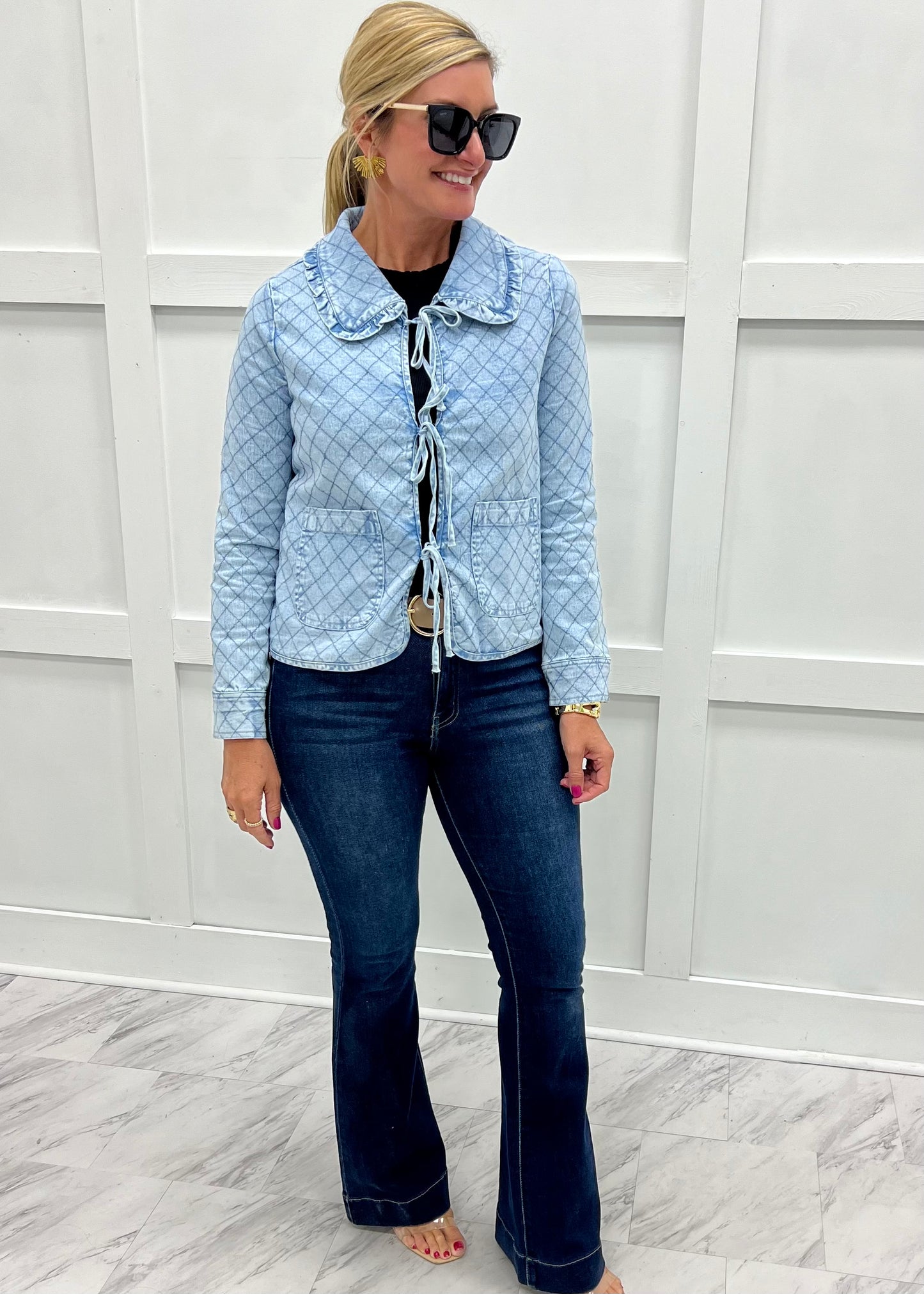 Your denim jacket gets an upgrade with the addition of our Worth Jacket! Lighter wash denim fabric with stitch detailing shapes this jacket featuring a peter pan collar, long sleeves, 2 patch front pockets and open front with three self tie bow closures. This jacket has the most adorable floral print lining and is just as comfortable as it is cute! Wear it with with pants, skirts and over dresses... you will love styling this one! Model is 5'8'' and wearing a size medium.