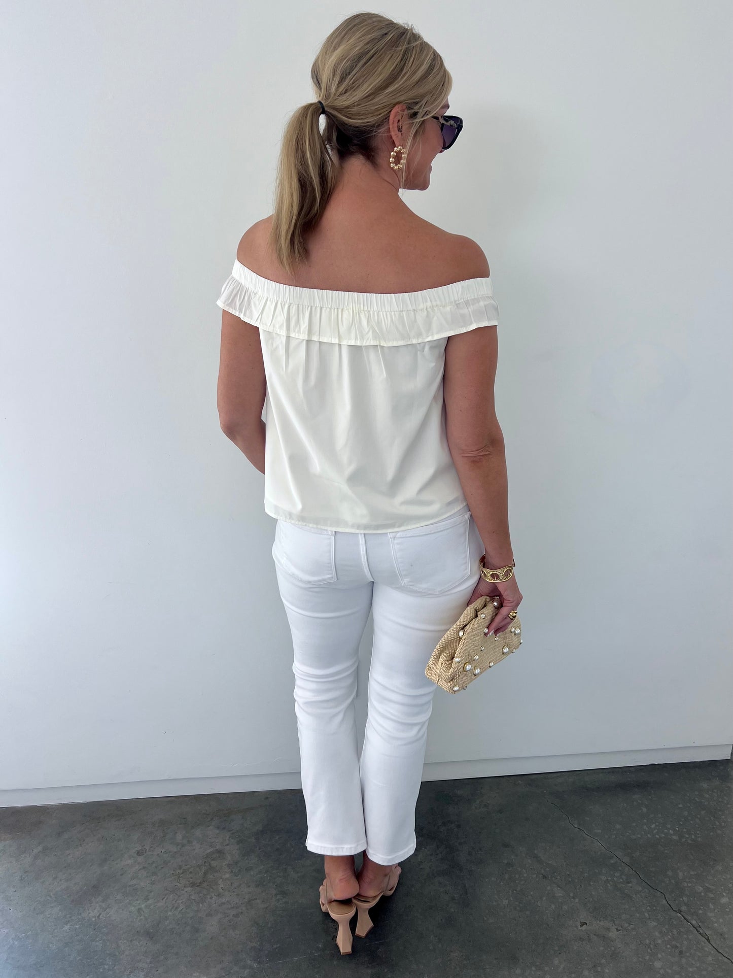 Make a style statement in this unique top that is sure to turn heads! Beige colored fabric shapes this top featuring an elasticized off-the-shoulder neckline, lace detailing on the front with palm trees, pineapples and shells. This one will be a welcome addition to your warm weather wardrobe... we can't wait to see how you style it! This top is lined. Model is 5'8'' and wearing a size small.