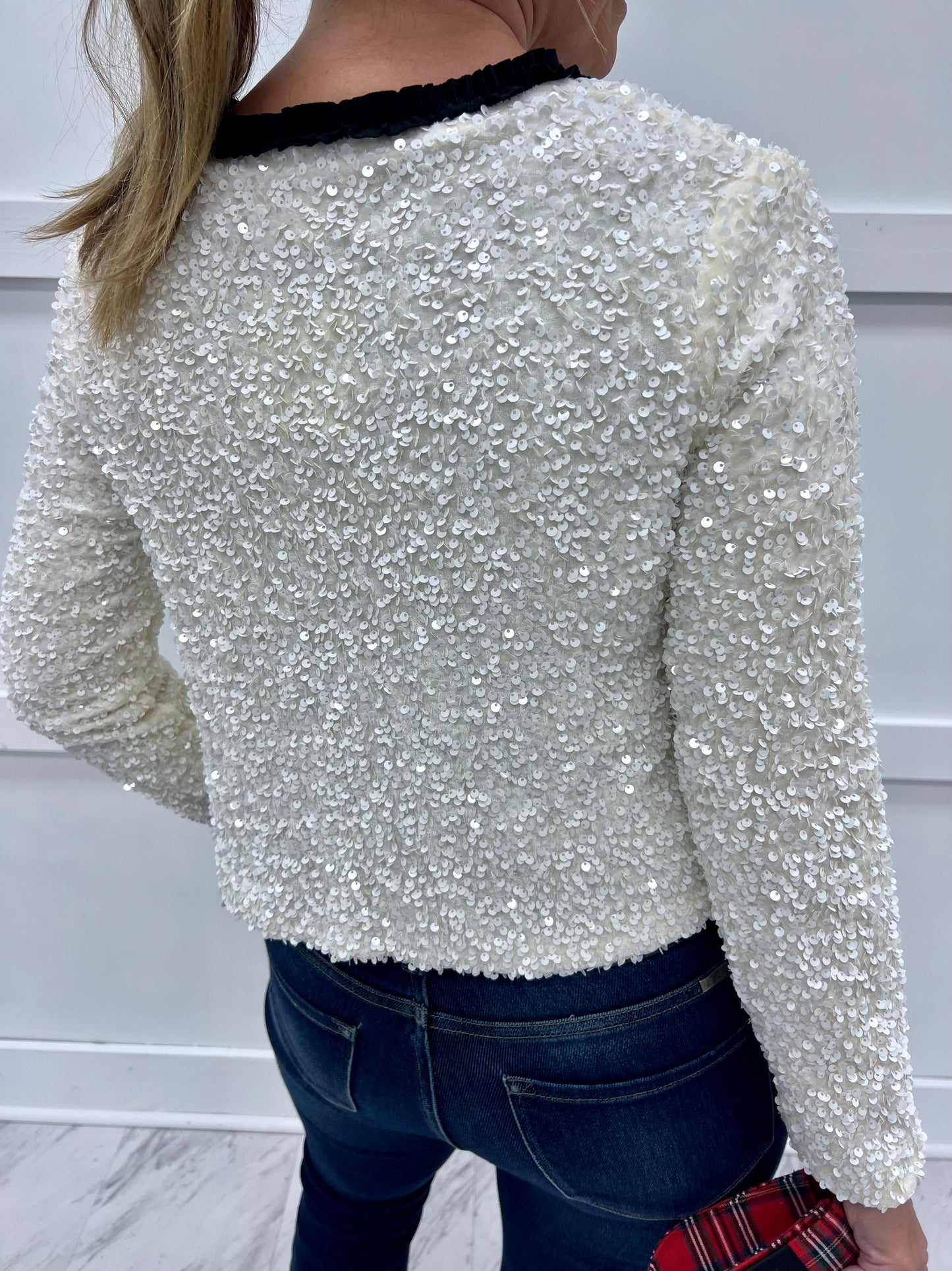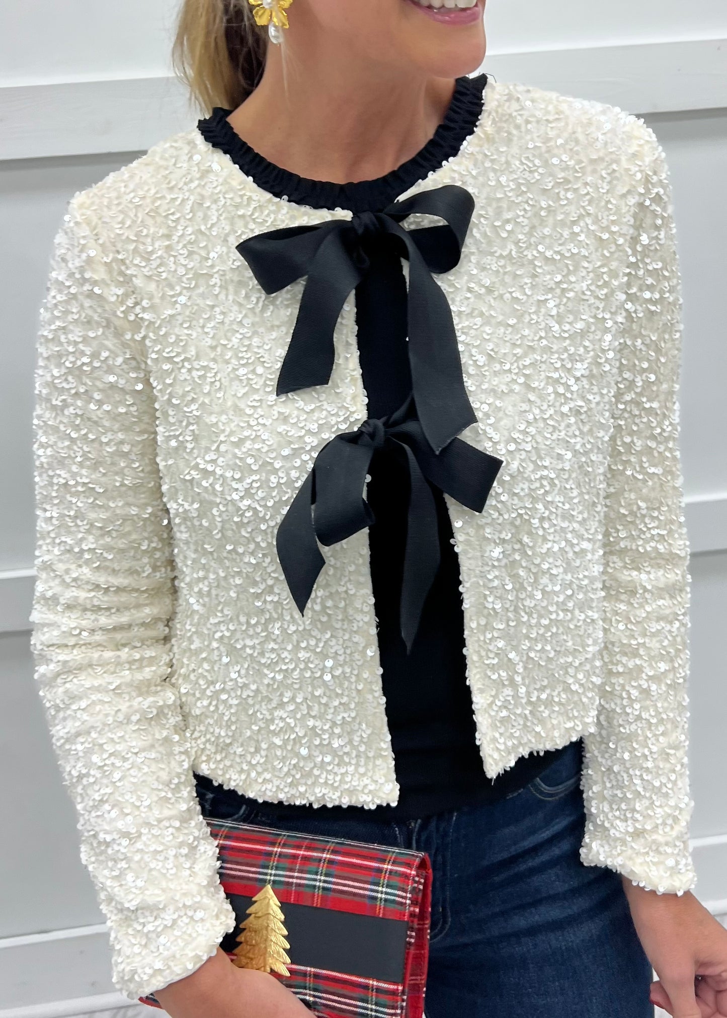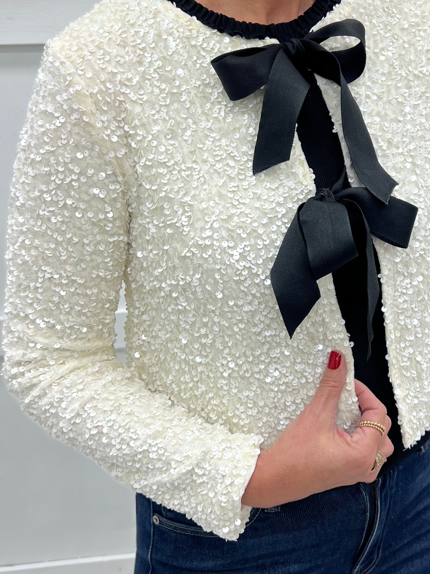 Look party perfect in an instant when you wear this chic cardigan. Ivory colored textured fabric with shimmering sequins shapes this cardigan with long sleeves and two self tie black bow closures. This one looks great with denim, skirts or dresses and will be the perfect additional to your closet. Wear this one for any festive occasion! Model is 5'8'' and wearing a size small.