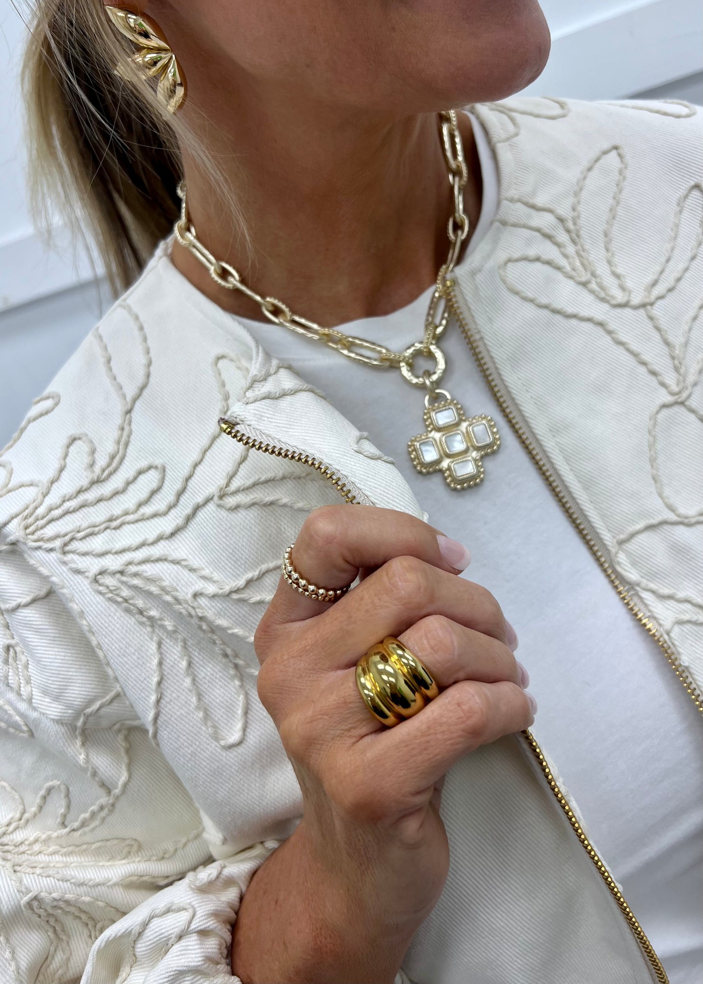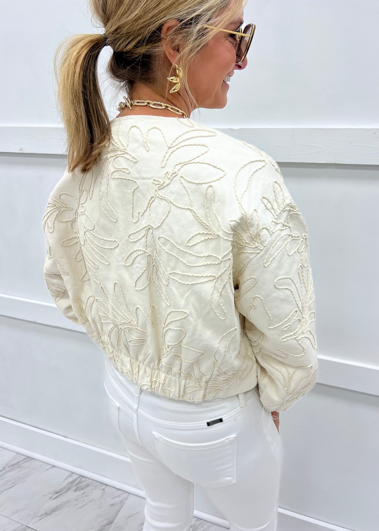 When you need a chic layer, slip on our Chloe Jacket and take the look to the next level! This cream colored jacket with abstract embroidery features a round neckline, side pockets, a gold zipper, long sleeves that are elasticized at the wrists, and an elasticized waistline. We are in love with this jacket, the perfect mix of classic and on trend! We will wear this one with everything for denim to dresses! Model is 5'8'' and wearing a size small.