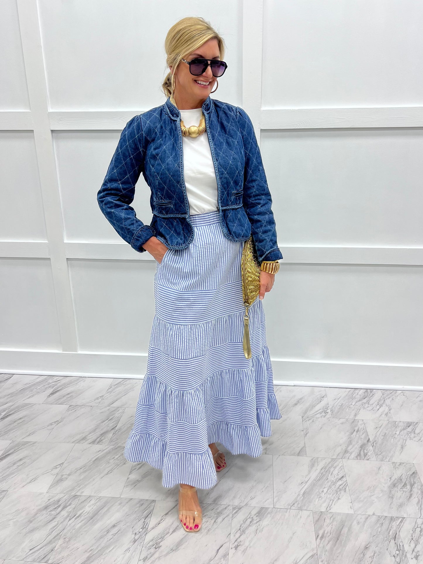 Update your go to jacket with this denim style that is right on trend! Medium wash denim fabric with quilted detail shapes this jacket featuring a zip front closure, long sleeves, faux front pockets and a peplum style fit. This easy to wear style looks great with just about everything and we can't wait to wear style it with pants, skirts and dresses! Model is 5'8'' and wearing a size medium.