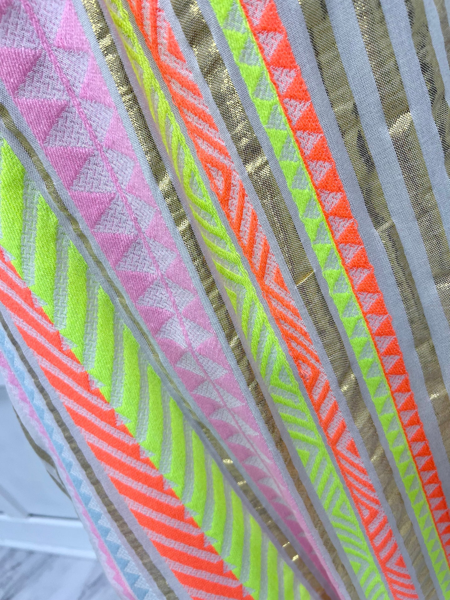 You will feel like you are on a tropical vacation as soon as you slip on these pants! Pants that are chic and easy to wear, featuring a flat front waistband with a band of elastic in the back, side slit pockets and wide flowing legs. This luxe fabric in an abstract print in light blue, bright orange, bright yellow, pink and shimmering gold stripes. Pairs well with denim or solid tops, a pair of statement earrings and a fun clutch! Pants are fully lined. Model is 5'8'' and wearing a size small.