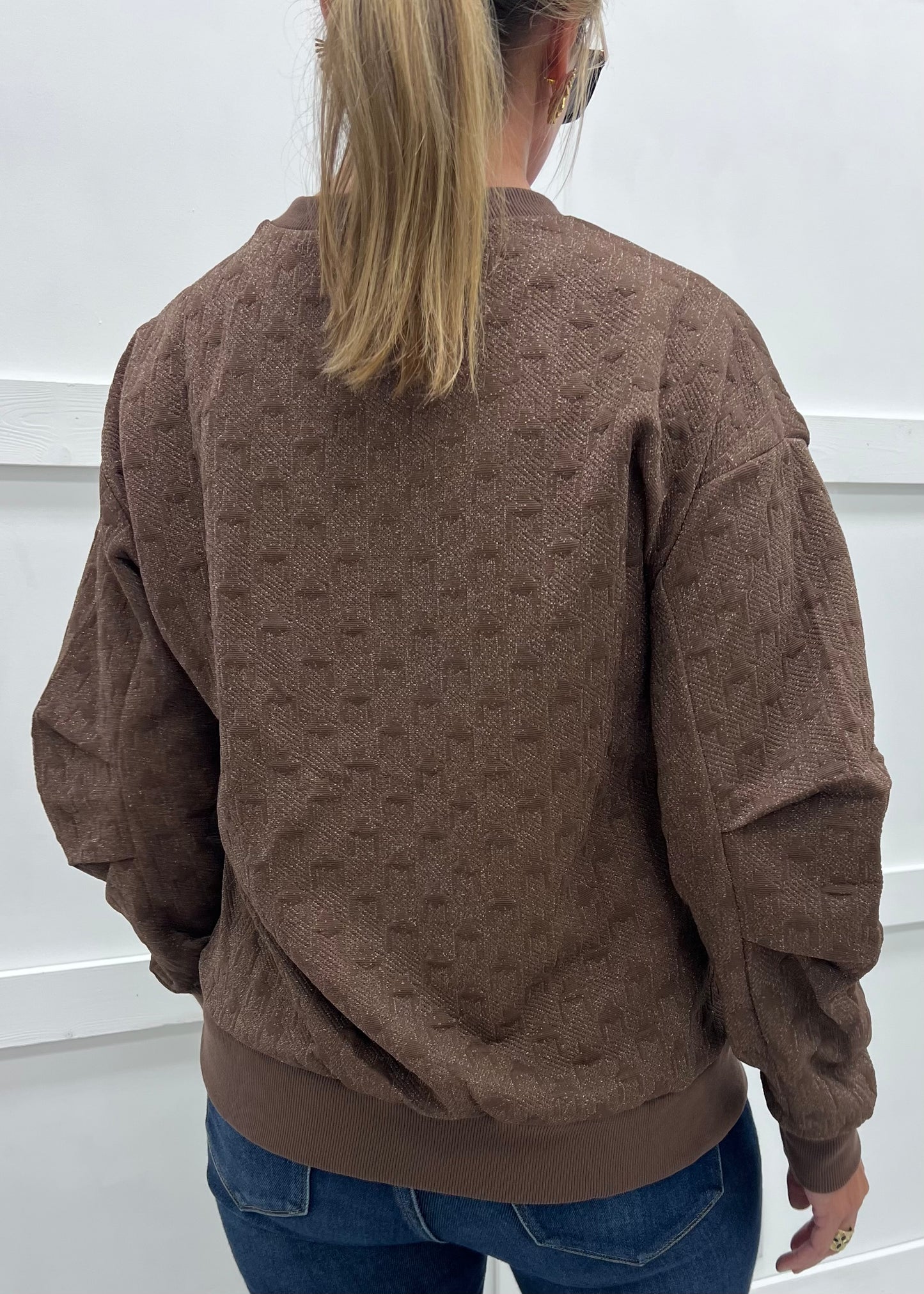 You will instantly fall in love with this dressed up little sweatshirt style top! Soft knit fabric in a pretty shade of brown with a textured design and subtle shimmer detail shapes this style featuring a round neckline, long sleeves with pleat detail at the elbow and banded wrists, and a banded waistline. We love this easy to wear style with denim, leggings or joggers... you will be reaching for this one all of the time! Model is 5'8'' and wearing a size small.