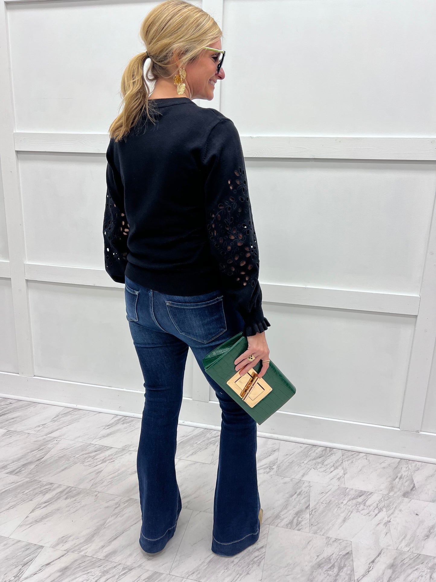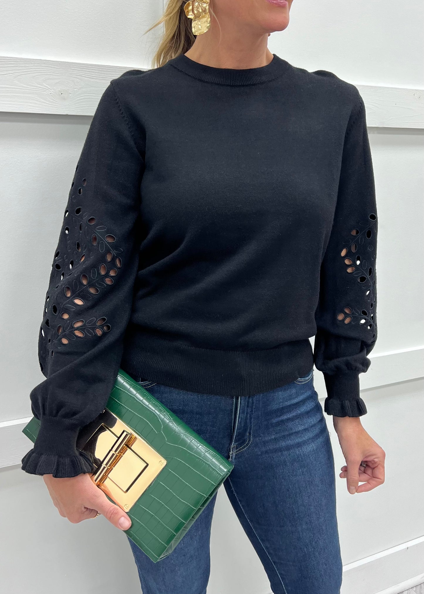 The perfect mix of classic style and on trend, this pretty sweater will easily become a wardrobe favorite! Medium weight sweater knit fabric in black shapes this style featuring a round neckline, long sleeves that are elasticized at the wrists with ruffle detail and eyelet detailing down the sleeves. We simply love this one! Model is 5'8'' and wearing a size small.