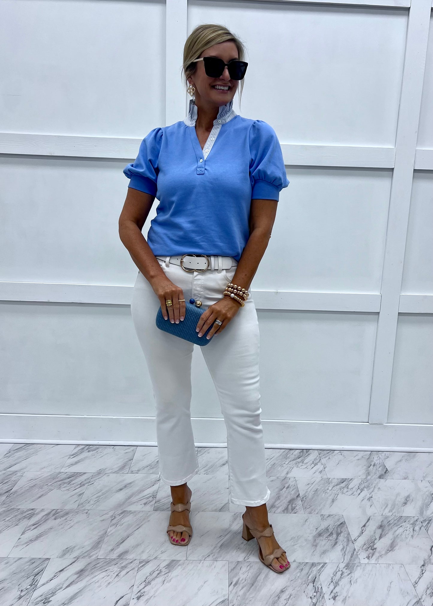 All of the frills in one darling little top! This periwinkle blue colored top is soft and stretchy with a standup collar in blue + white woven fabric, featuring a 4 button closure and short banded puff sleeves + a stripe of the contrast fabric on the back... so cute! It will be love at first sight as soon as you slip it on! Pair with white or dark denim and cute sandals for a chic summertime look! Model is 5'8'' and wearing a size small.