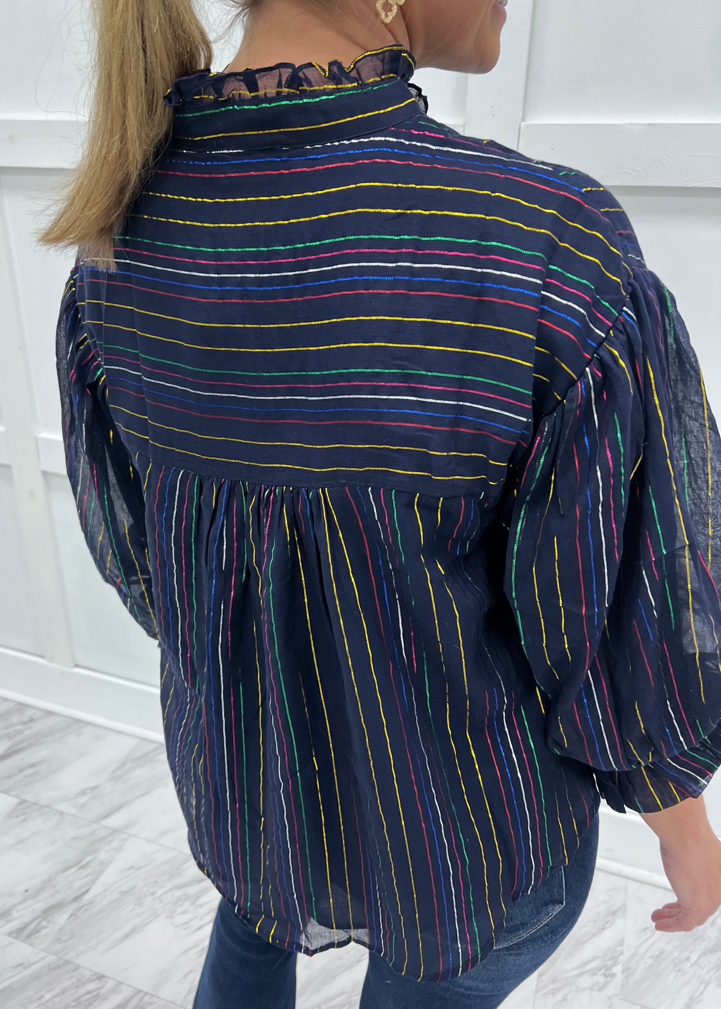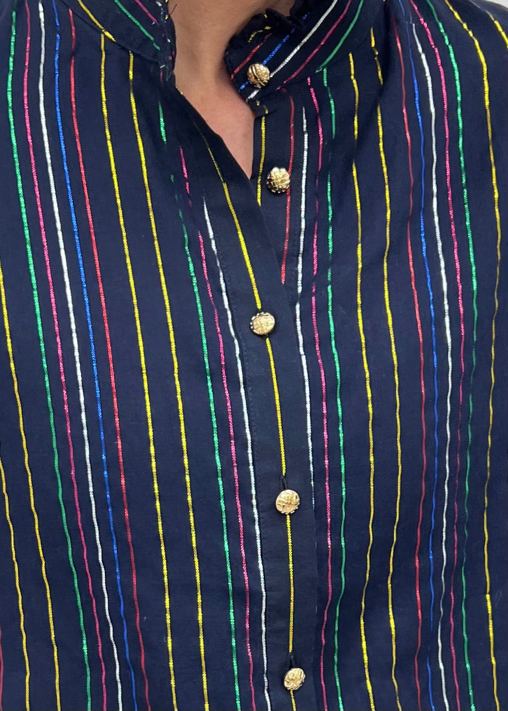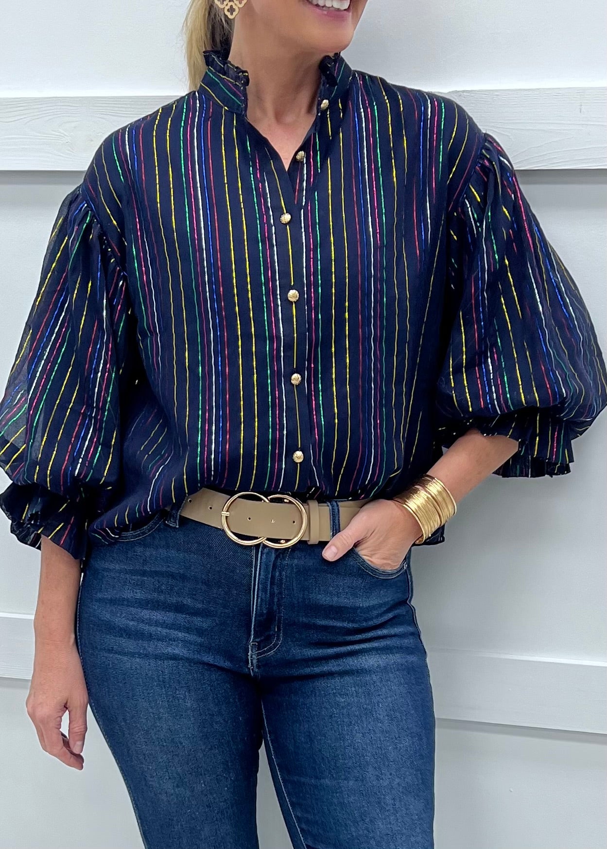 Your social calendar is starting to fill up... make sure you have our Monica Metallic Stripe Top hanging in your closet and ready to go! Navy blue woven fabric with shimmering lurex stripes in gold, red, blue, silver, pink and green shapes this top with a round neckline with ruffle detail, 3/4 length sleeves with trumpet detail and gold textured button front closure. Just add denim and heels and get ready to dance the night away! The body of this top is lined. Model is 5'8'' and wearing a size small.