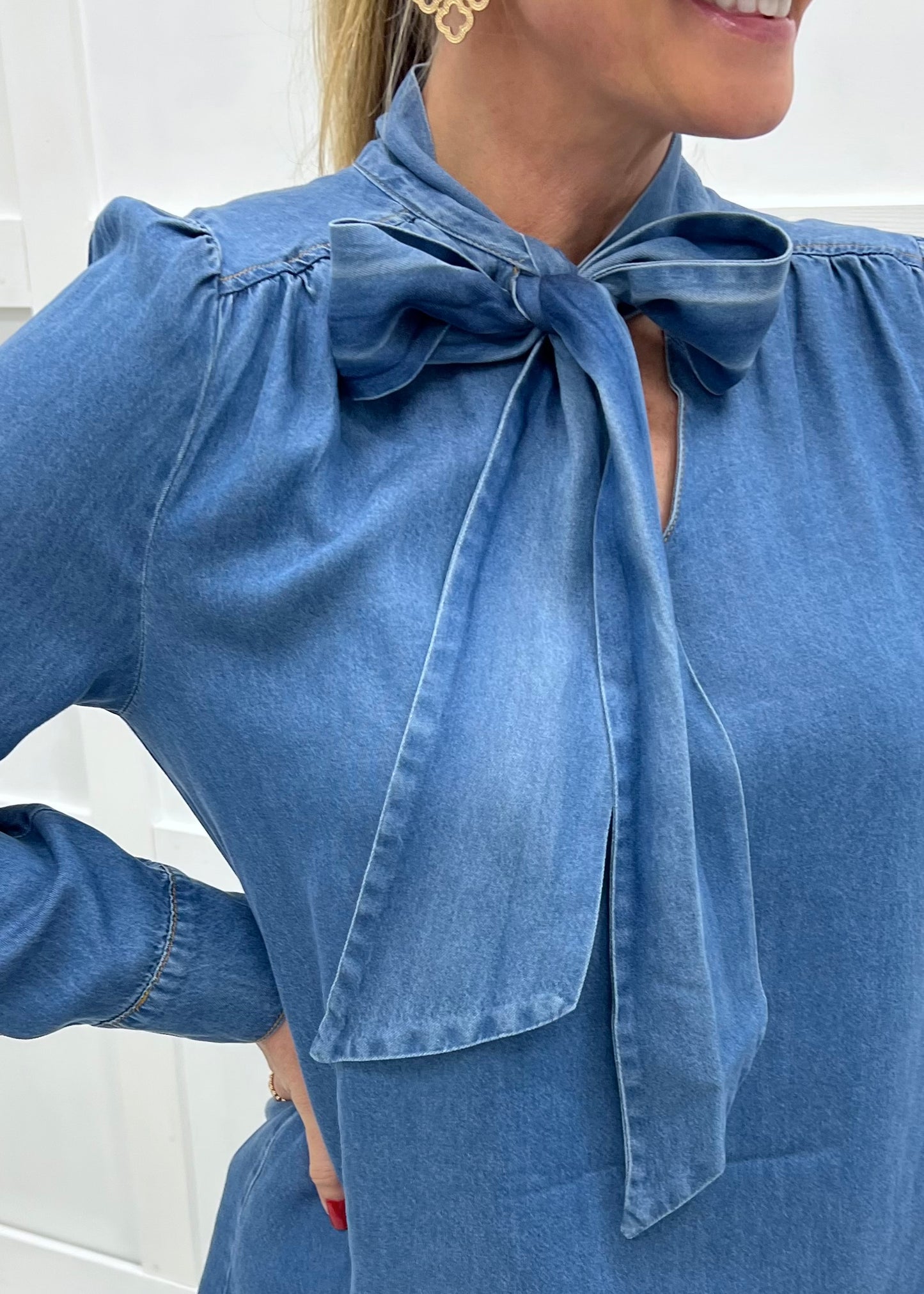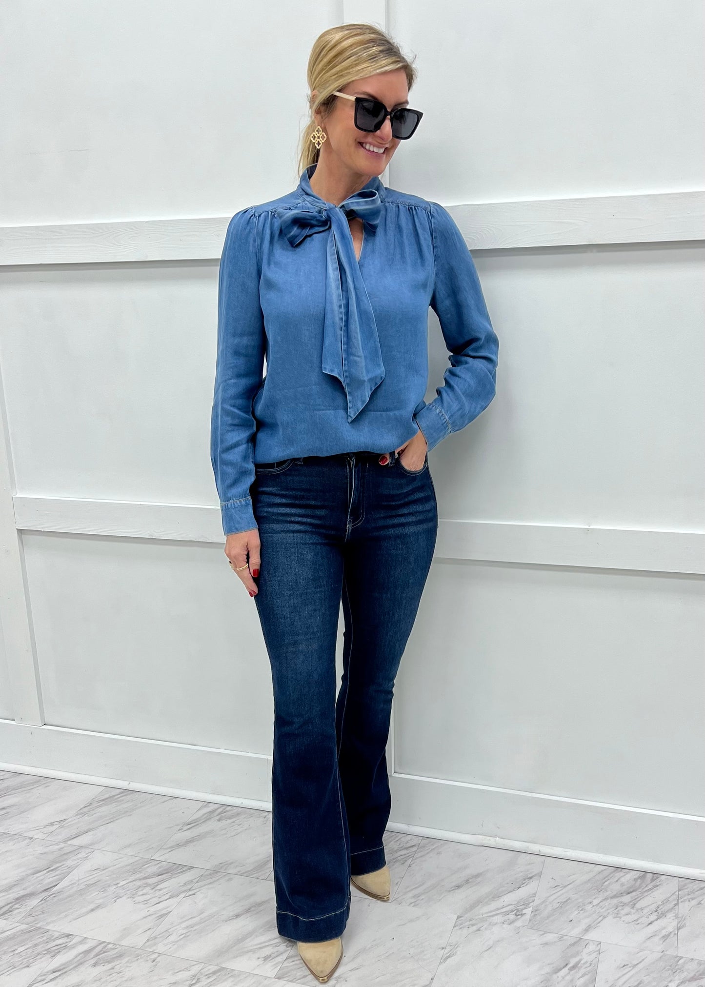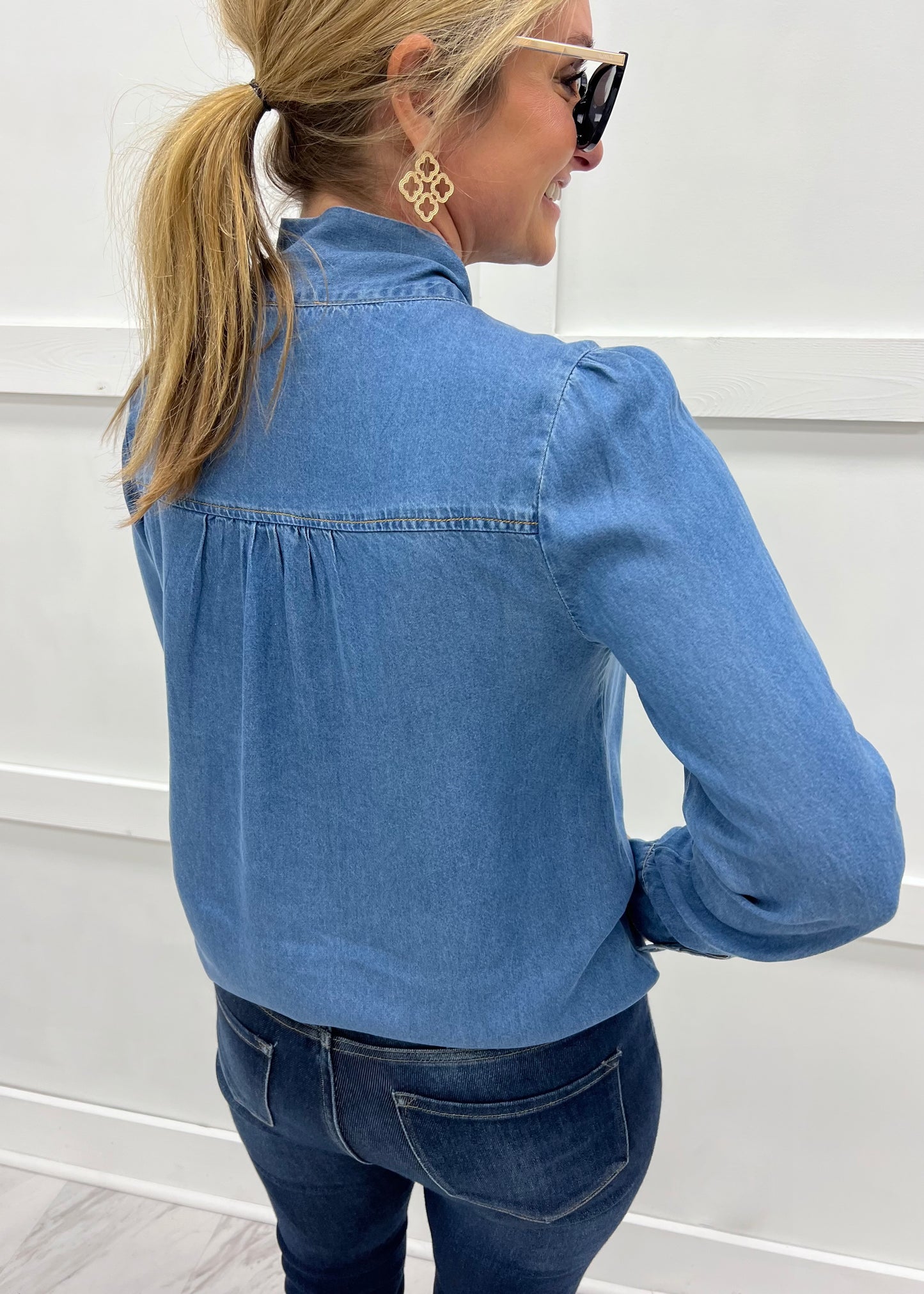So much style in one darling little top... this one is sure to be a welcome addition to your wardrobe! Medium wash chambray fabric with with a v.neckline + self tie bow detail, long sleeves with double button closure and a relaxed fit. This easy to wear style looks great with denim, skirts or trousers and we can't wait to style it all year long! Model is 5'8'' and wearing a size small.