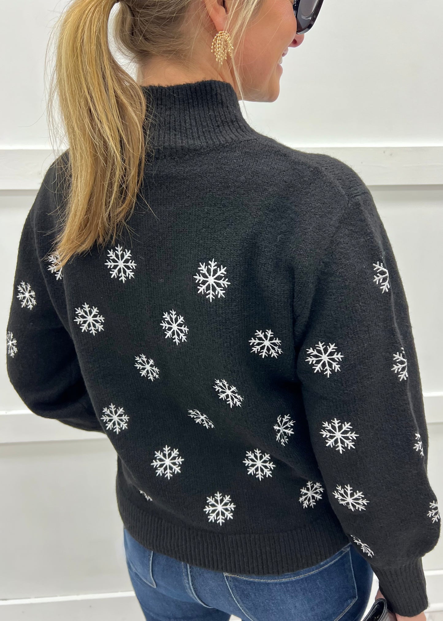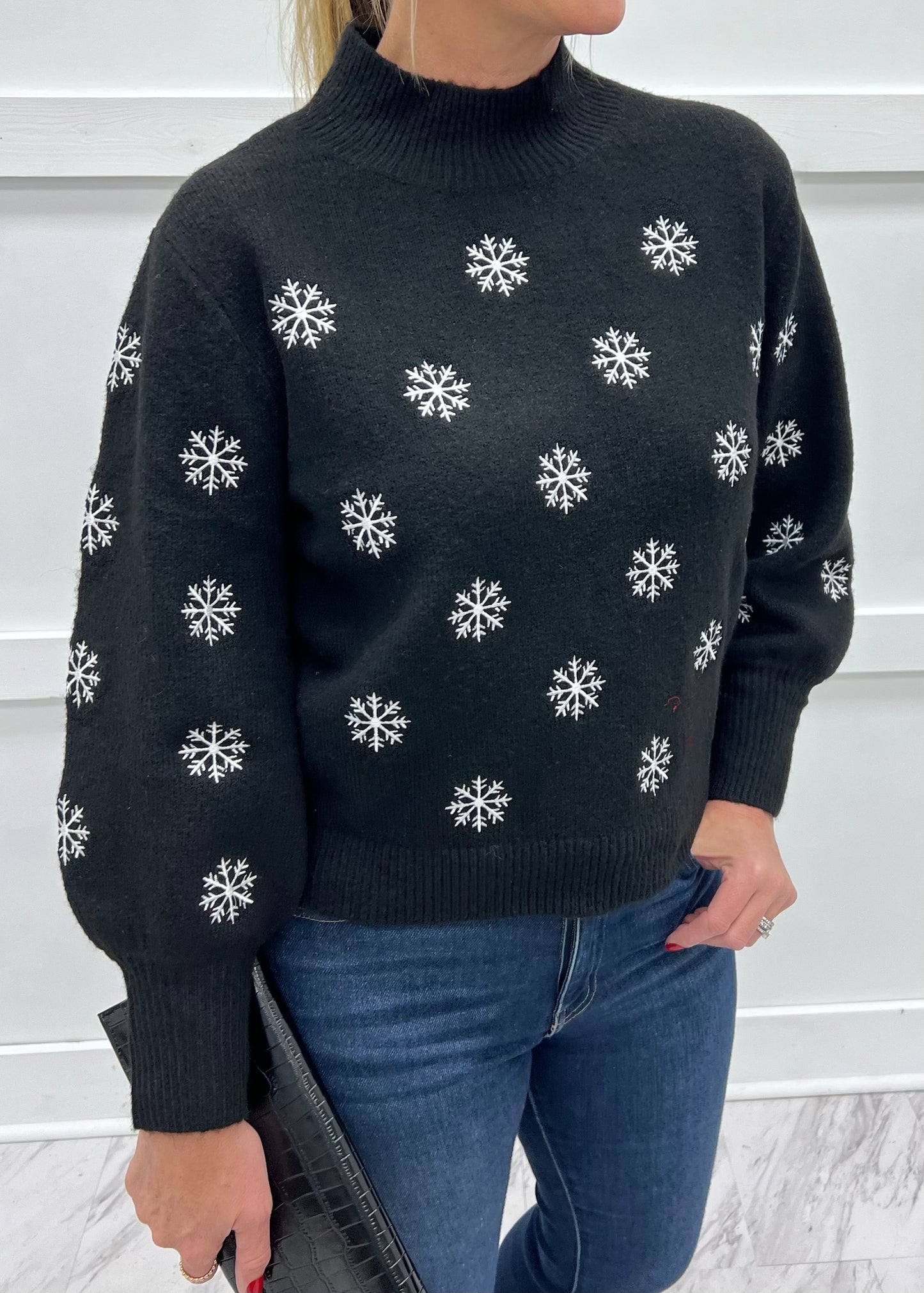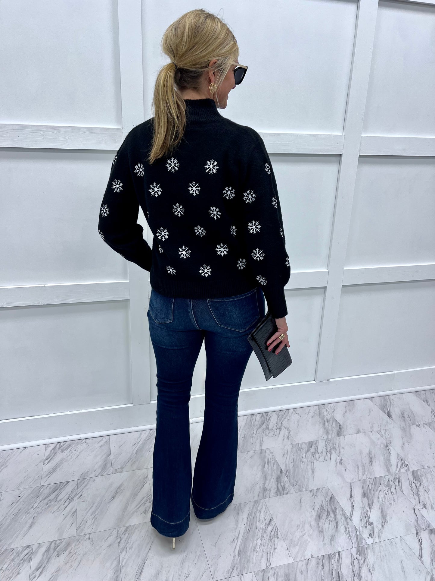 Hey snow bunny, snuggle up in this cute sweater and enjoy the winter vibes! Ultra soft black colored sweater material shapes this style featuring a mock neckline, long sleeves, ribbed detailing at the neckline, wrists and waistline and white snowflake embroidery on the front and back. Look chic while staying cozy in this extra cute style!! Model is 5'8'' and wearing a size small.