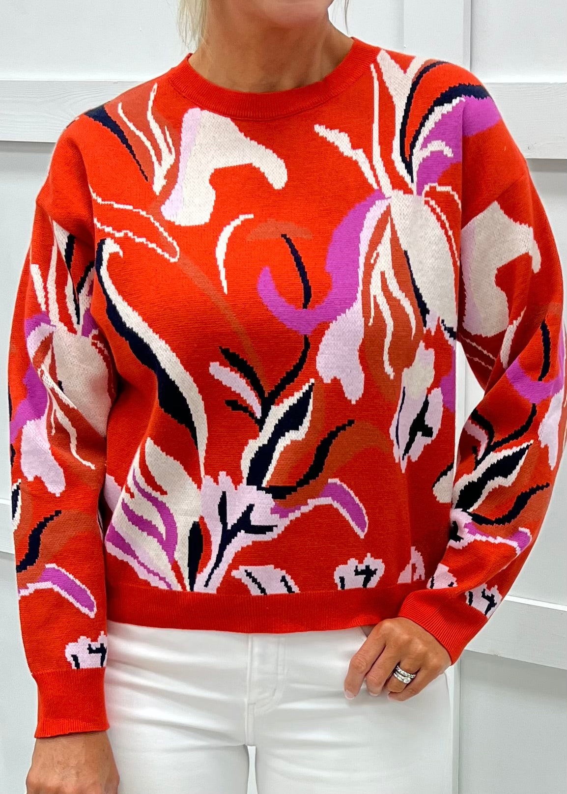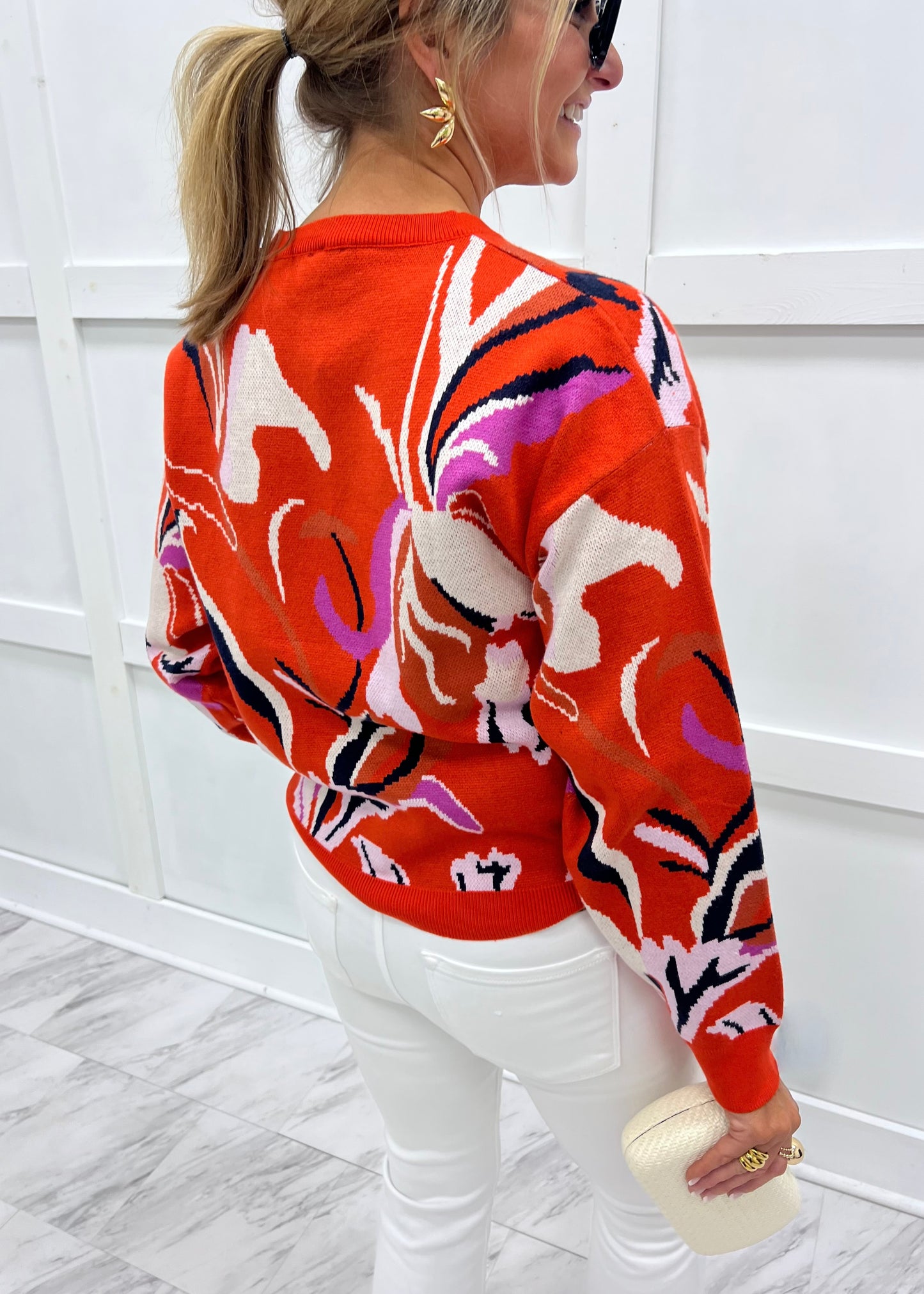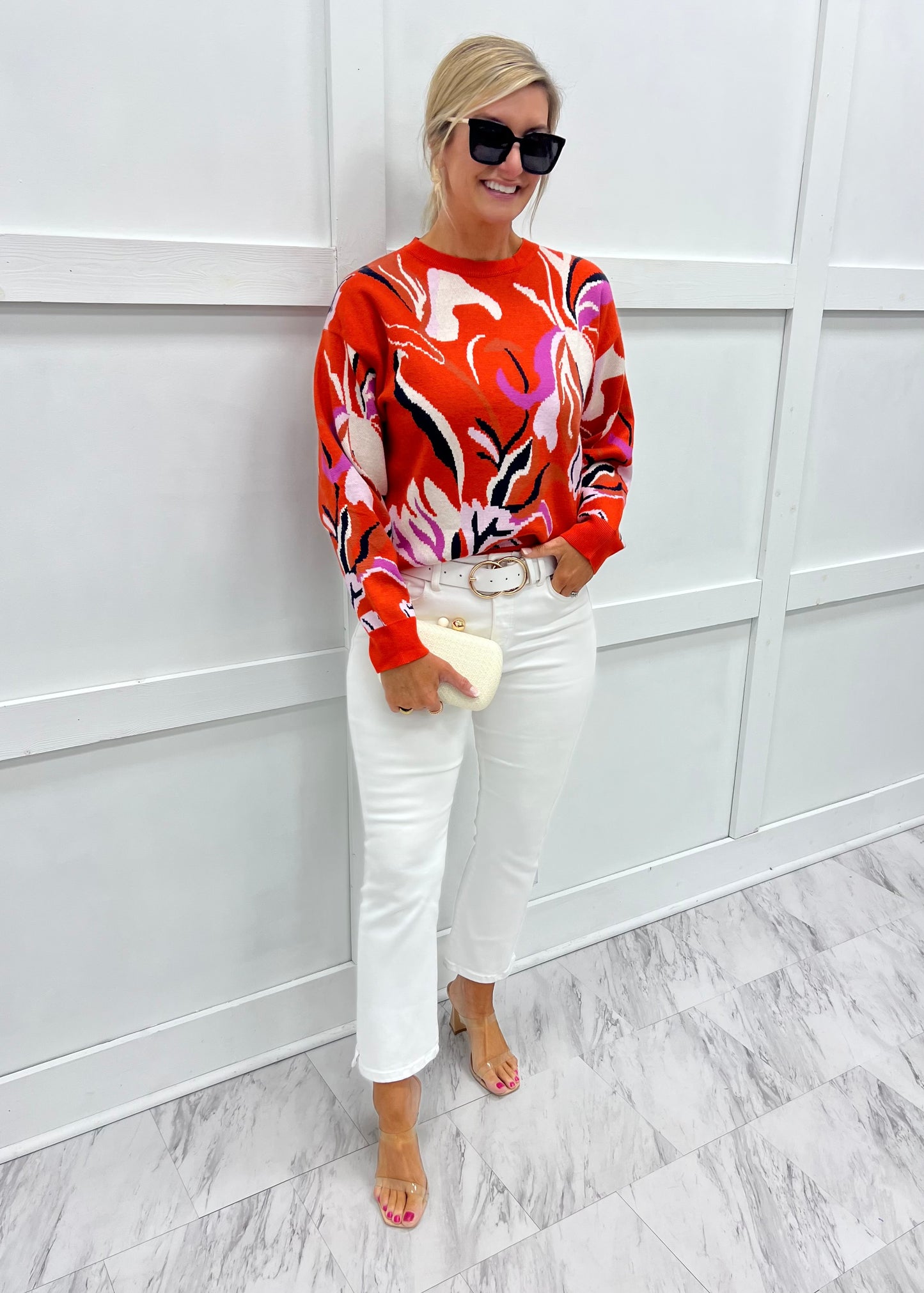 Take your look to the next level with this extra fun sweater! Medium weight knit sweater fabric shapes this sweater featuring a rounded neckline, long sleeves and banding at the wrists. The orange, white, black, and magenta abstract print makes this sweater pop... it is so much fun! This style can be worn for many occasions depending on how you style it! Model is 5'8'' and wearing a size small.