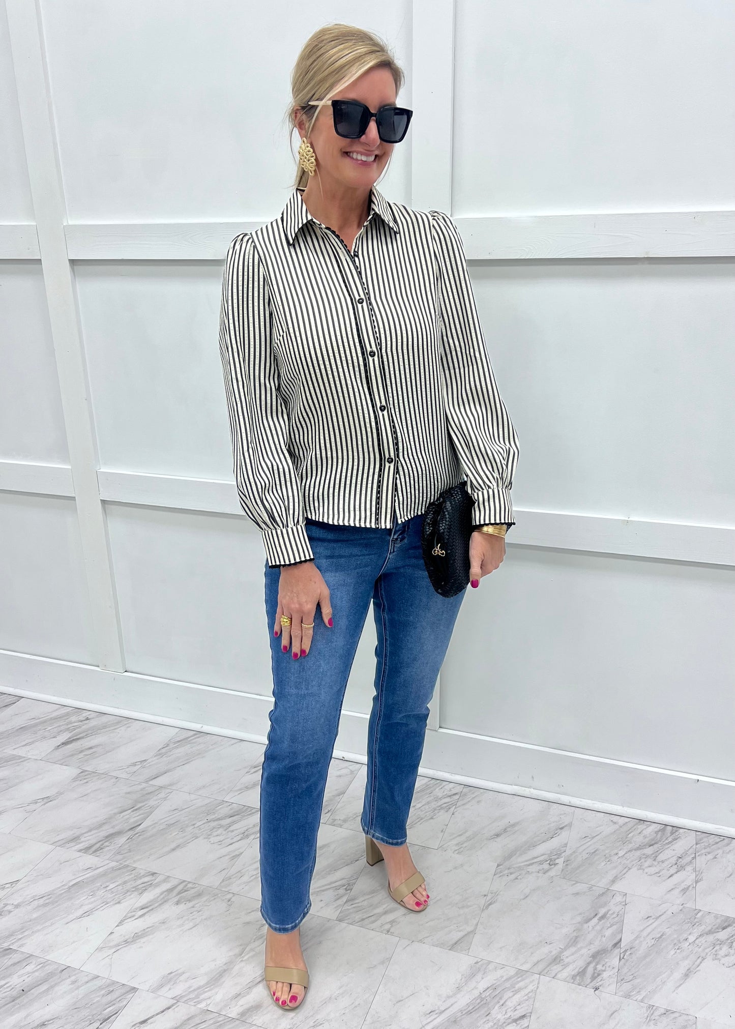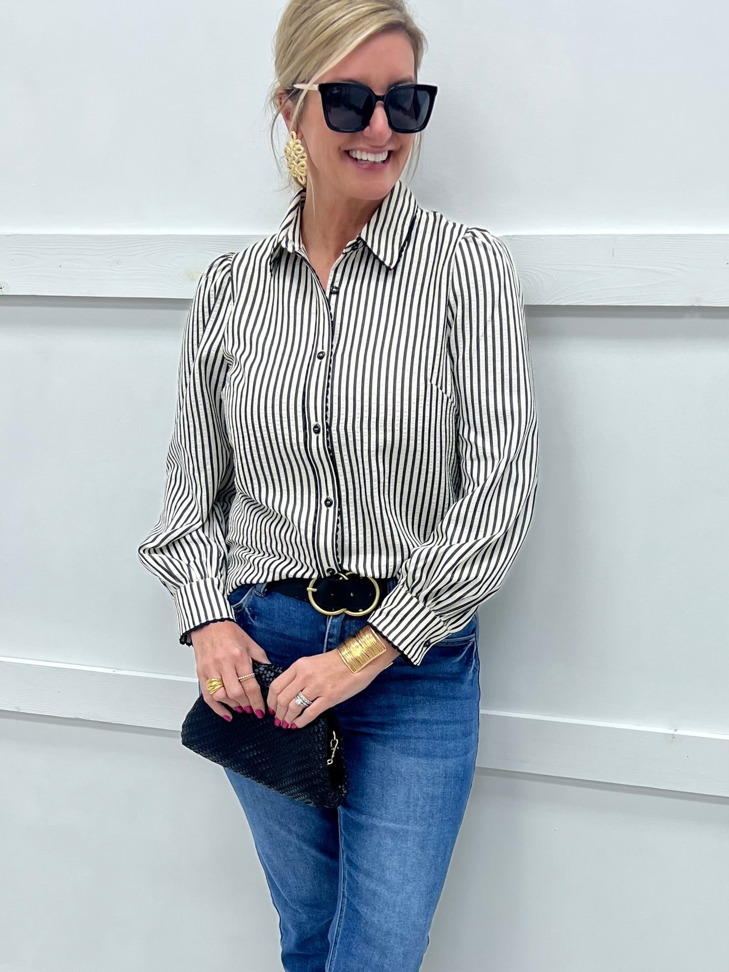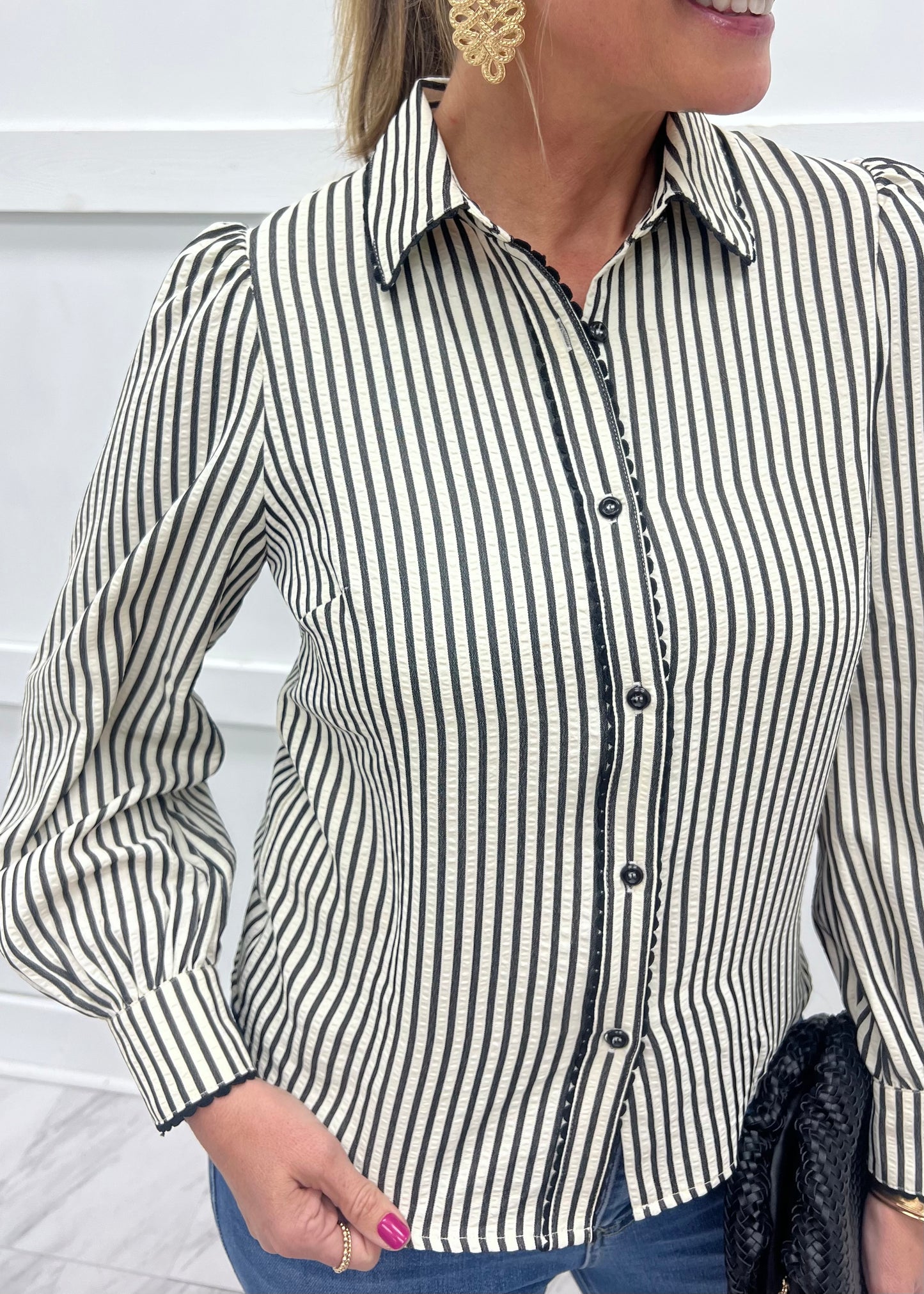 Darling little details, this little top is sure to bring a smile to your face! Black and off white seersucker striped woven fabric shapes this top with a collar neckline, button front closure and long sleeves that button at the wrists, black colored scallop detailing at the collar and down the front and on the wrists completes the look. This top is so easy to wear and looks great paired with trousers, skirts and white or dark denim. Model is 5'8'' and wearing a size small.