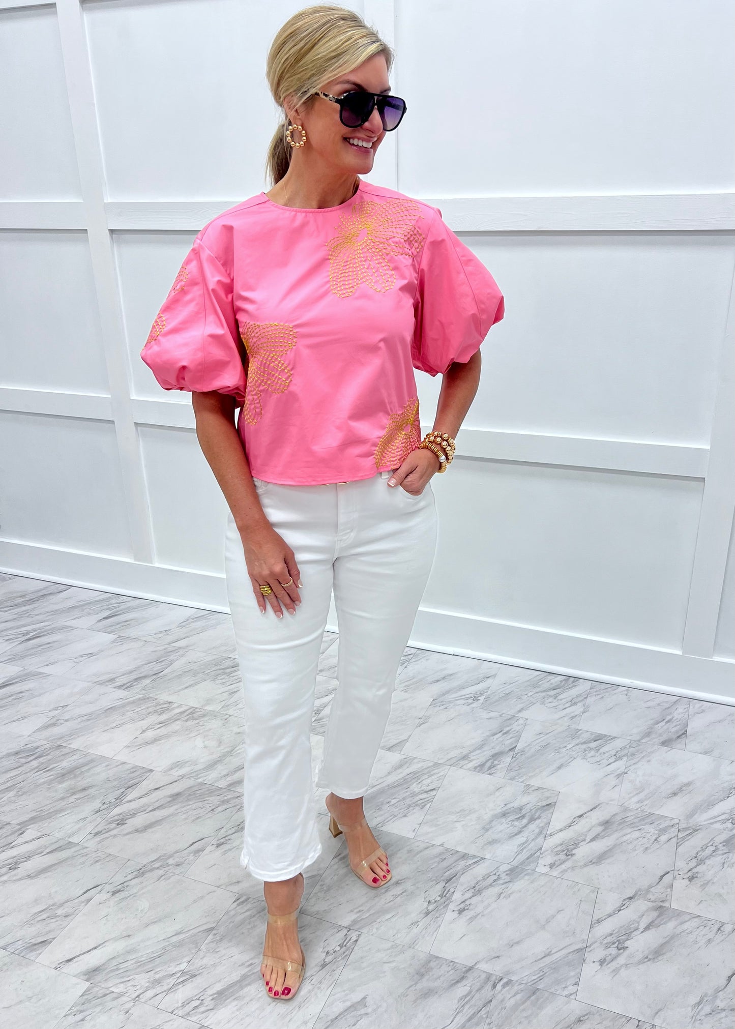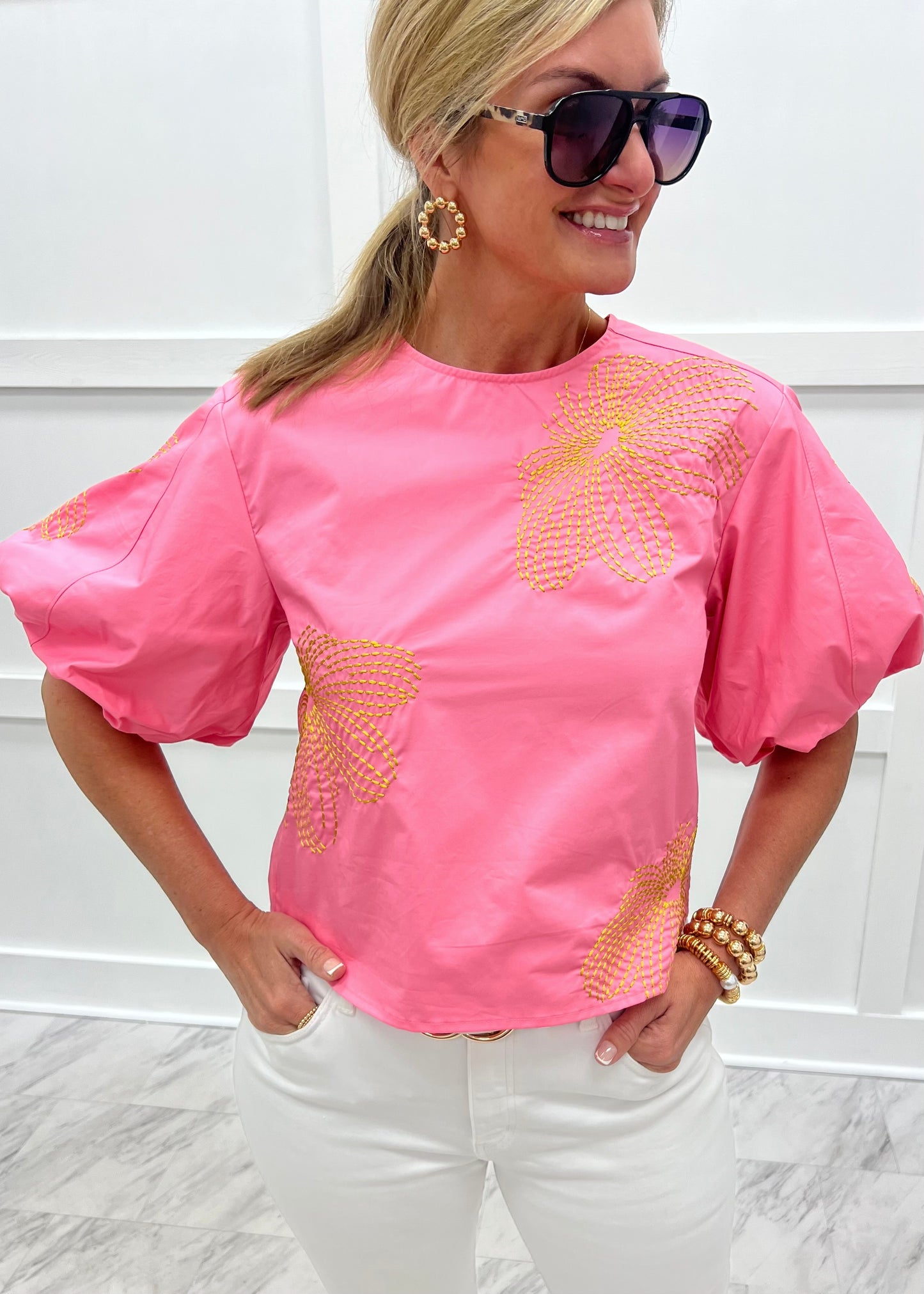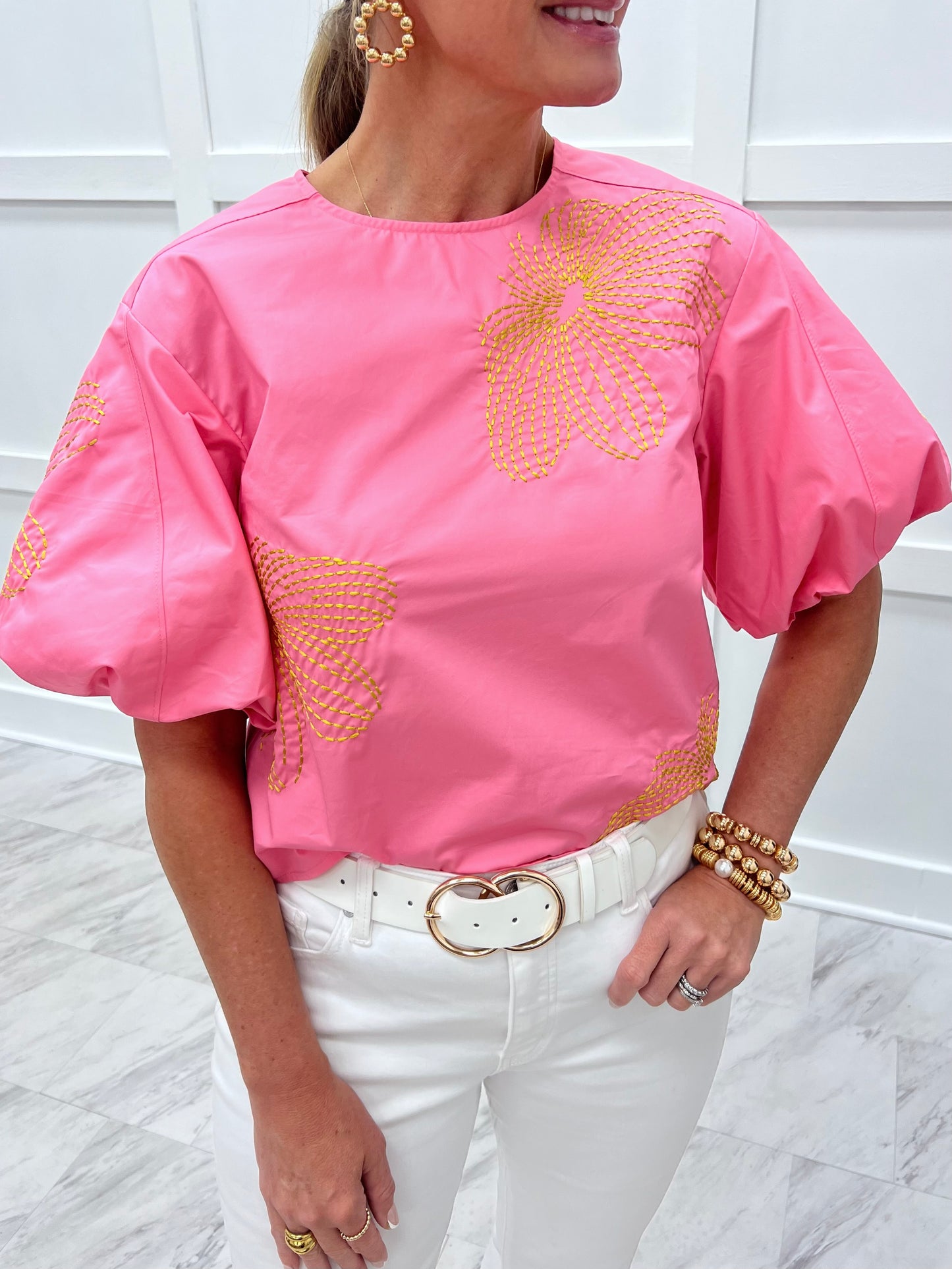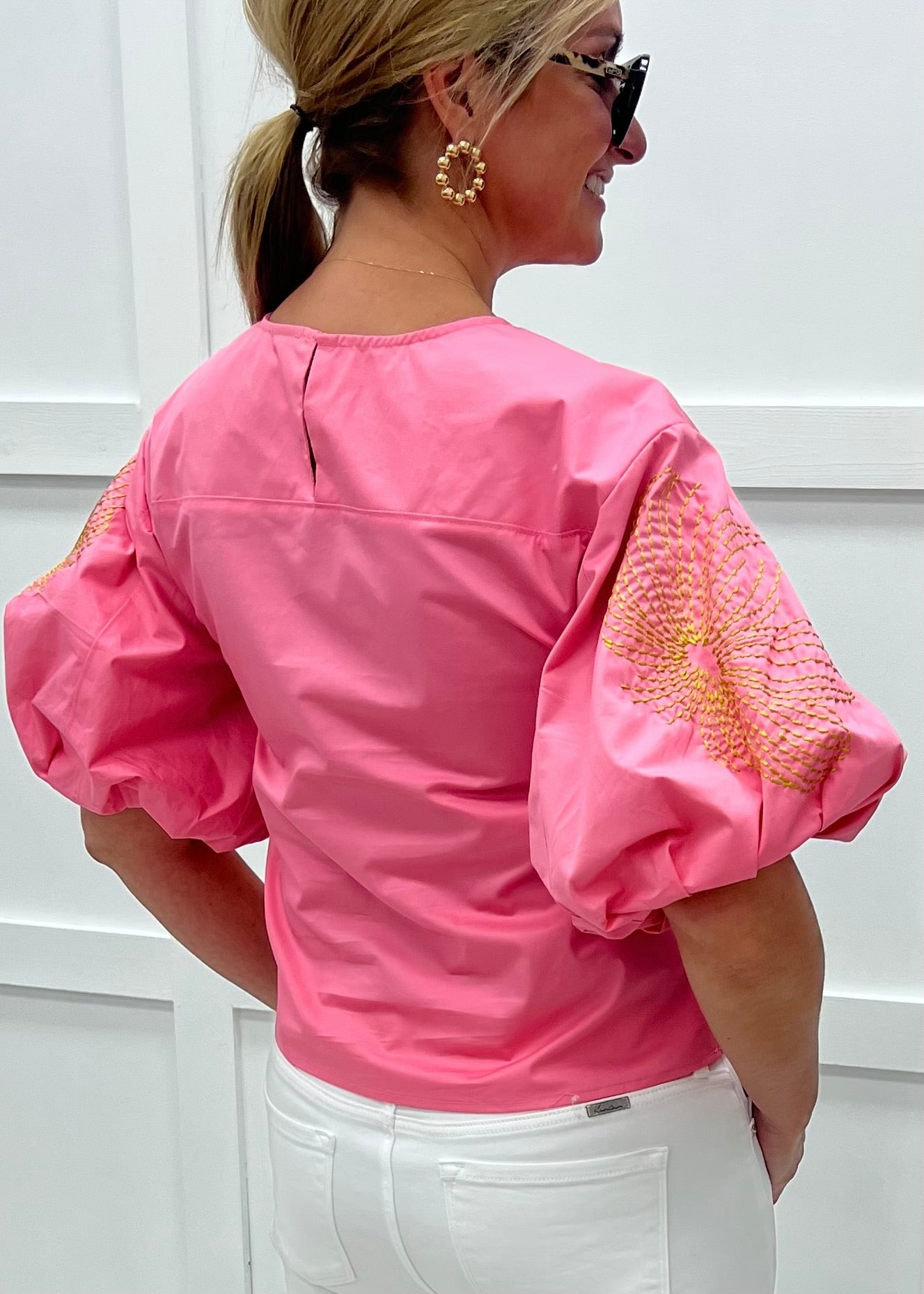 Lovely, luxe and extra stylish... fall in love with our Viver Pink Embroidered Top! Bubble gum pink colored woven fabric with large embroidered flowers in gold shapes this top featuring a round neckline, exaggerated puff sleeves and a relaxed fit that hits at the waistline. The back has a small keyhole + button closure at the neckline. Pretty In pink has never looked so good! Model is 5'8" and wearing a size small.